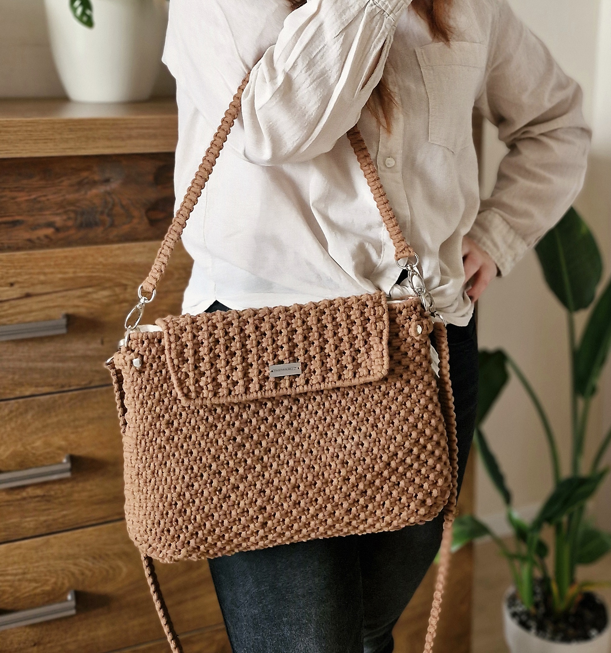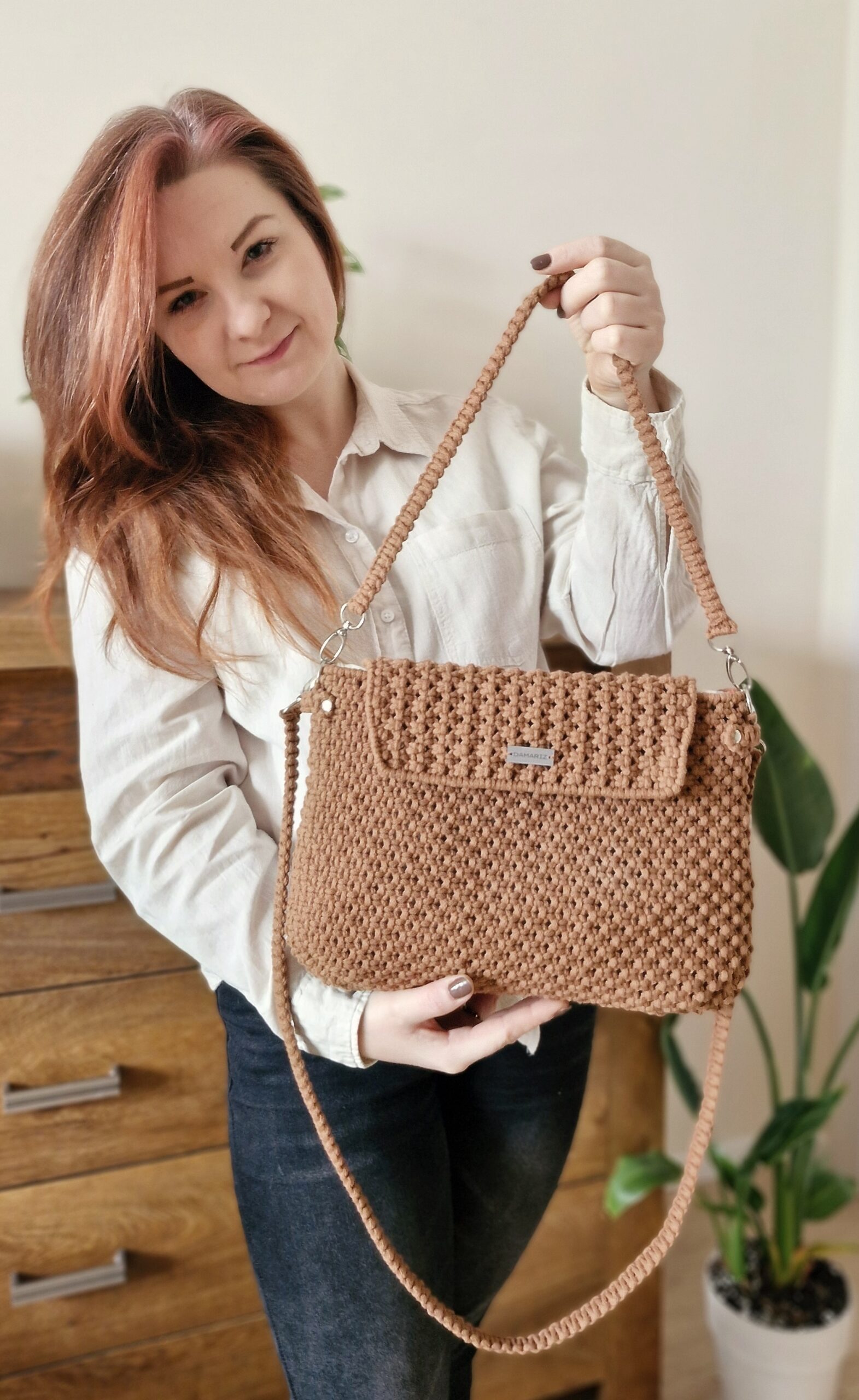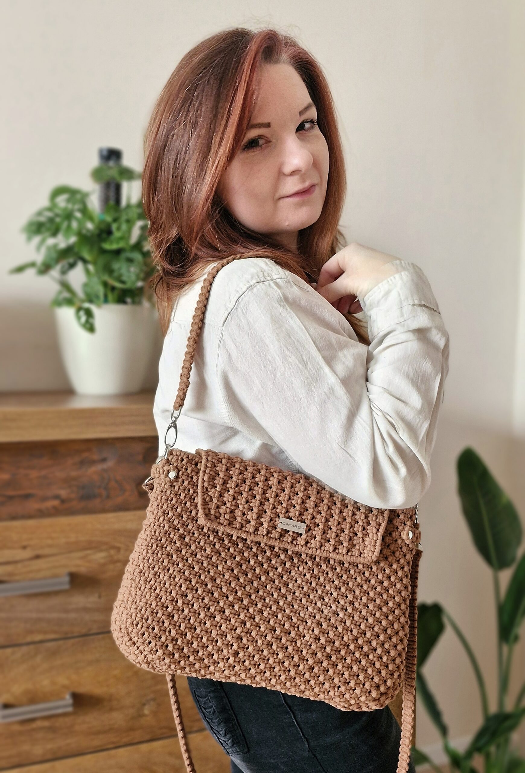 Casualowa torebka ze sznurka z klapką – karmelowa- od ręki