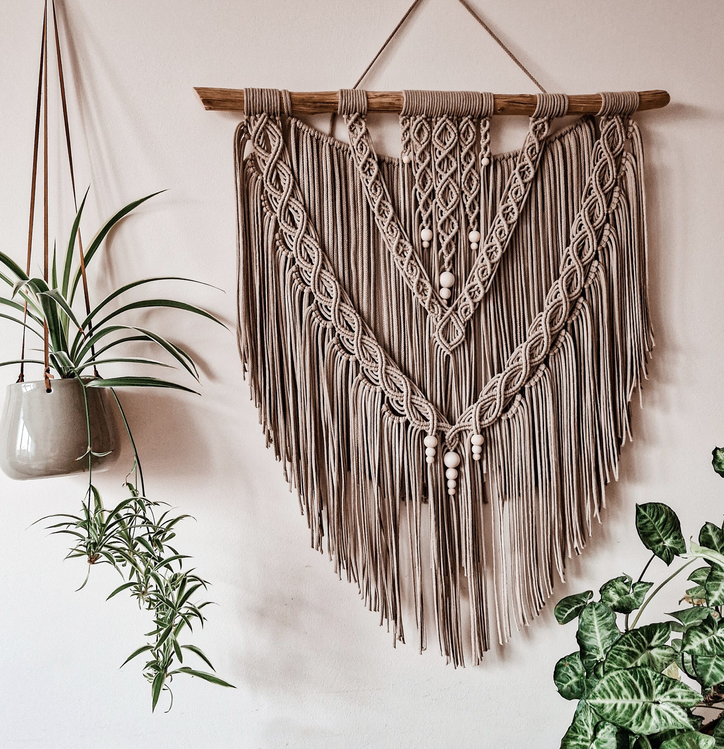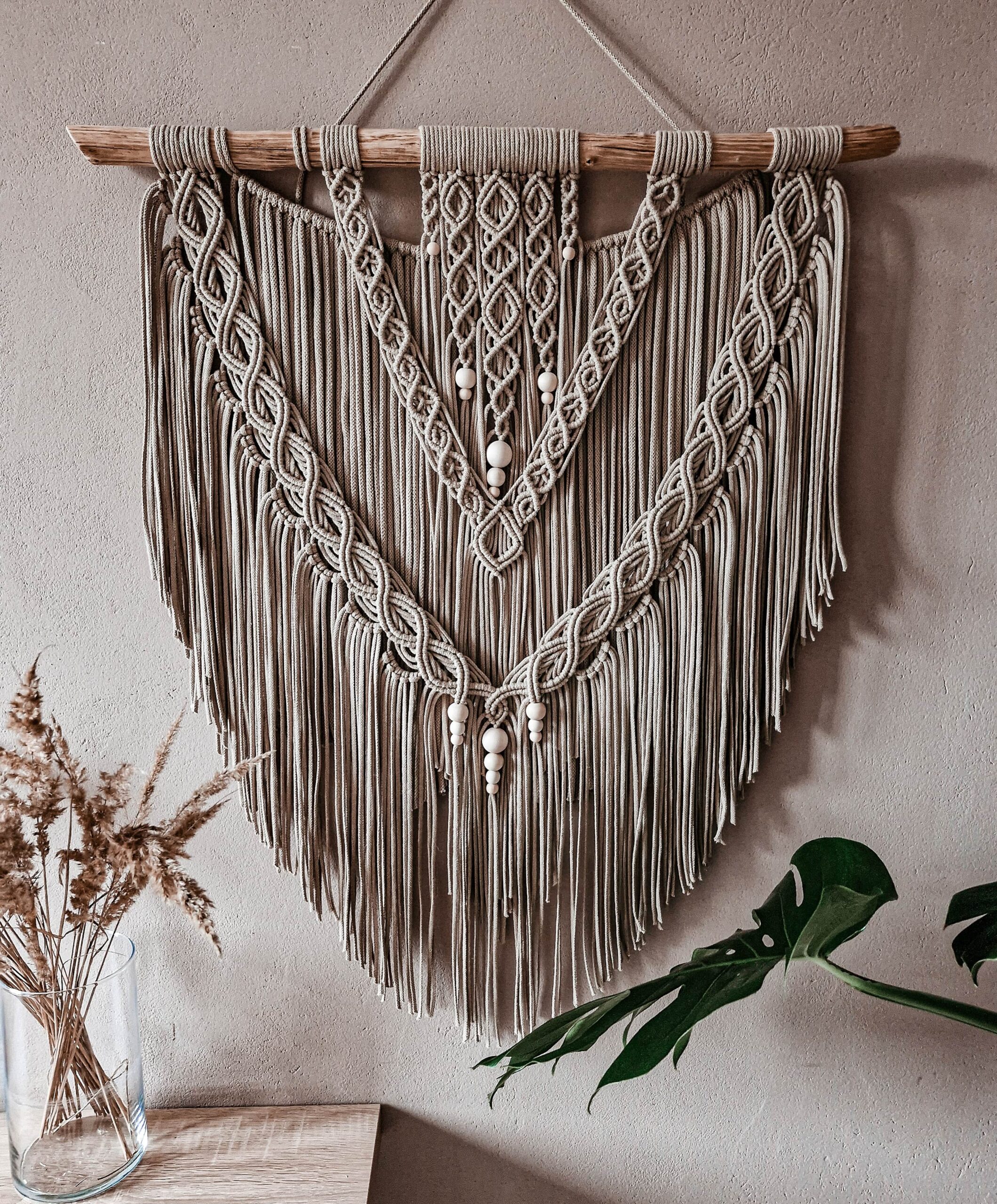 Duża makrama z koralami Sigrida – lniany beż