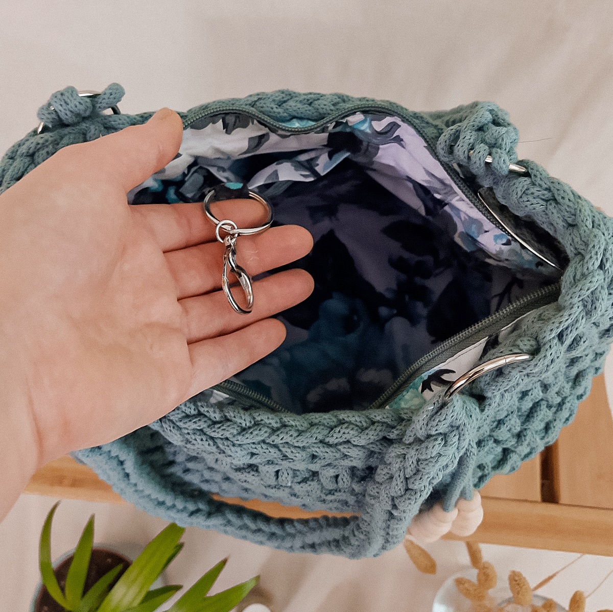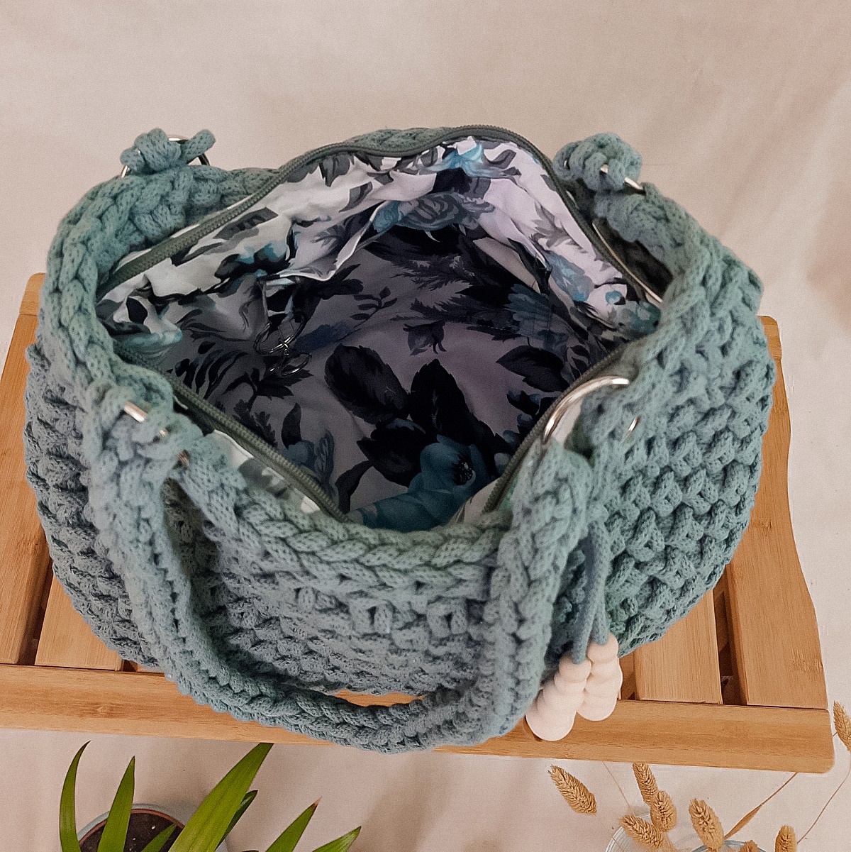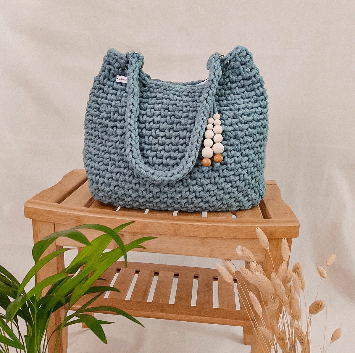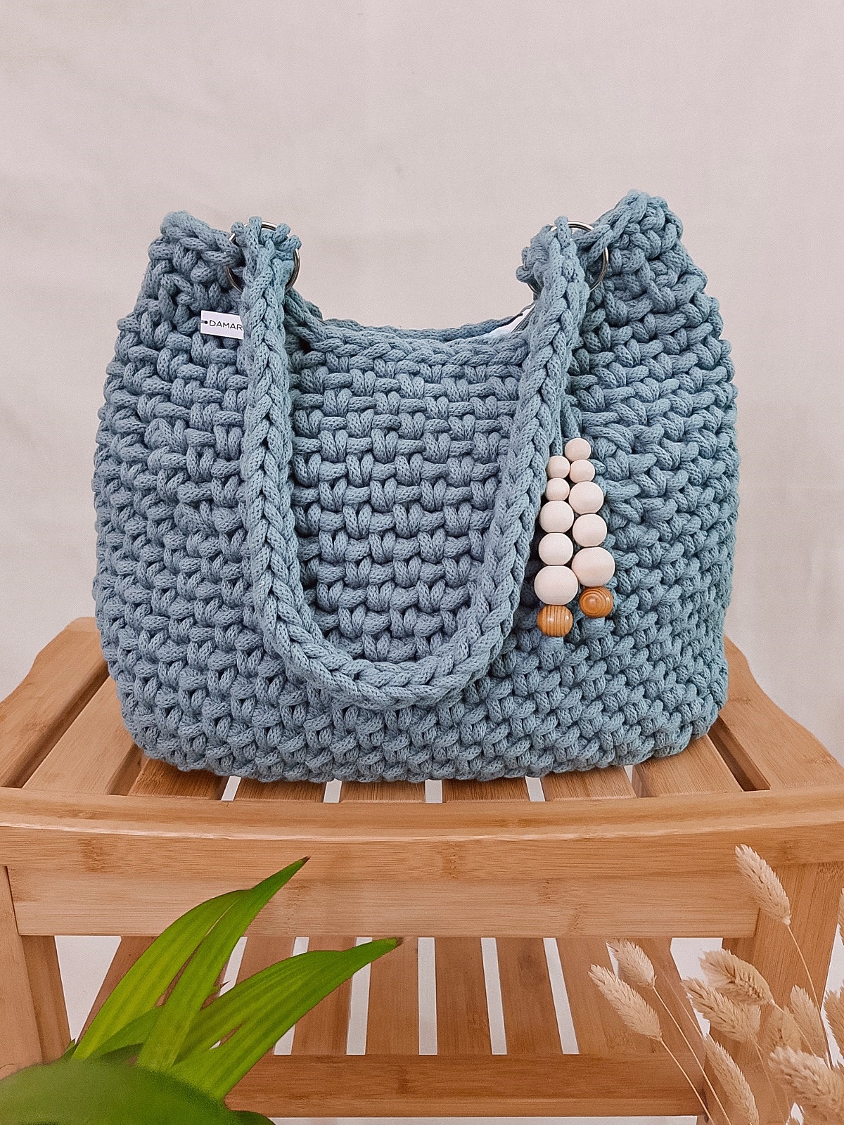 Belly bag to obecnie największa torba jaką znajdziesz w ofercie Damariz. Stworzyłam ją dla pań, które lubią czuć się gotowe na każdą niespodziankę – zmieścisz w niej naprawdę wszystko. Torba mieści średniej wielkości kocyk więc sprawdzi się również przy spacerach na plażę czy nad rzekę. Wykonałam ją w lekkim ściegu, przez co jej wagę zredukowałam maksymalnie, abyś mogła czuć się z nią swobodnie i komfortowo. Jej design komponuje się bardzo dobrze ze stylem casualowym. Dopełnieniem jej stylu są dekoracyjne korale.