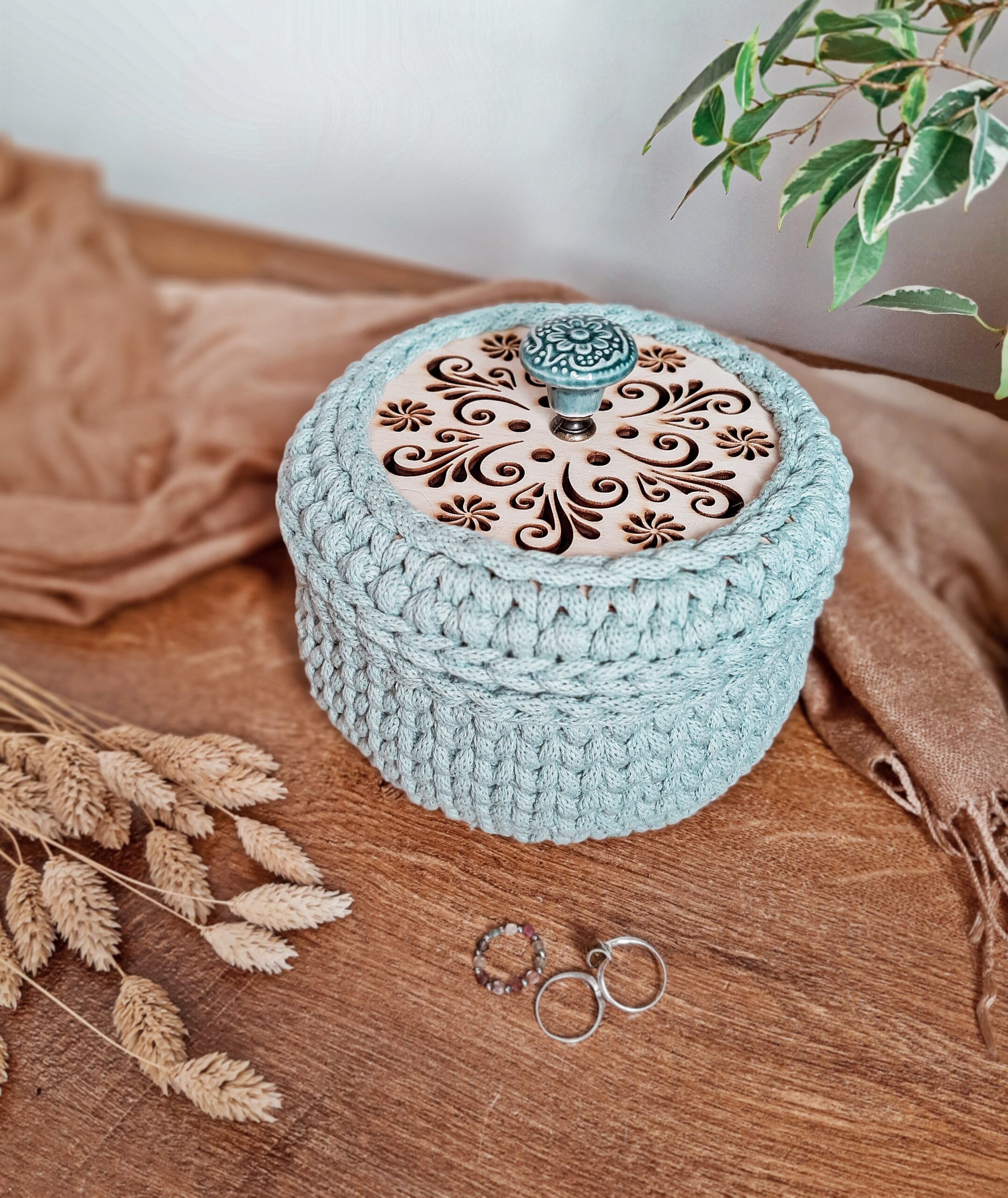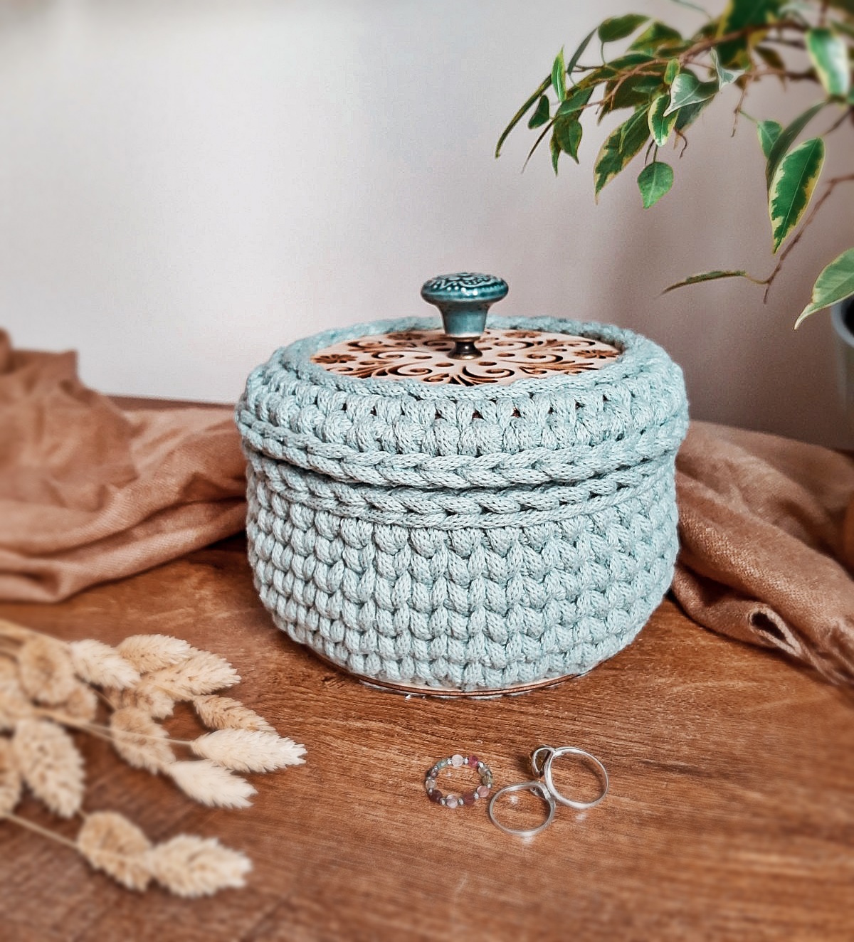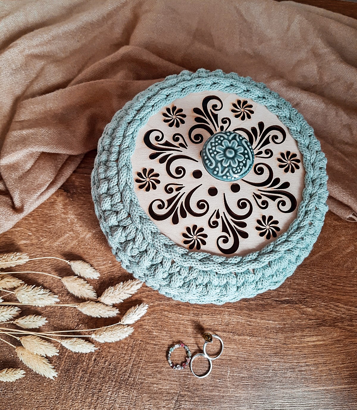 Elegancki koszyczek – szkatułka na biżuterię, puzderko wykonane ręcznie ze sznurka bawełnianego to świetny pomysł na uporządkowanie swojej przestrzeni dodając jej jednocześnie ciepła. Ten koszyczek, poza tym, że jest praktyczny, to świetnie sprawdzi się również jako element dekoracyjny w garderobie, sypialni czy łazience. Połączenie szałwiowego odcienia sznurka, dobranej pod kolor gałki oraz naturalnej barwy drewnianej bazy wpisuje się świetnie do wnętrz w stylu skandynawskim oraz boho.