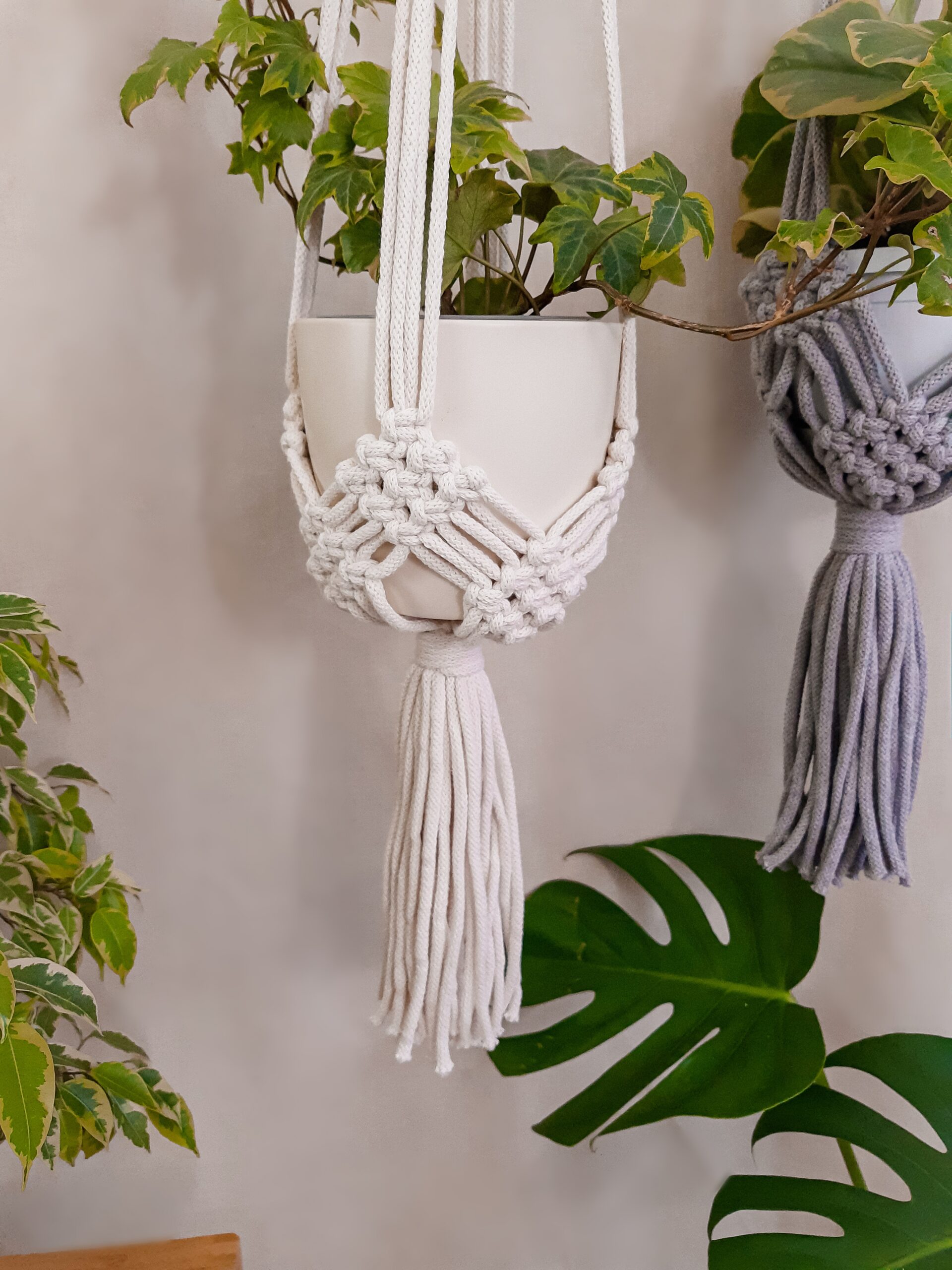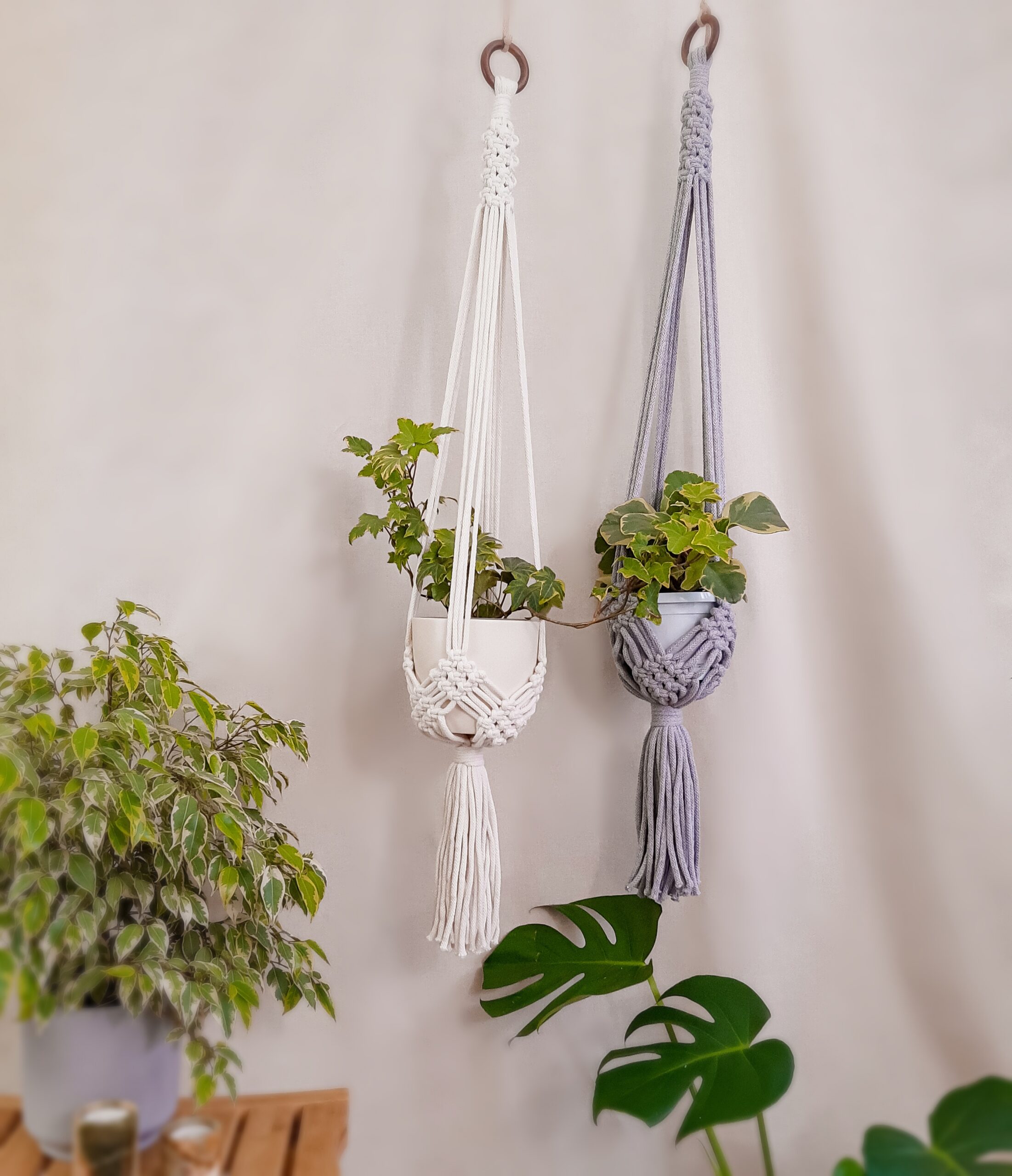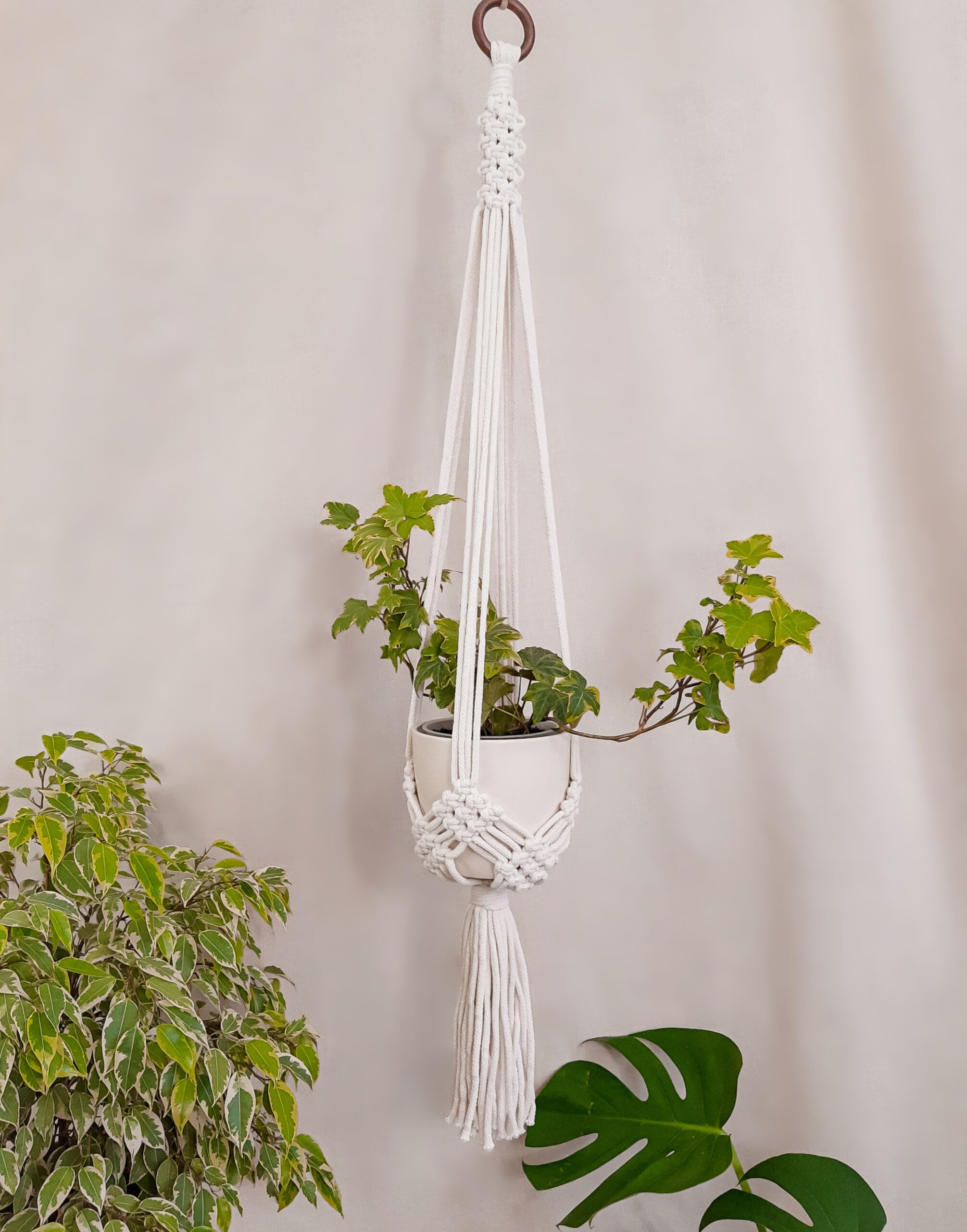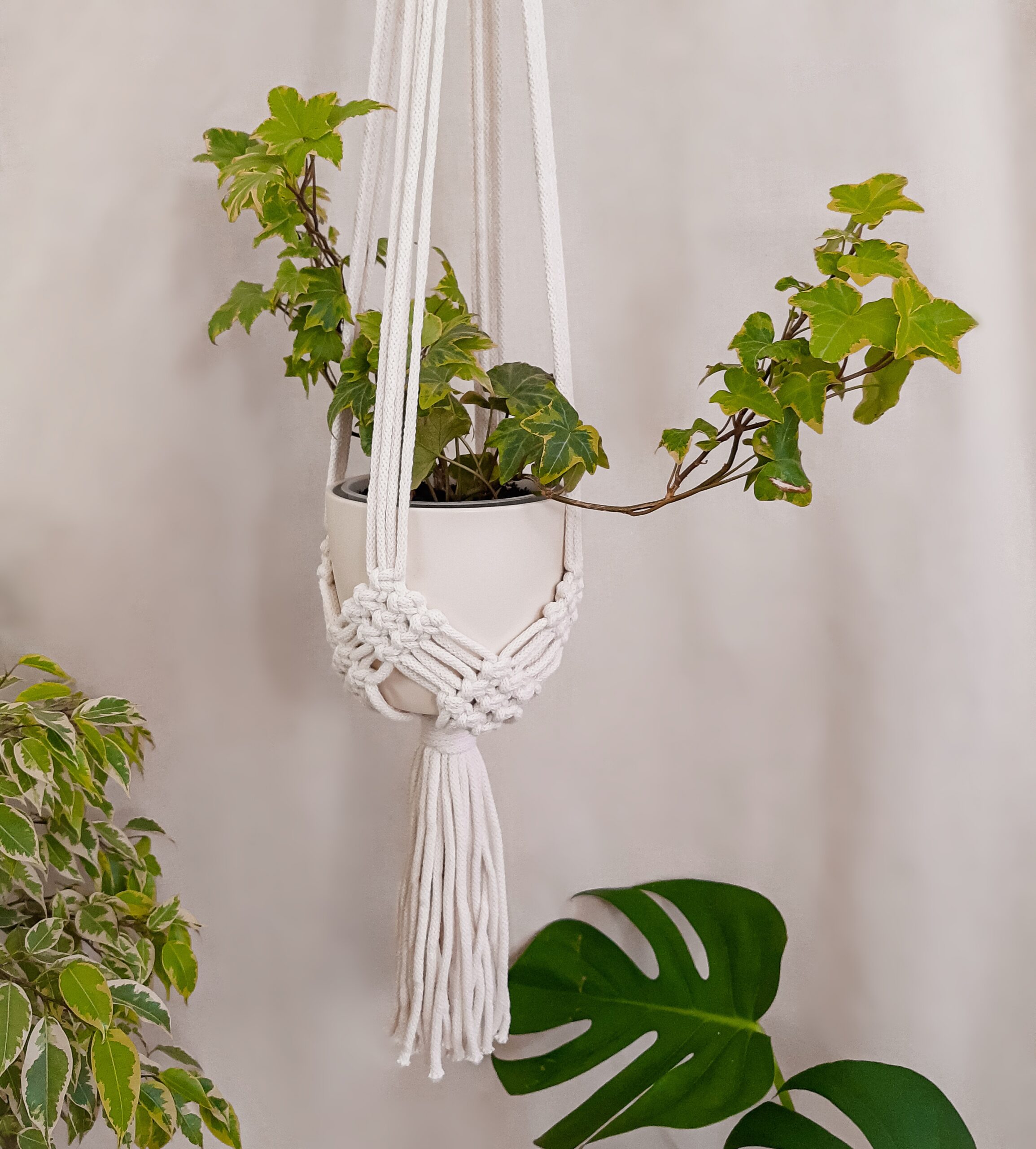 Wiszący kwietnik pleciony metodą makramy to praktyczny dodatek dla osób kochających otaczać się zielenią. Pozwoli Ci zwolnić zbyt zatłoczony parapet a także nada wyjątkowego klimatu Twojemu wnętrzu. Sprawdzi się również na tarasie bądź w oranżerii. Świetnie wpisuje się w styl skandynawski oraz w styl boho. Jeśli jesteś szczęśliwym właścicielem domowej dżungli – to idealne rozwiązanie dla Ciebie. Skromny, elegancki wzór łatwo dopasujesz do pozostałych dodatków w Twoim domu.