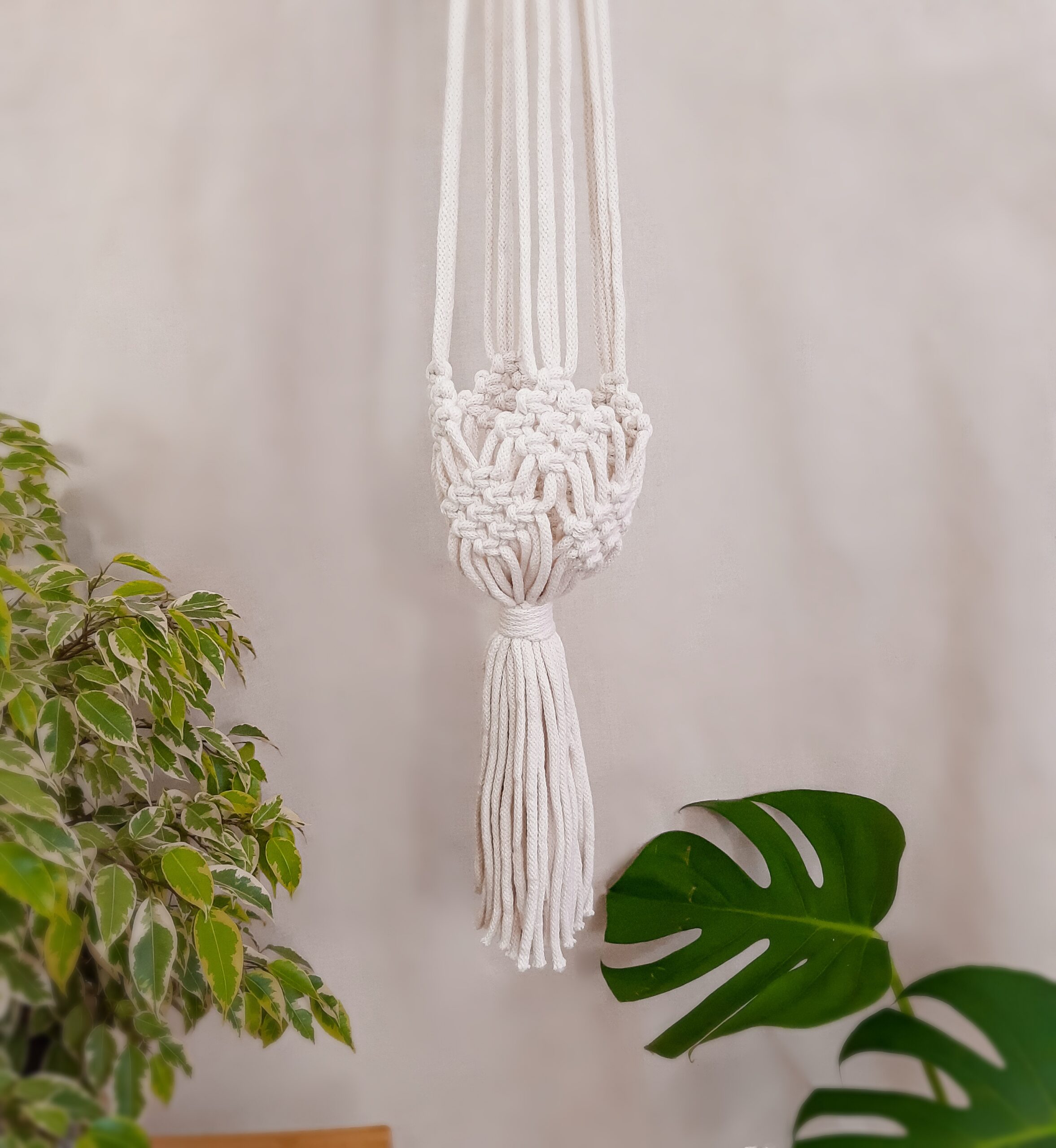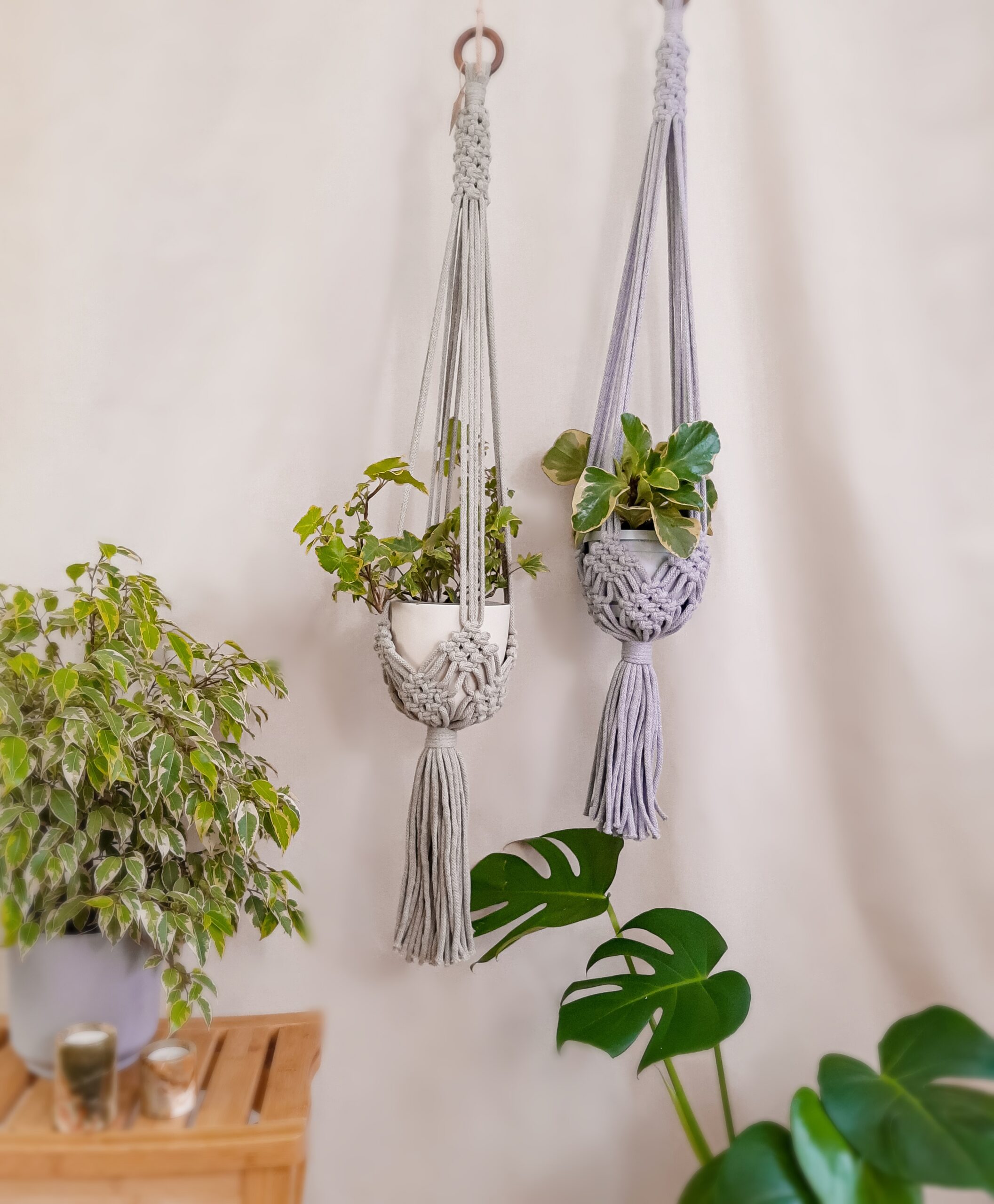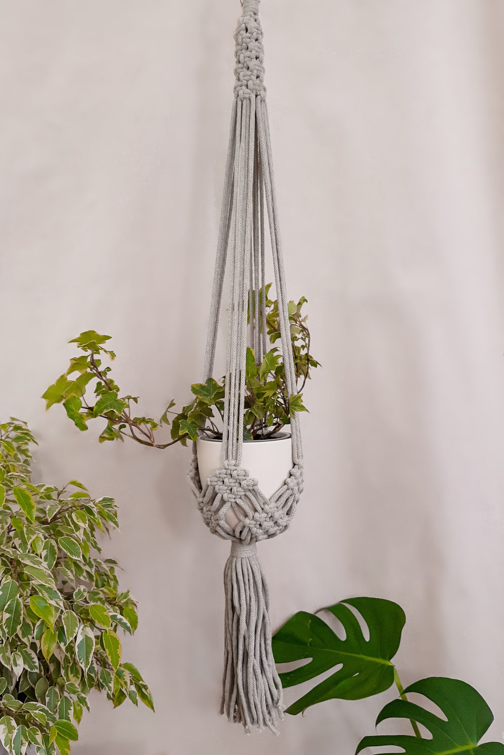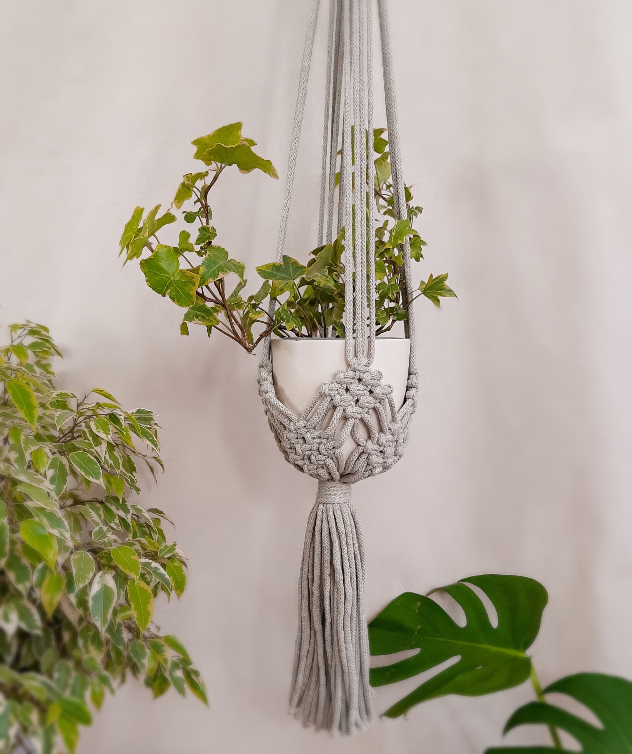 Wiszący kwietnik pleciony metodą makramy to praktyczny dodatek dla osób kochających otaczać się zielenią. Pozwoli Ci zwolnić zbyt zatłoczony parapet a także nada wyjątkowego klimatu Twojemu wnętrzu. Sprawdzi się również na tarasie bądź w oranżerii. Świetnie wpisuje się w styl skandynawski oraz w styl boho. Jeśli jesteś szczęśliwym właścicielem domowej dżungli – to idealne rozwiązanie dla Ciebie. Skromny, elegancki wzór łatwo dopasujesz do pozostałych dodatków w Twoim domu.