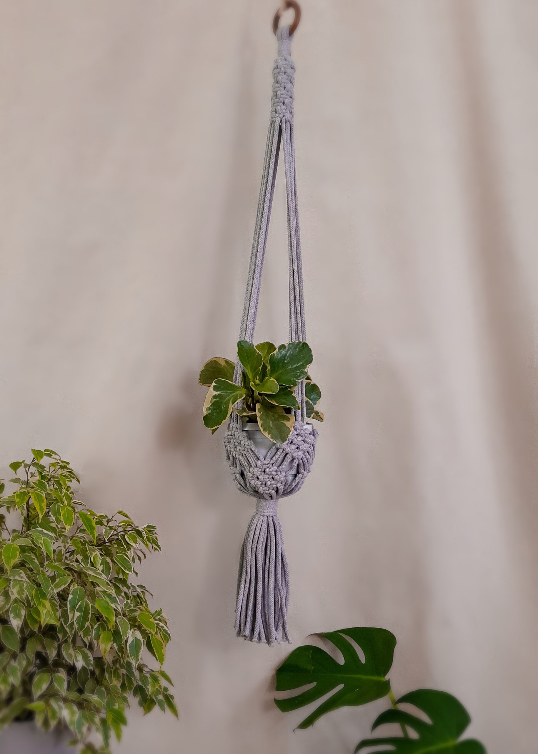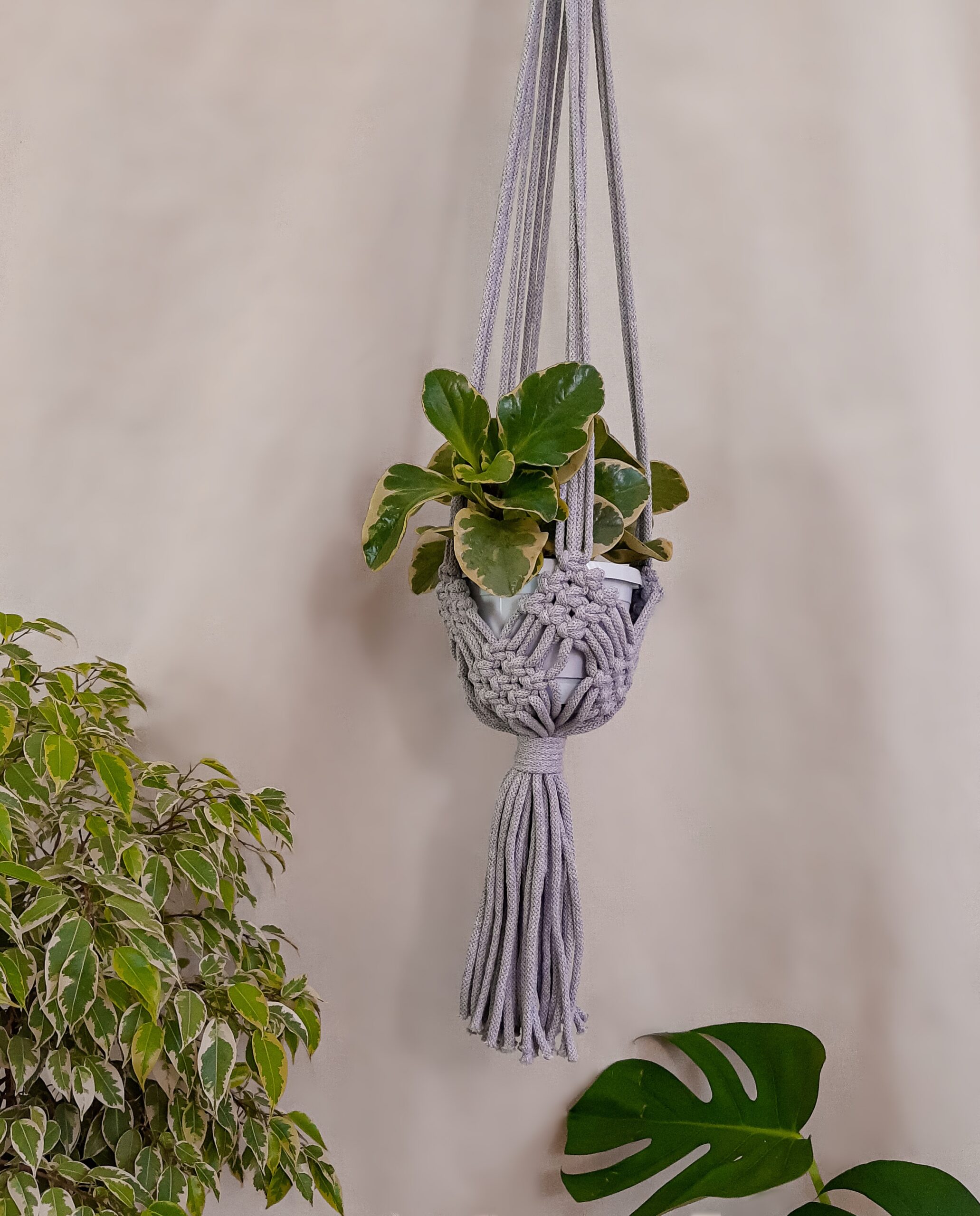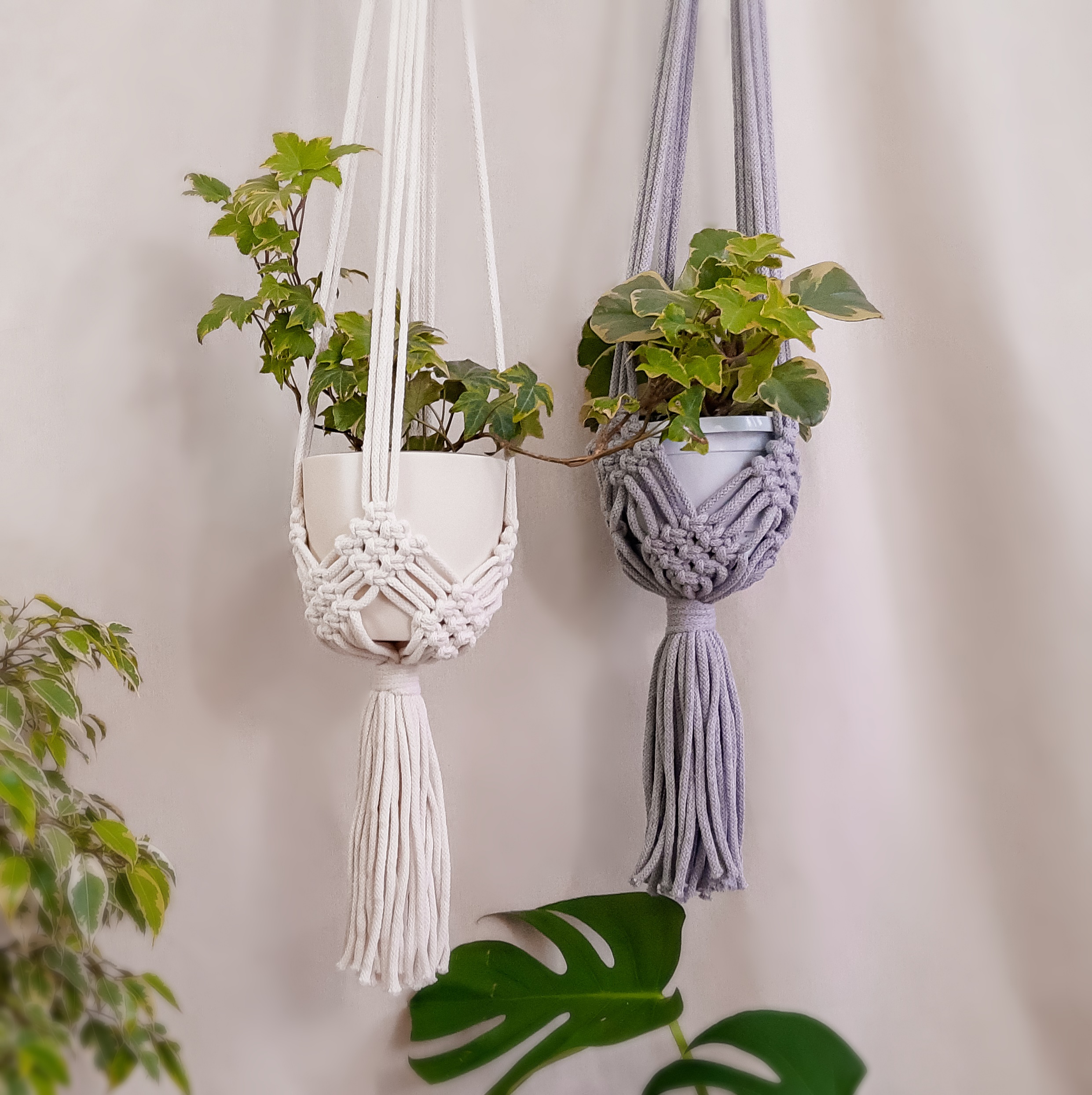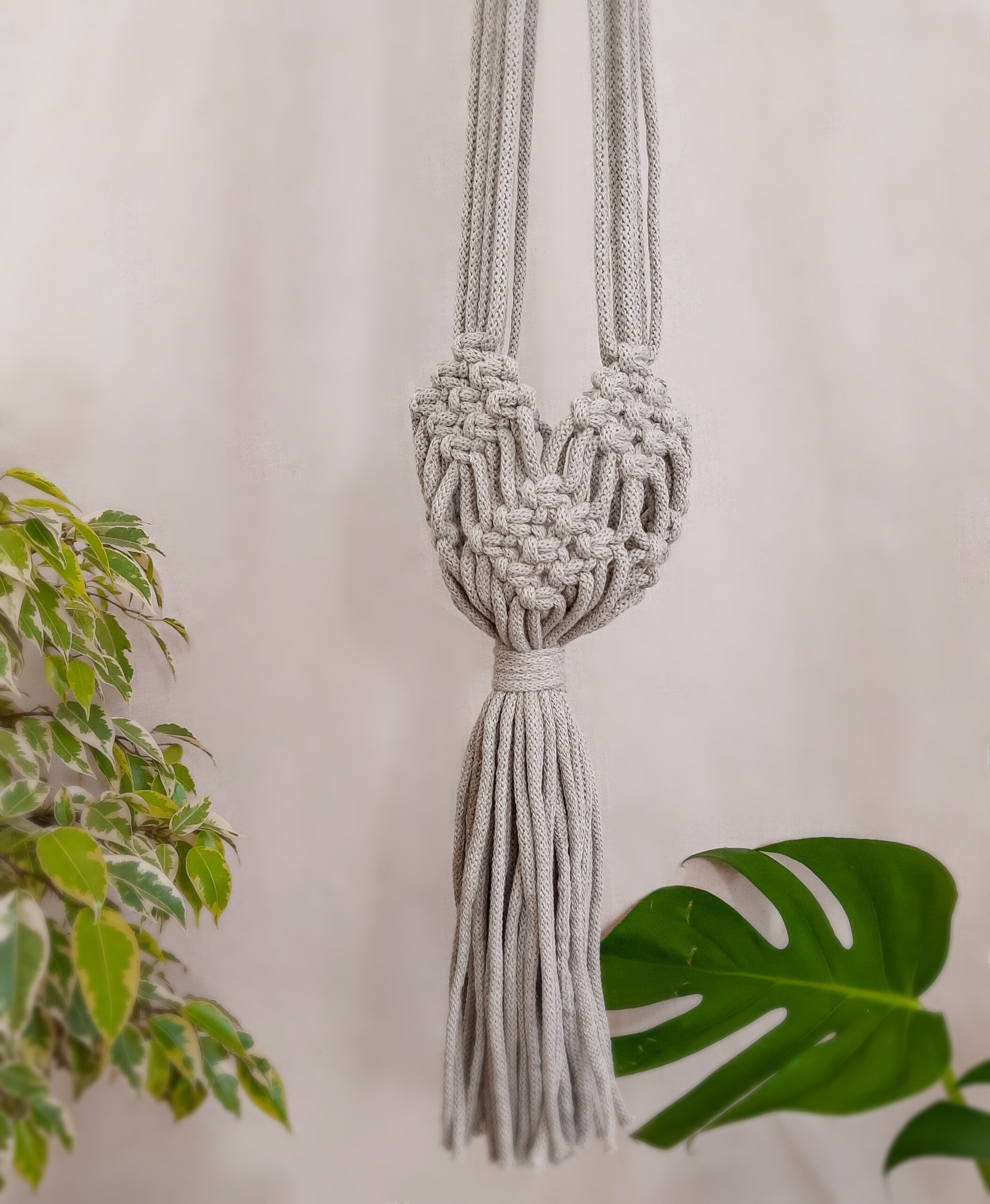 Wiszący kwietnik pleciony metodą makramy to praktyczny dodatek dla osób kochających otaczać się zielenią. Pozwoli Ci zwolnić zbyt zatłoczony parapet a także nada wyjątkowego klimatu Twojemu wnętrzu. Sprawdzi się również na tarasie bądź w oranżerii. Świetnie wpisuje się w styl skandynawski oraz w styl boho. Jeśli jesteś szczęśliwym właścicielem domowej dżungli – to idealne rozwiązanie dla Ciebie. Skromny, elegancki wzór łatwo dopasujesz do pozostałych dodatków w Twoim domu.