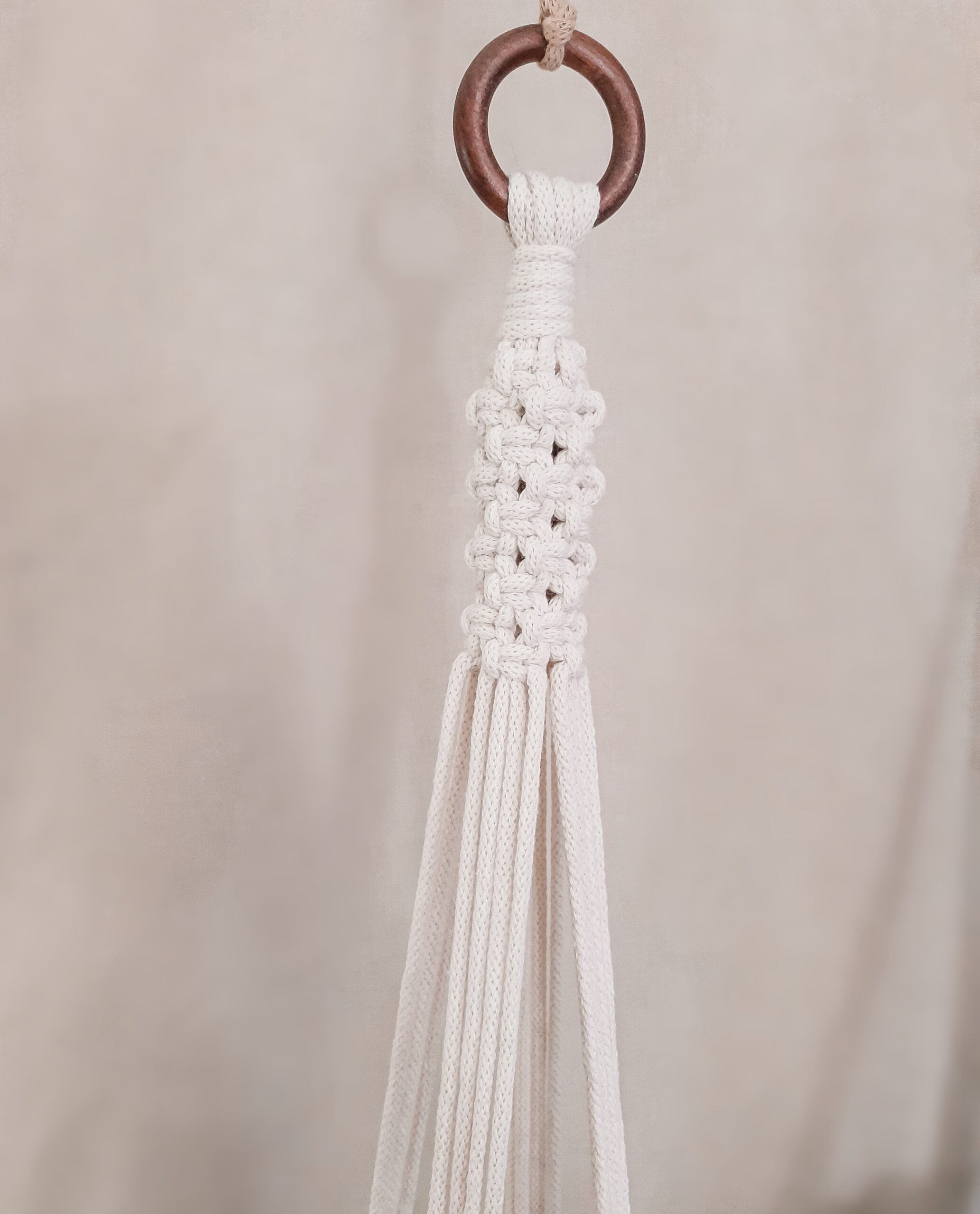 Wyplotłam go dla Ciebie z solidnego sznurka bawełnianego 5 mm wysokiej jakości. Zawieszka wykonana z drewnianego kółka sosnowego w naturalnym kolorze drewna.