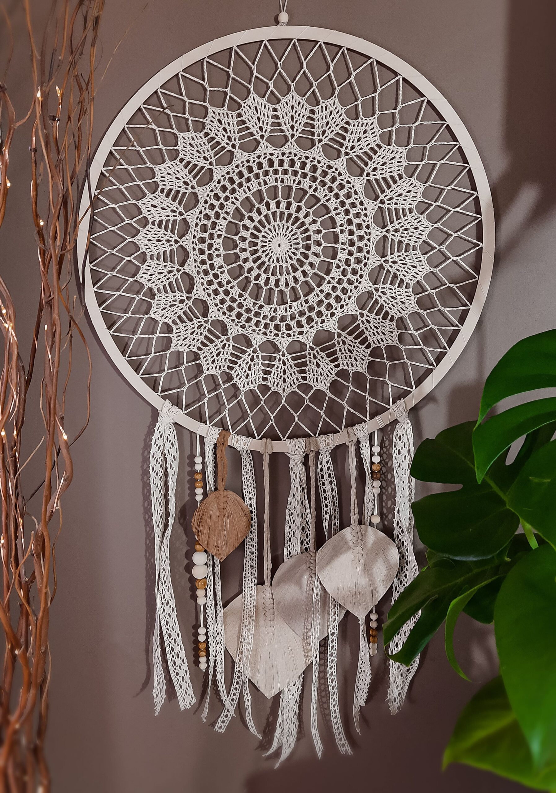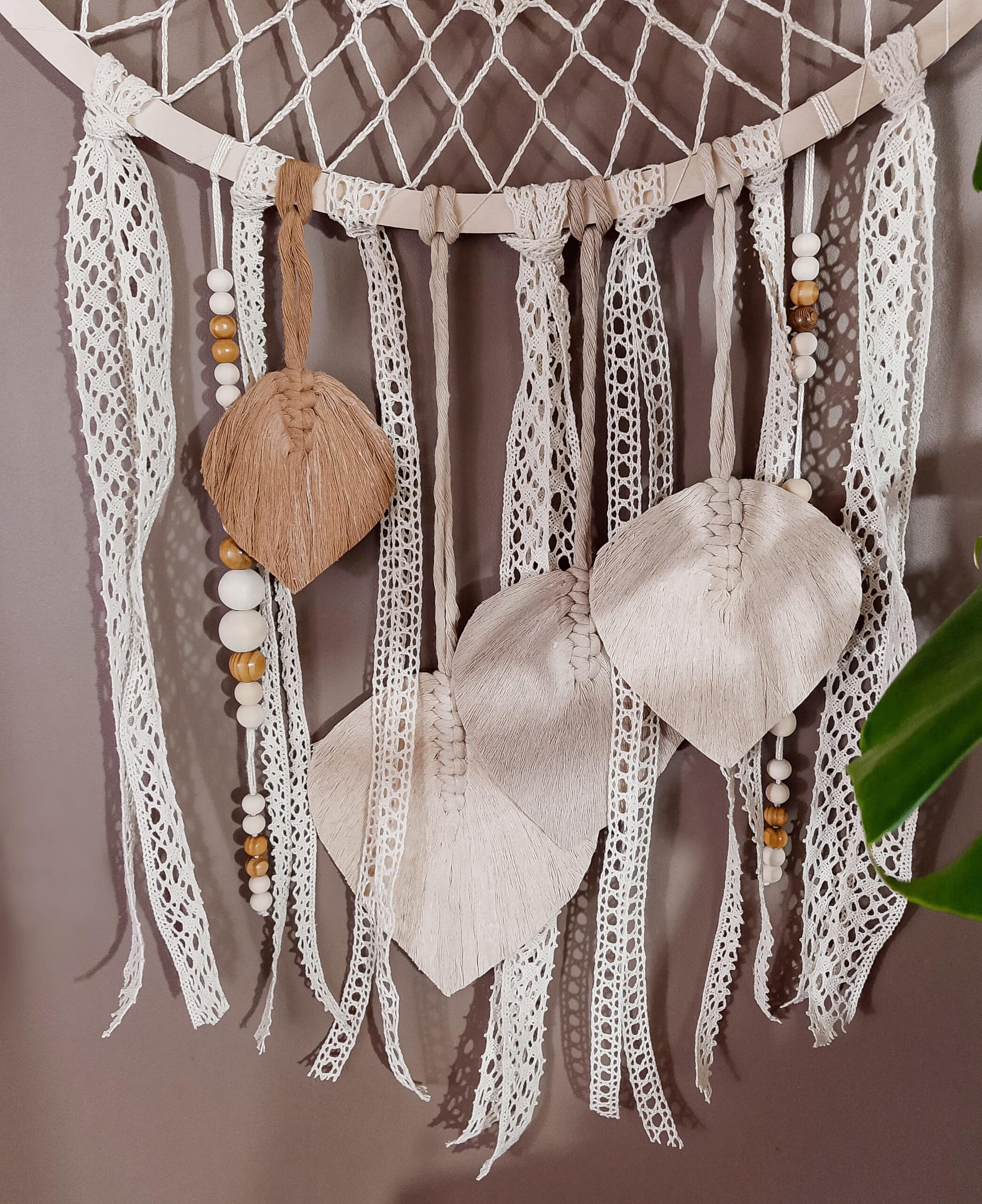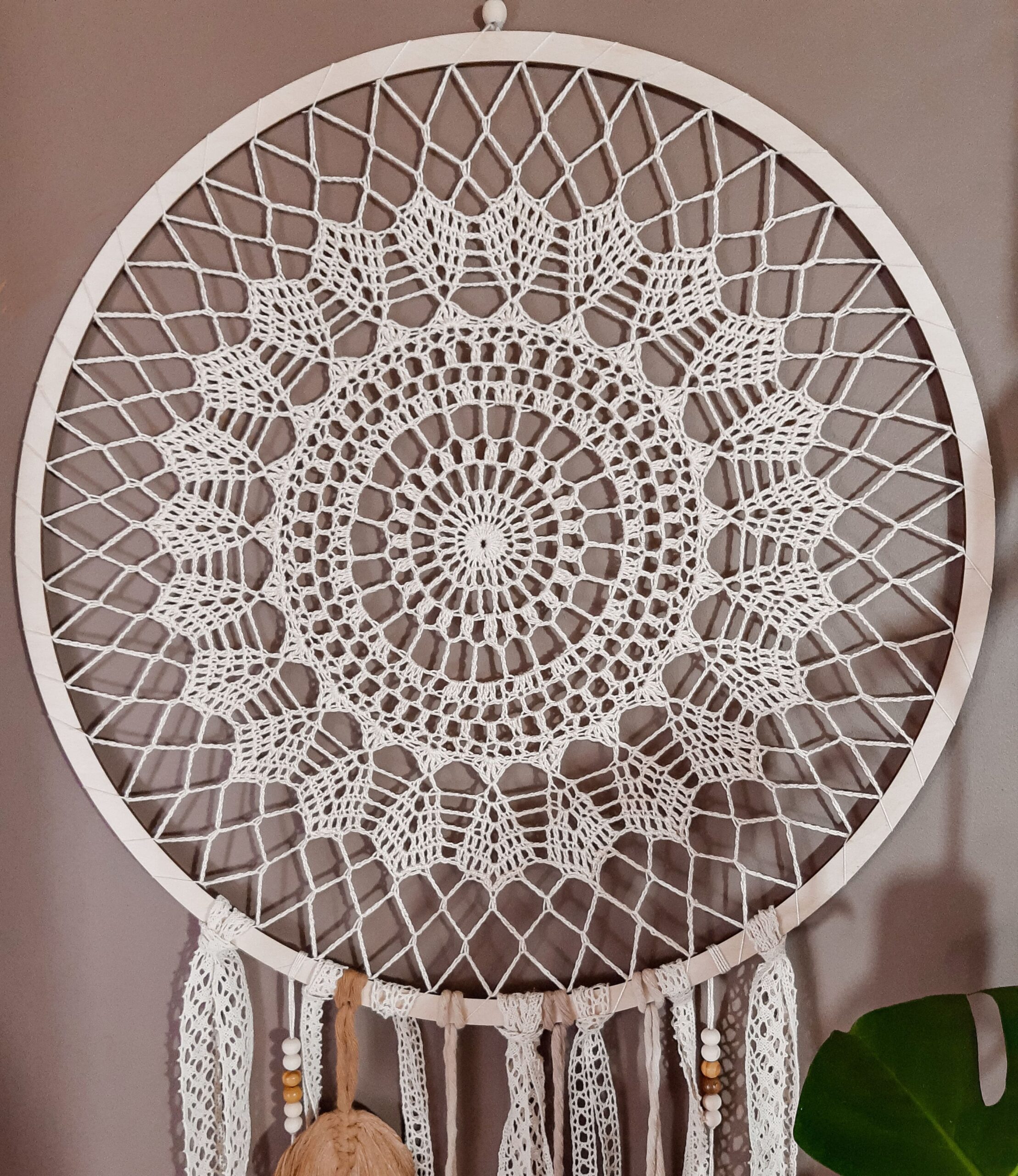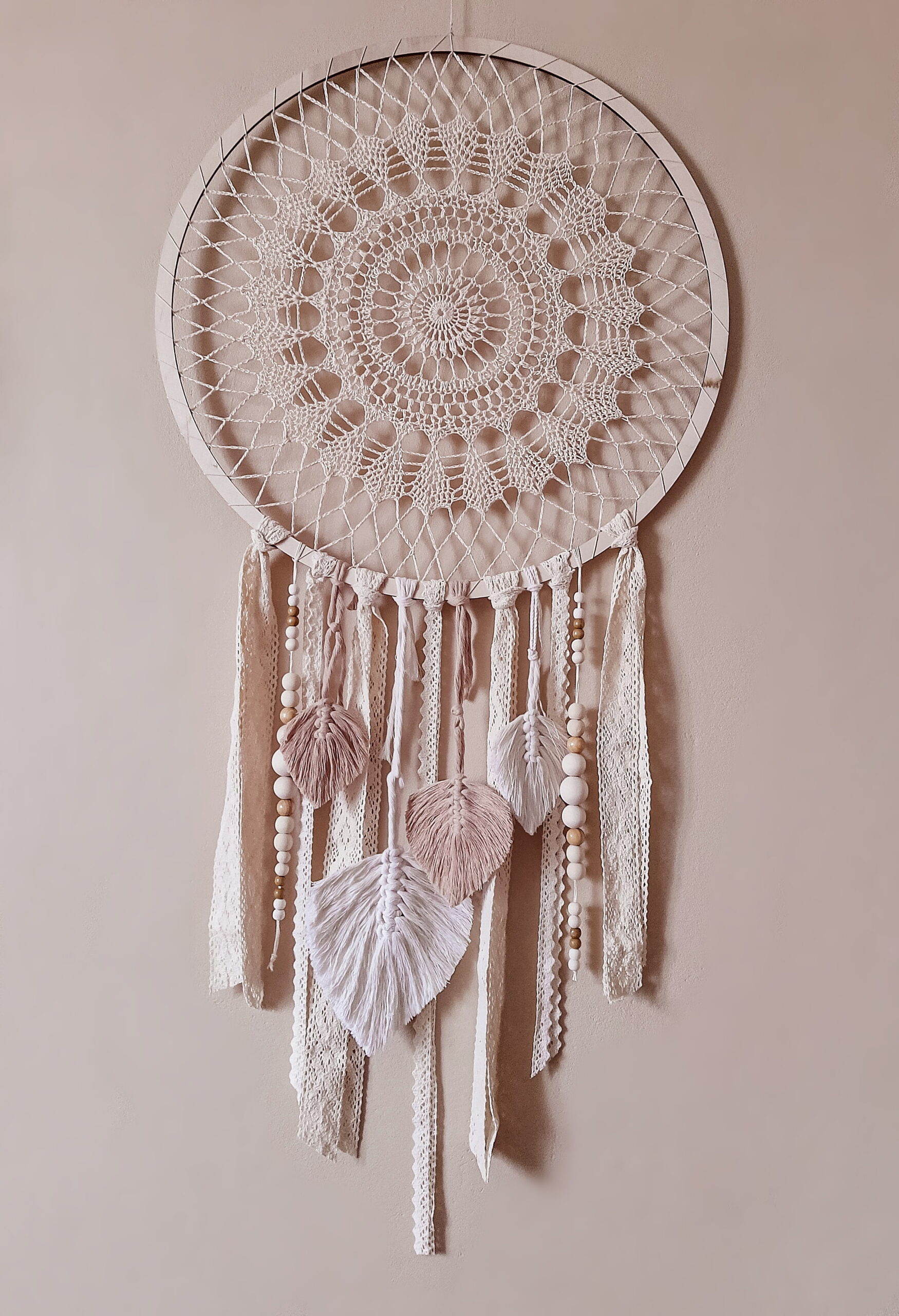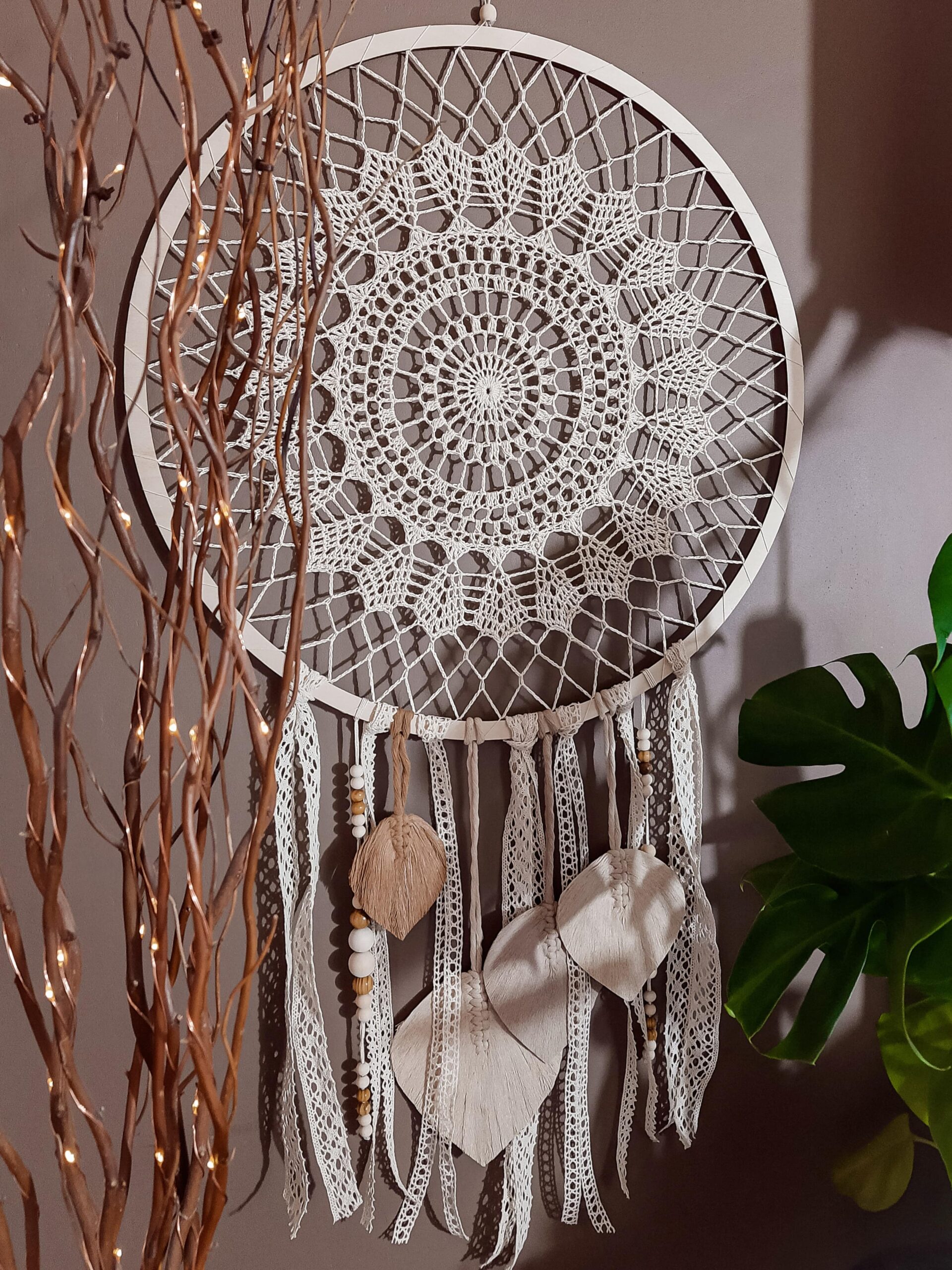 Delikatny łapacz snów w stylu boho to piękna dekoracja, która świetnie dopełni wystrój Twojej sypialni. Nadałam mu wyjątkowego klimatu dekorując drewnianymi koralami, piórami z czesanej bawełny oraz bawełnianymi, koronkowymi tasiemkami. Ażurowe centrum łapacza wykonałam z bawełnianego kordonka o kremowym odcieniu i naciągnęłam na drewnianą obręcz. Całość świetnie wpisuje się zarówno w styl skandynawski jak i boho.