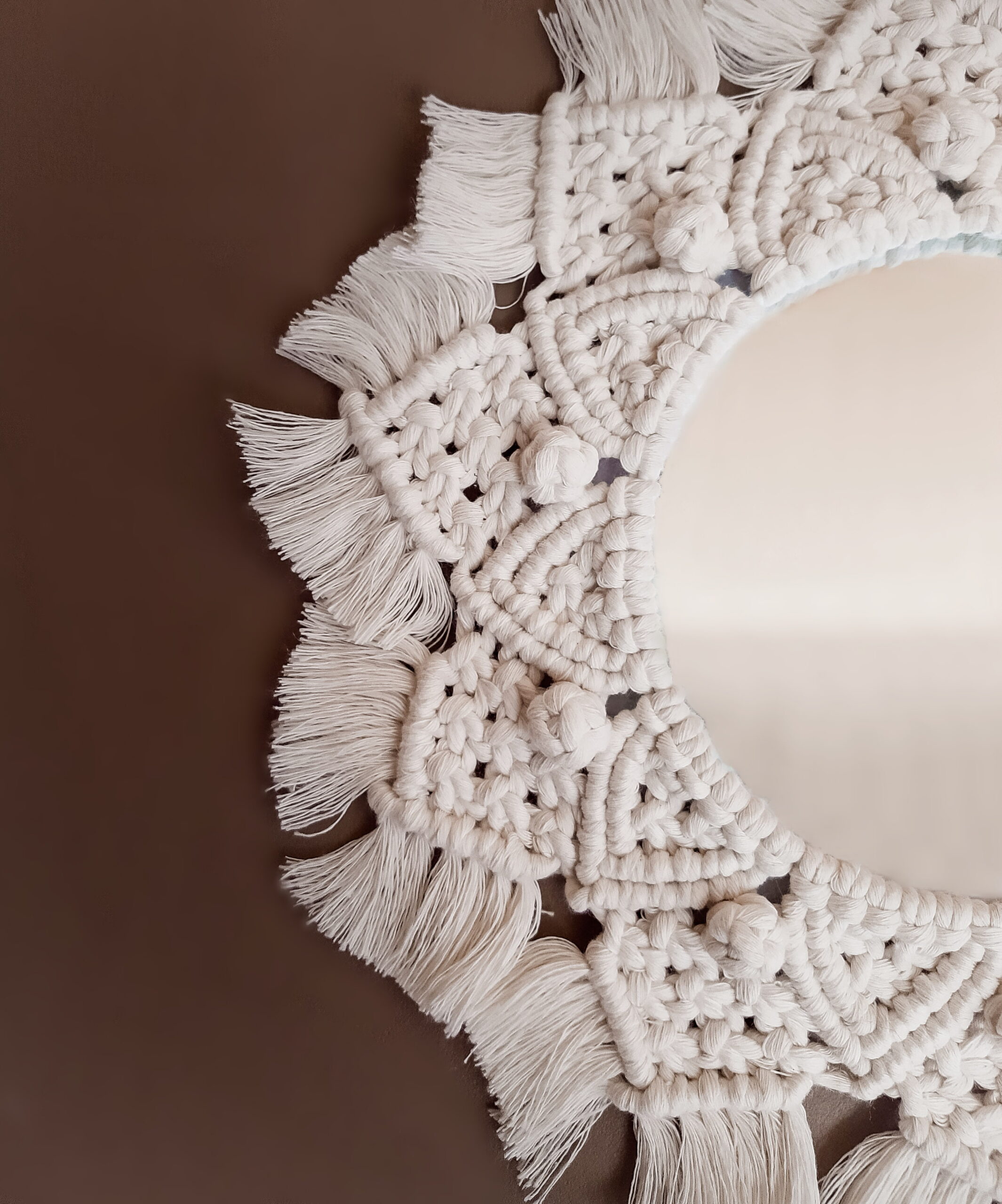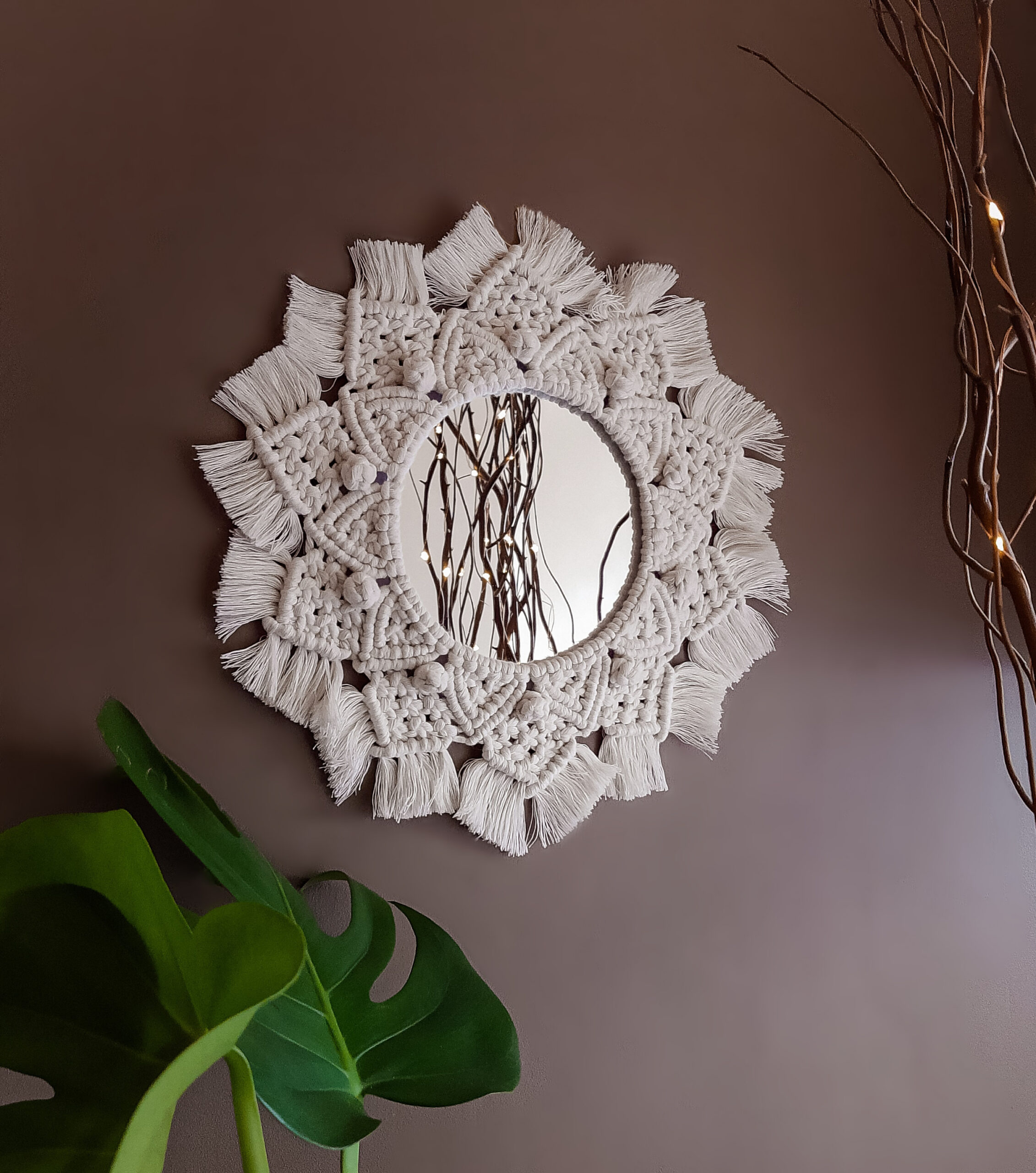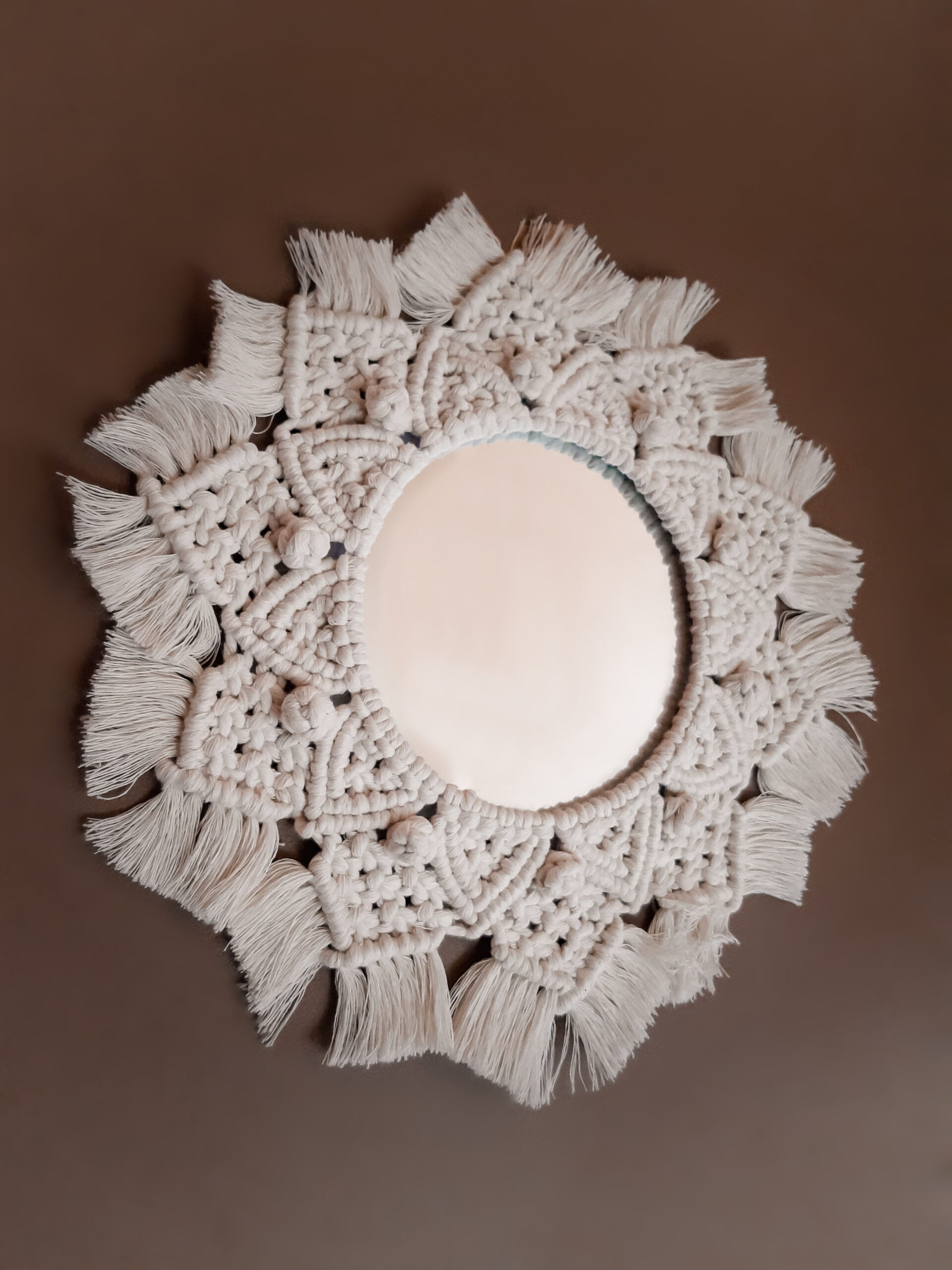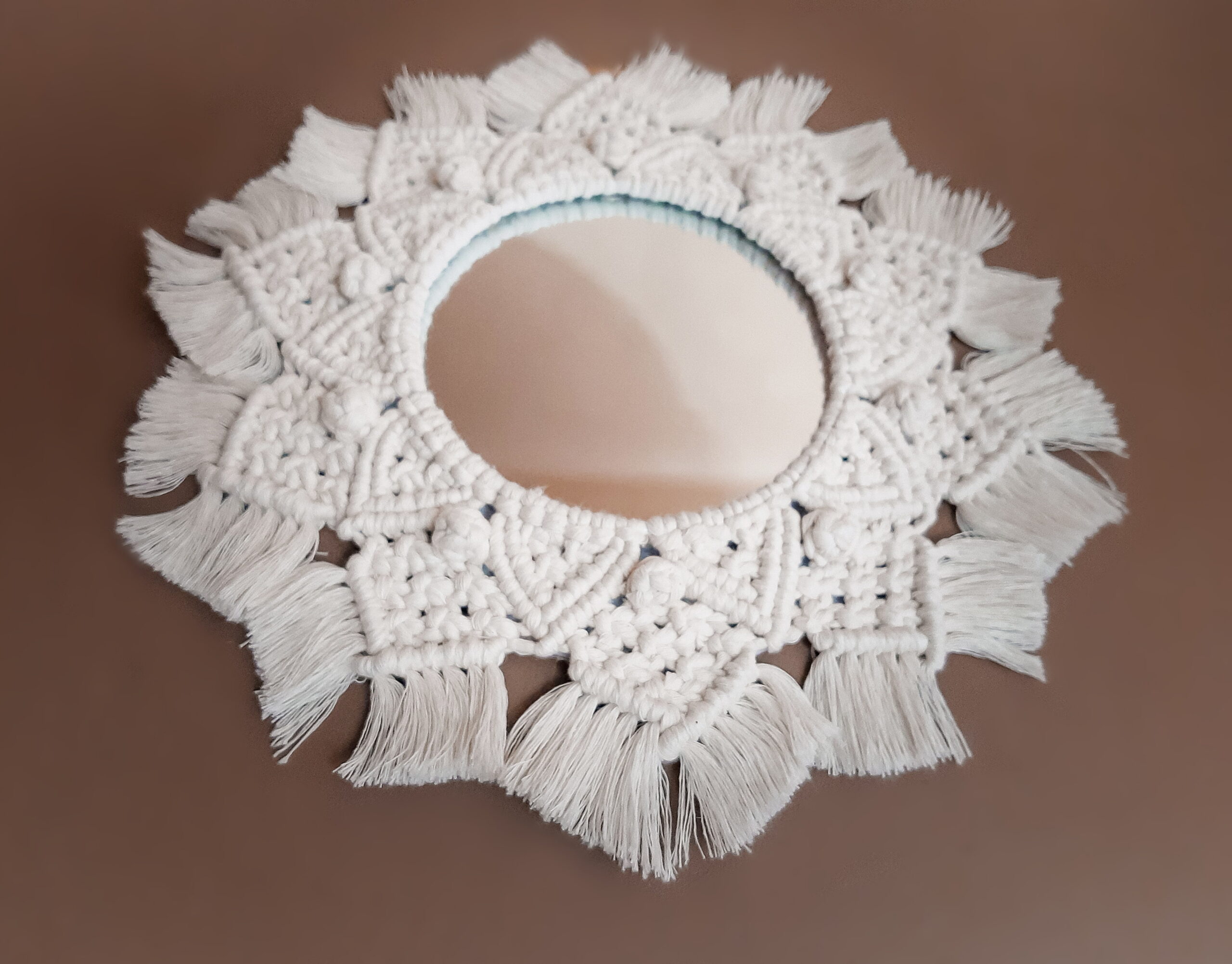 Dekoracyjne lustro wykonałam techniką makramy z czesanej bawełny. Makramowy splot wykonałam tak, aby przypominał kwiat, w którego centrum znajduje się lustrzana tafla. Praktyczna dekoracja idealnie wpisuje się w styl boho jak i boho-glam. Świetnie sprawdzi się jako ozdoba Twojej sypialni czy garderoby, również jako prezent dla Pań.