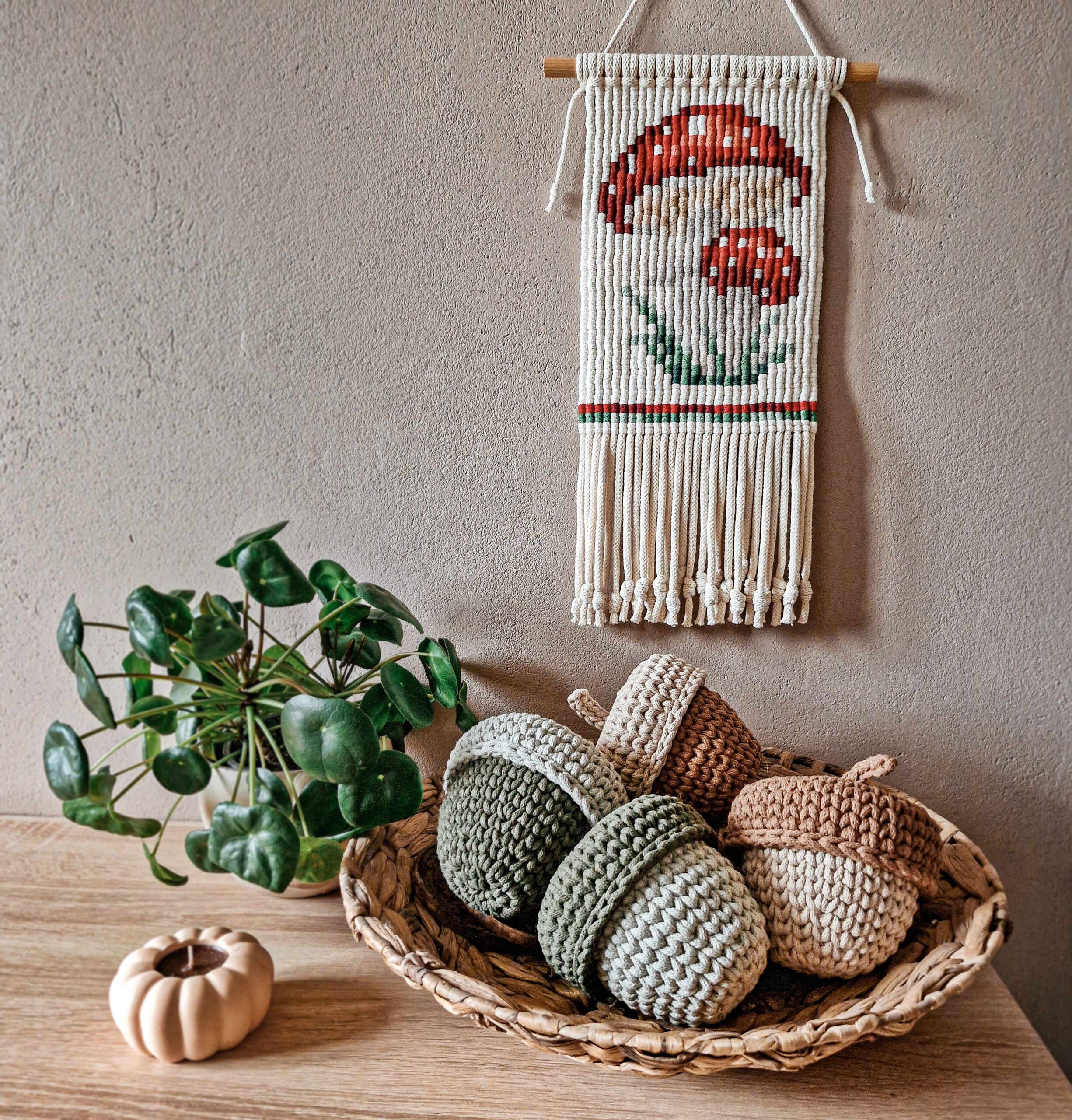 Urocza makrama Muchomorki to piękna jesienna dekoracja, która wprowadzi do Twojego domu niepowtarzalny klimat. Dedykuję ją dla osób zakochanych w jesiennych kolorach, w długich leśnych spacerach po szeleszczącej suchymi liśćmi ściółce, poszukujących pośród niej sezonowych skarbów natury.