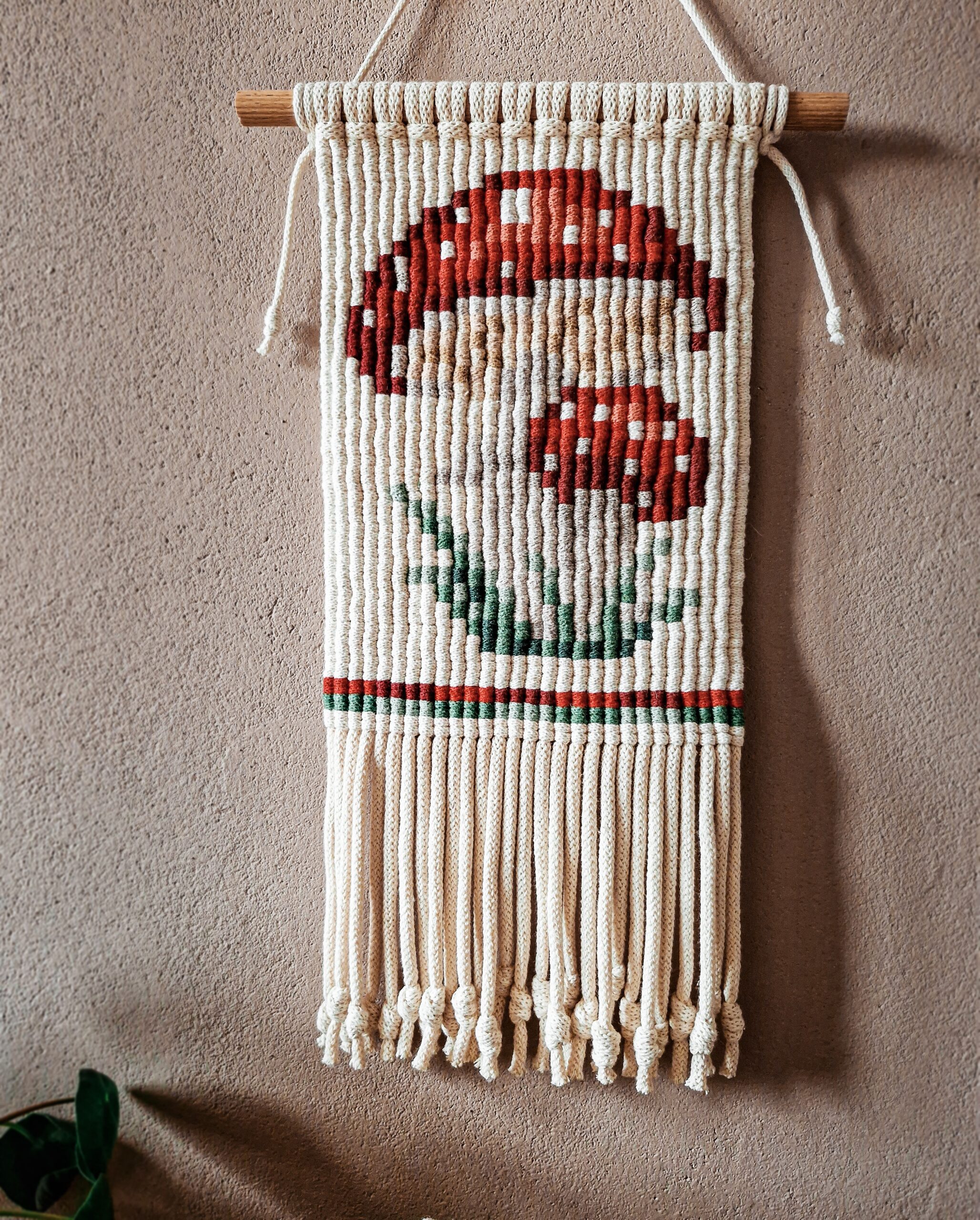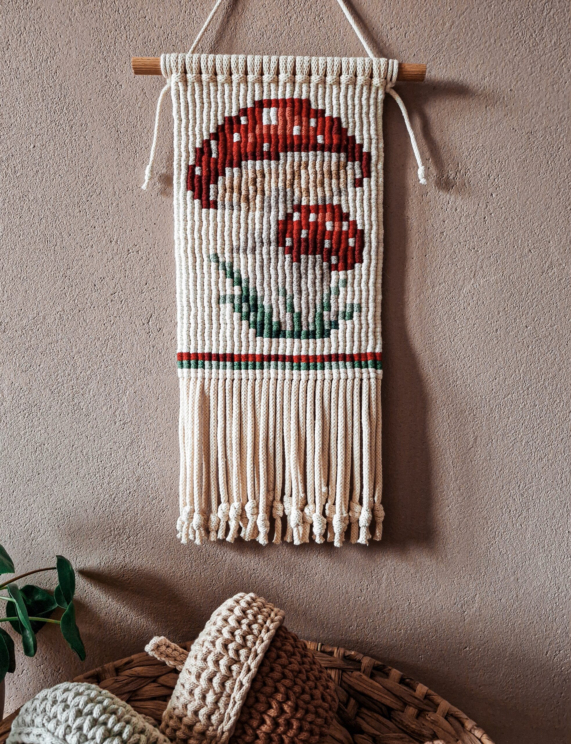 Makrama Muchomorki świetnie również uzupełni leśny lub zwierzęcy wystrój dziecięcego pokoju, wykonałam ją w całości z ekologicznego sznurka 100% bawełnianego z rdzeniem.