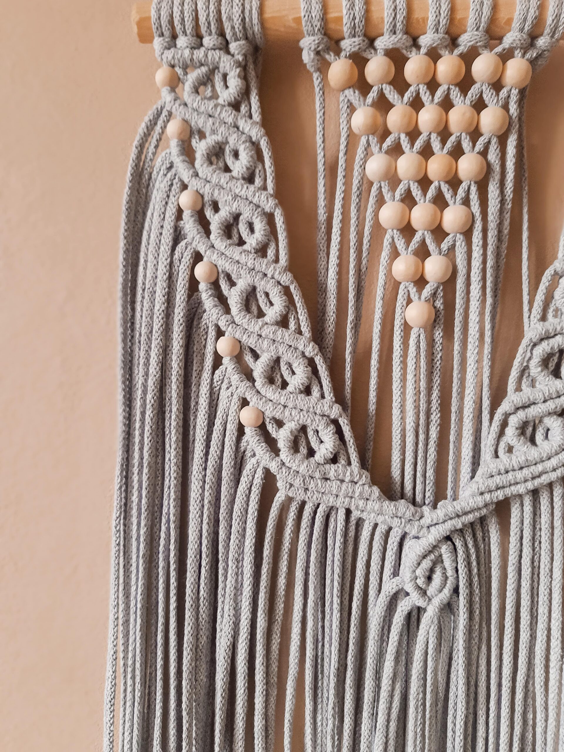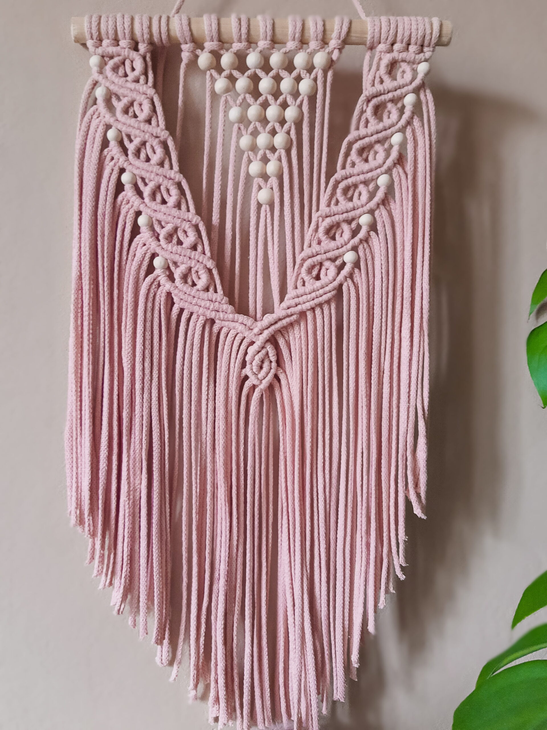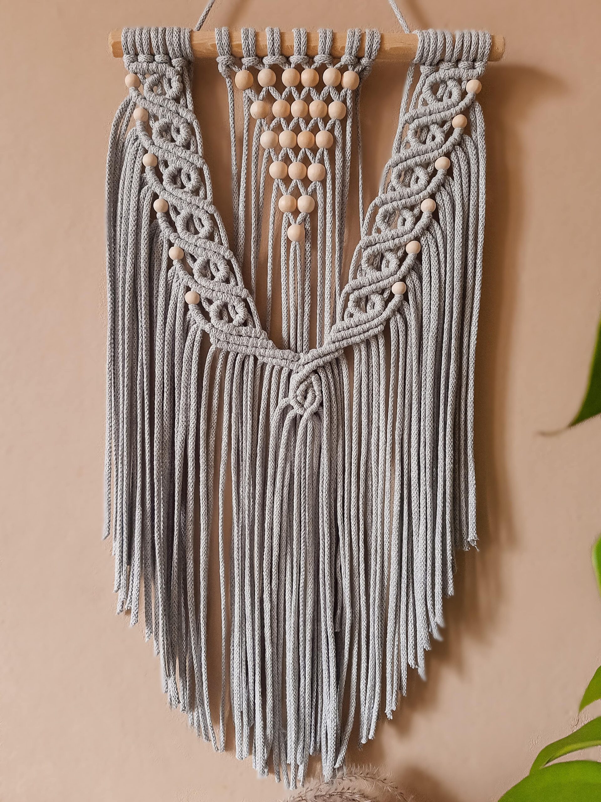 Delikatna, niewielka ścienna makrama w stylu boho, zdobiona drewnianymi koralami pięknie komponuje się z naturalnymi dodatkami i roślinami. Wprowadzi do Twojego mieszkania element w modnym stylu, ociepli klimat . Jeśli szukasz niebanalnego pomysłu na dekoracje ścienną – to właśnie znalazłeś produkt dla siebie. Makrama zawieszona jest na drewnianym kiju – profilu. Delikatny wzór wprowadzi do wnętrza odrobinę subtelności. Makrama świetnie współgra z drewnianymi meblami.