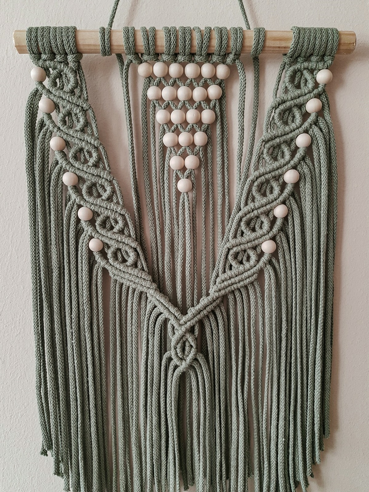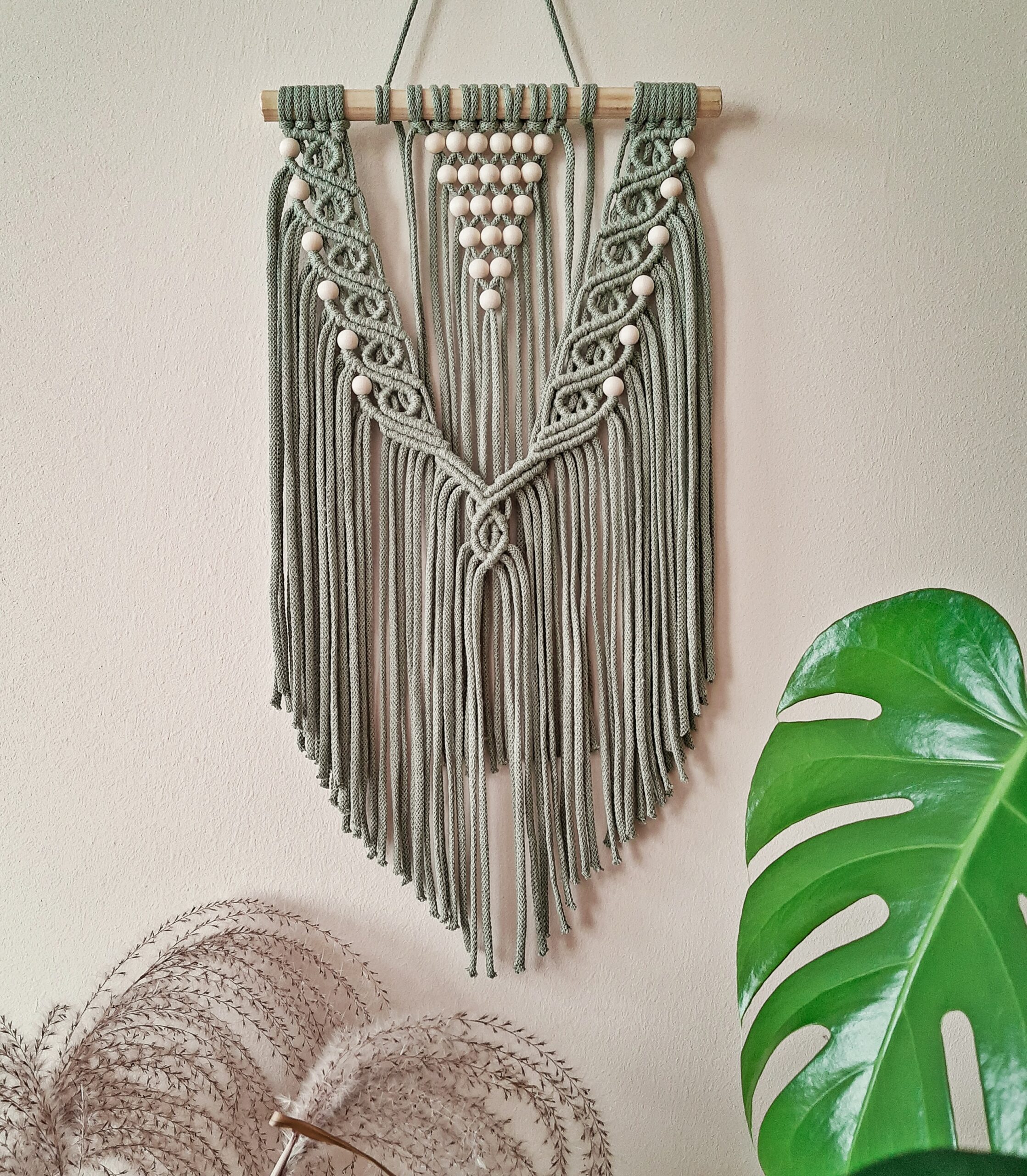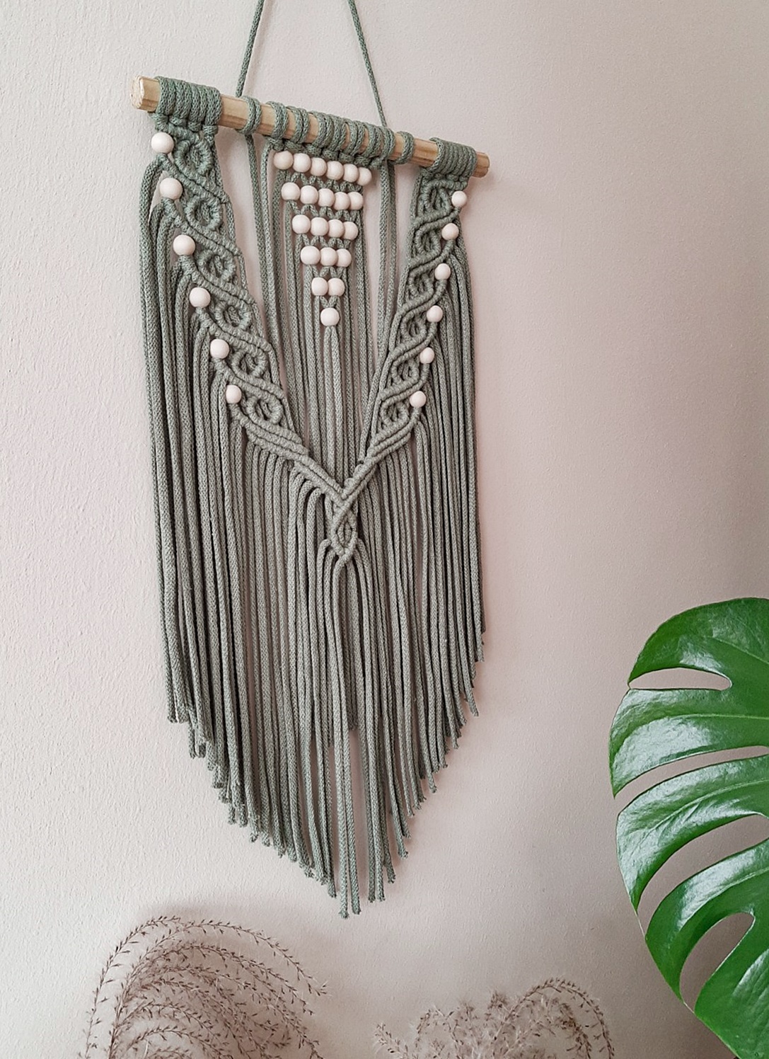Delikatna, niewielka ścienna makrama w stylu boho, zdobiona drewnianymi koralami pięknie komponuje się z naturalnymi dodatkami i roślinami. Wprowadzi do Twojego mieszkania element w modnym stylu, ociepli klimat . Jeśli szukasz niebanalnego pomysłu na dekoracje ścienną – to właśnie znalazłeś produkt dla siebie. Makrama zawieszona jest na drewnianym kiju – profilu. Delikatny wzór wprowadzi do wnętrza odrobinę subtelności. Makrama świetnie współgra z drewnianymi meblami.
