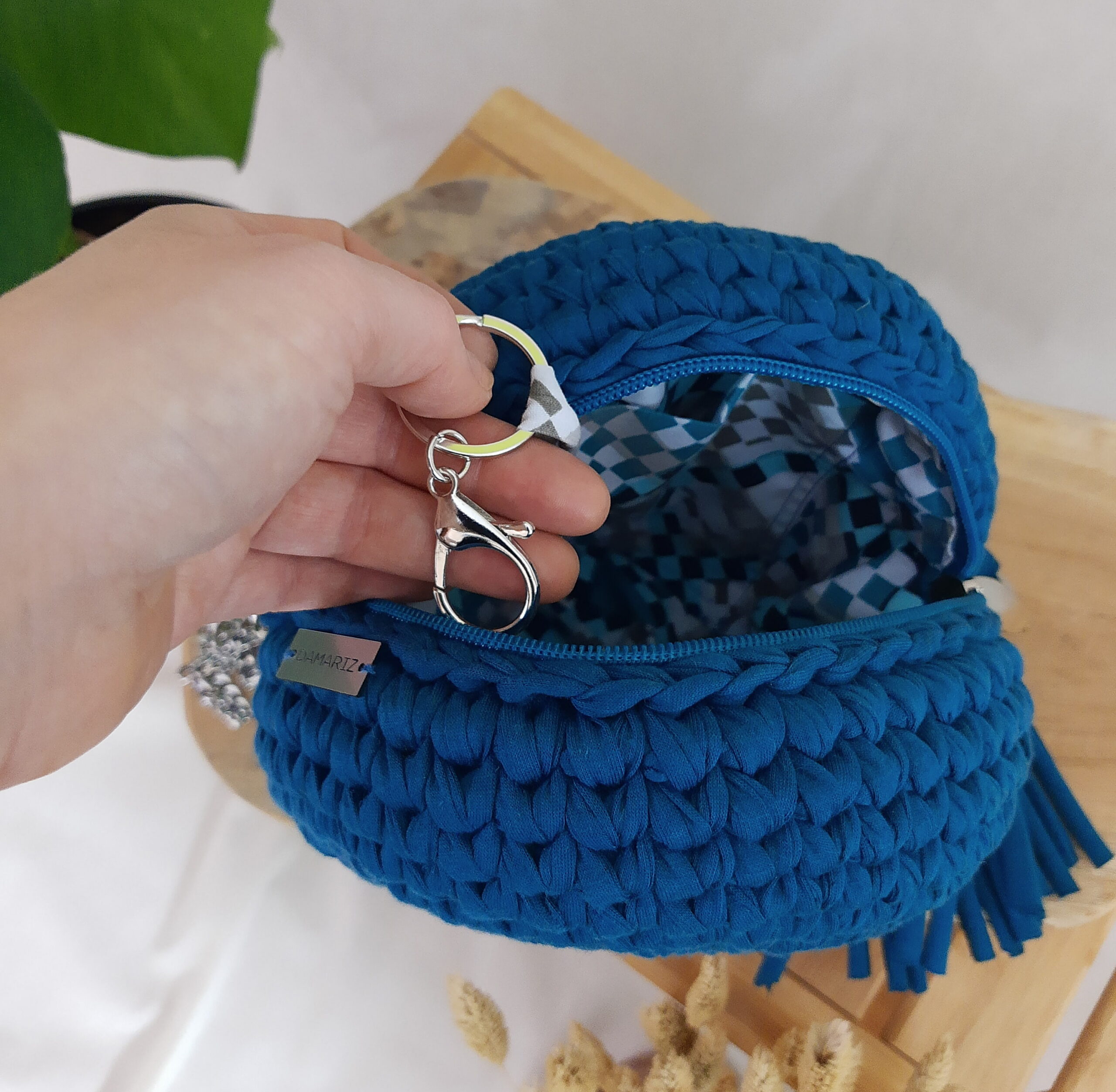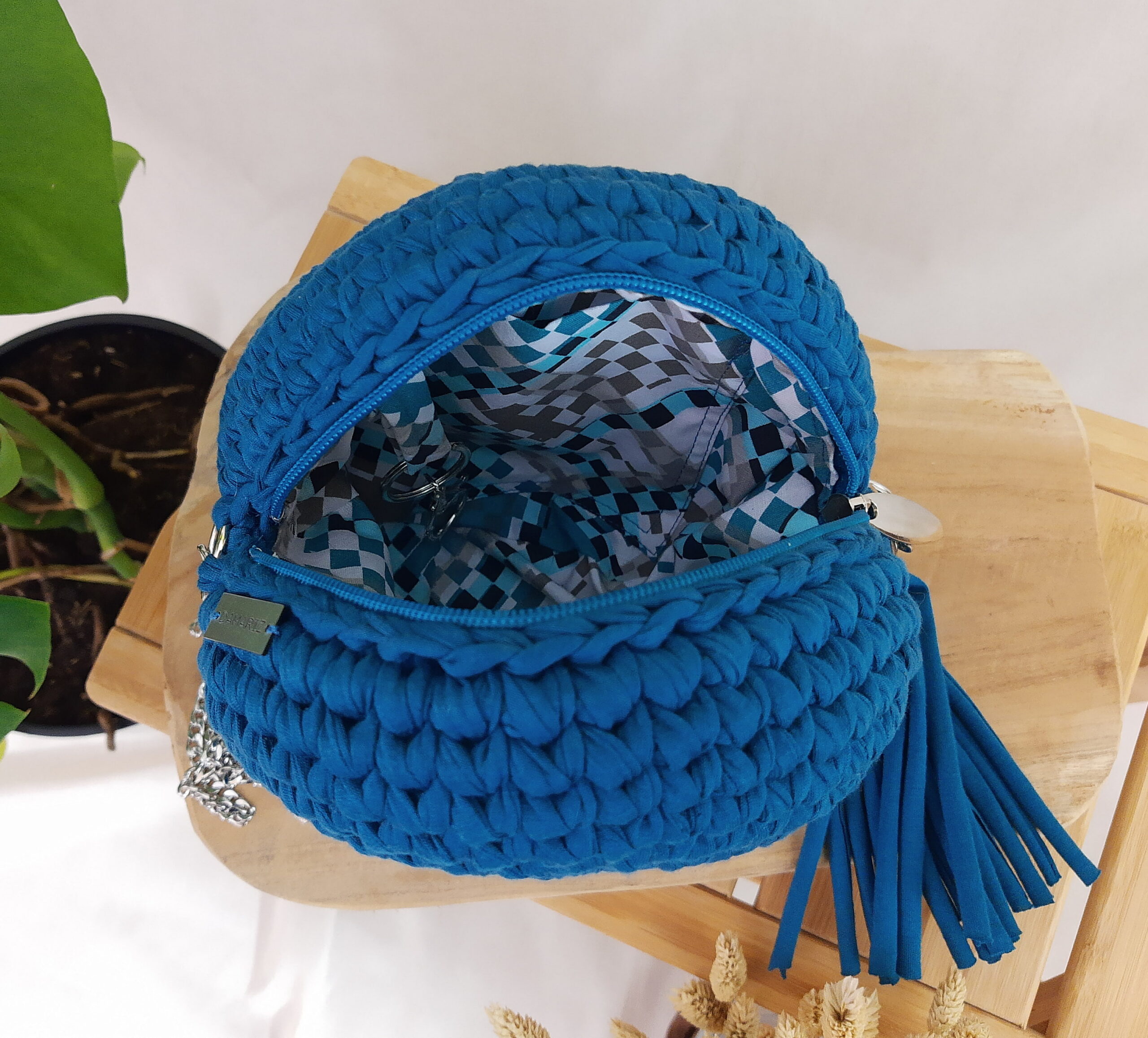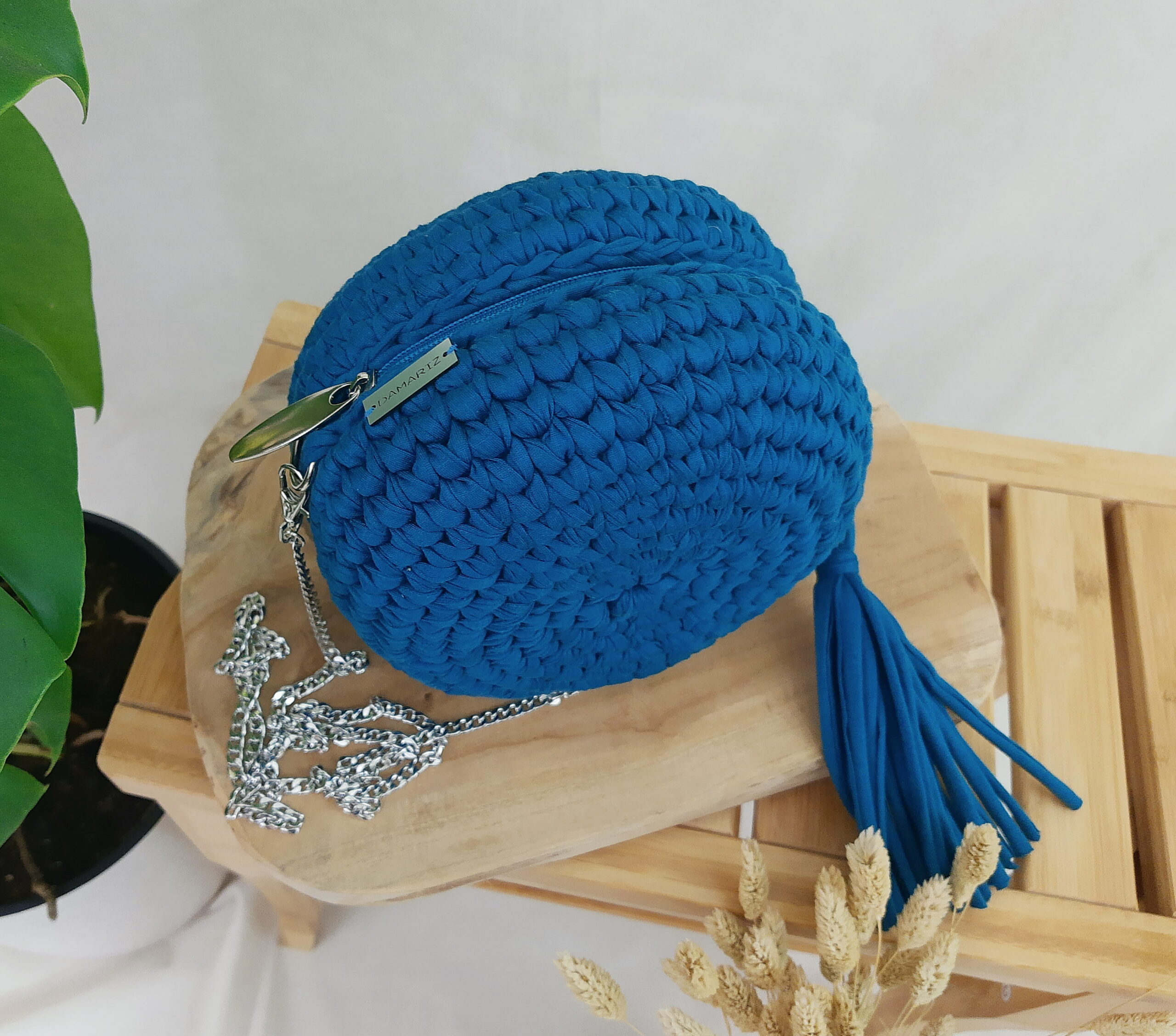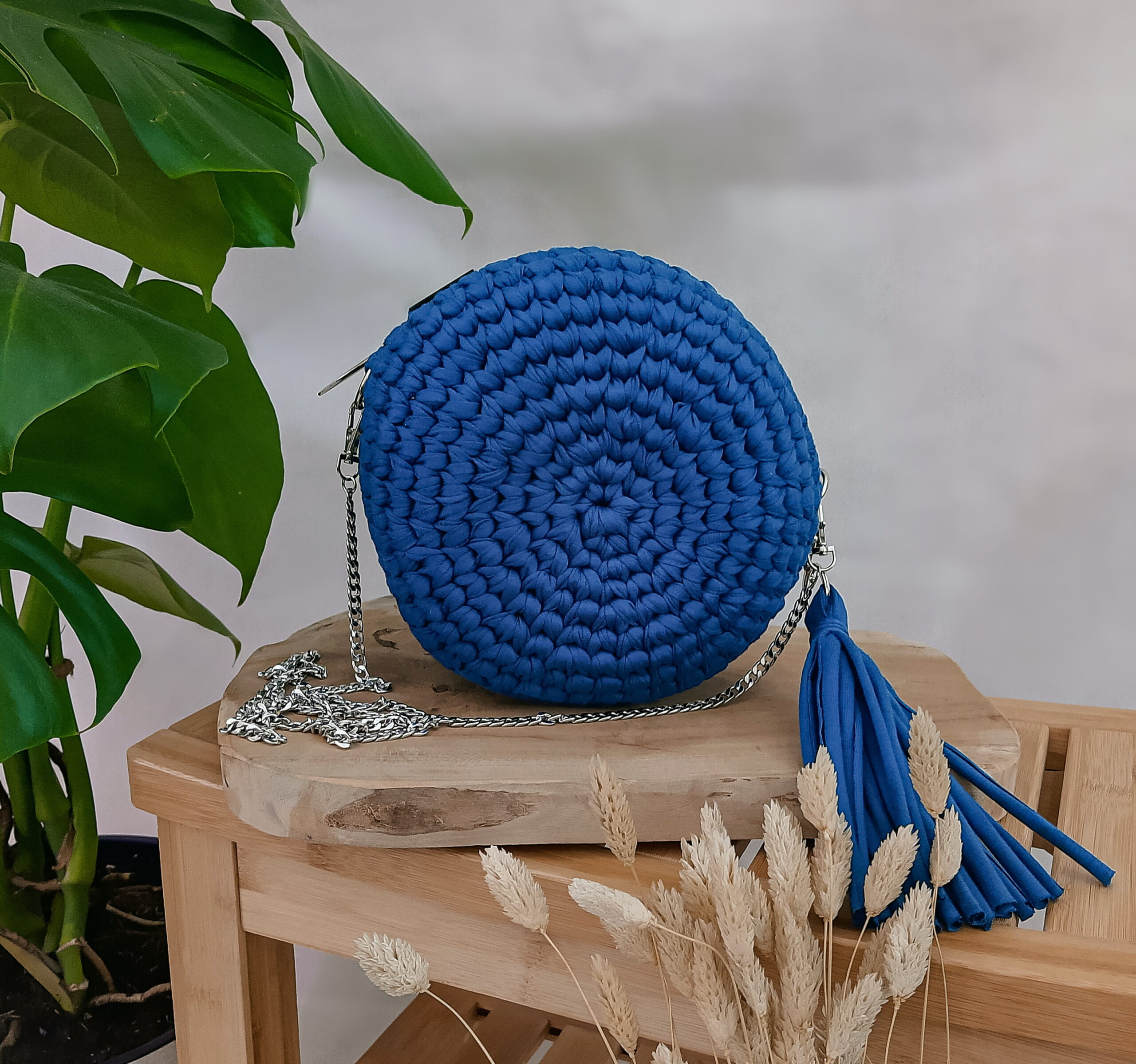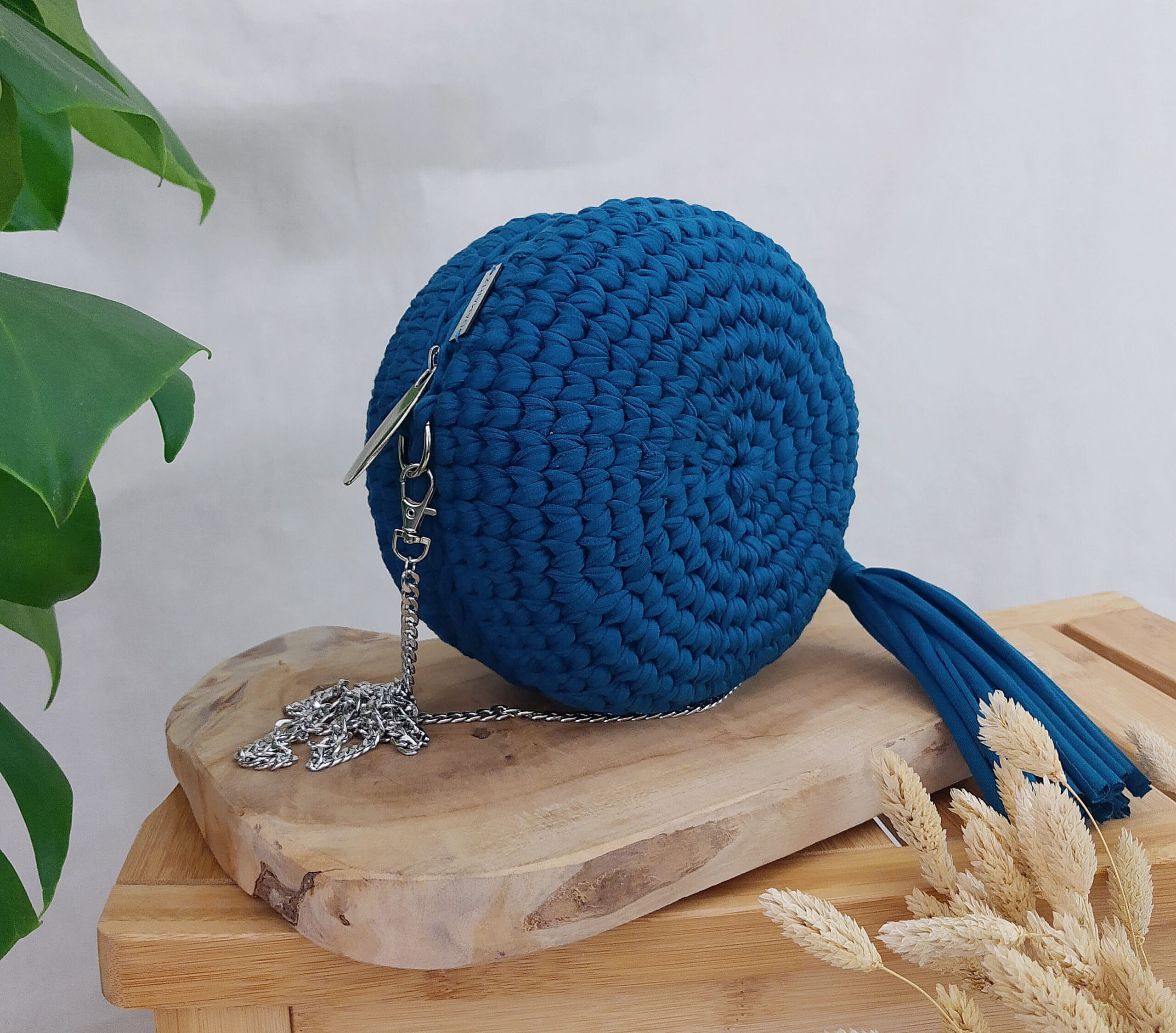 materiał: przędza T-shirt yarn premium, bawełniana podszewka, metalowy łańcuszek;
