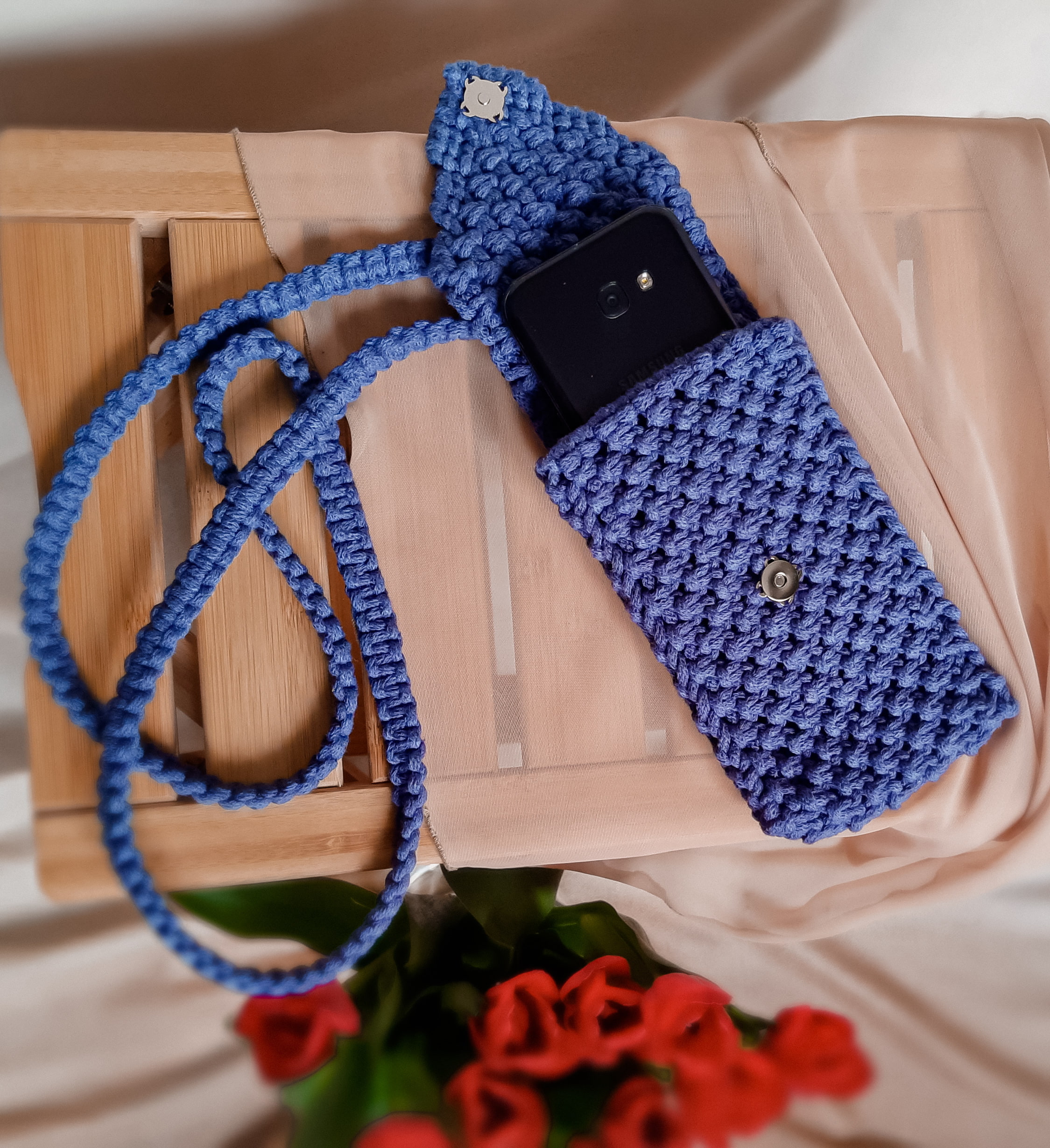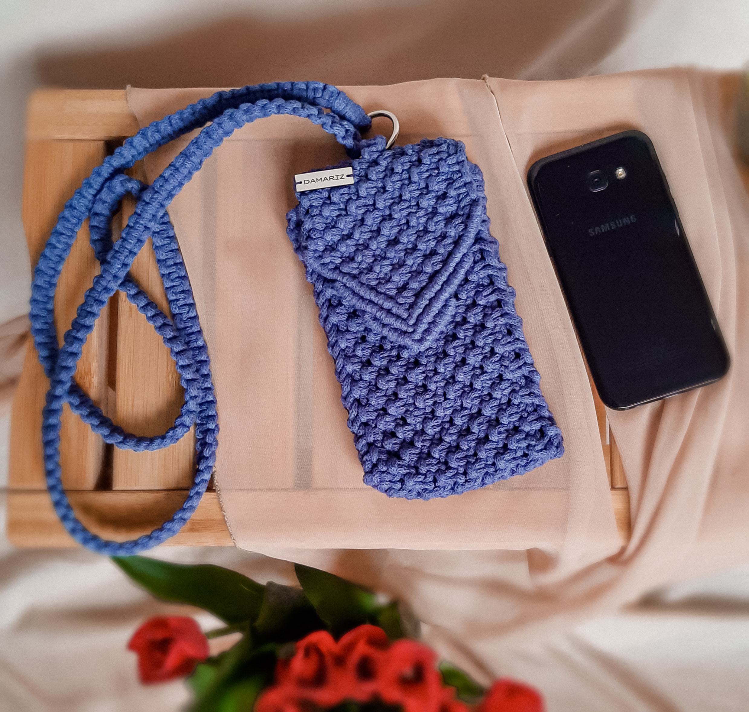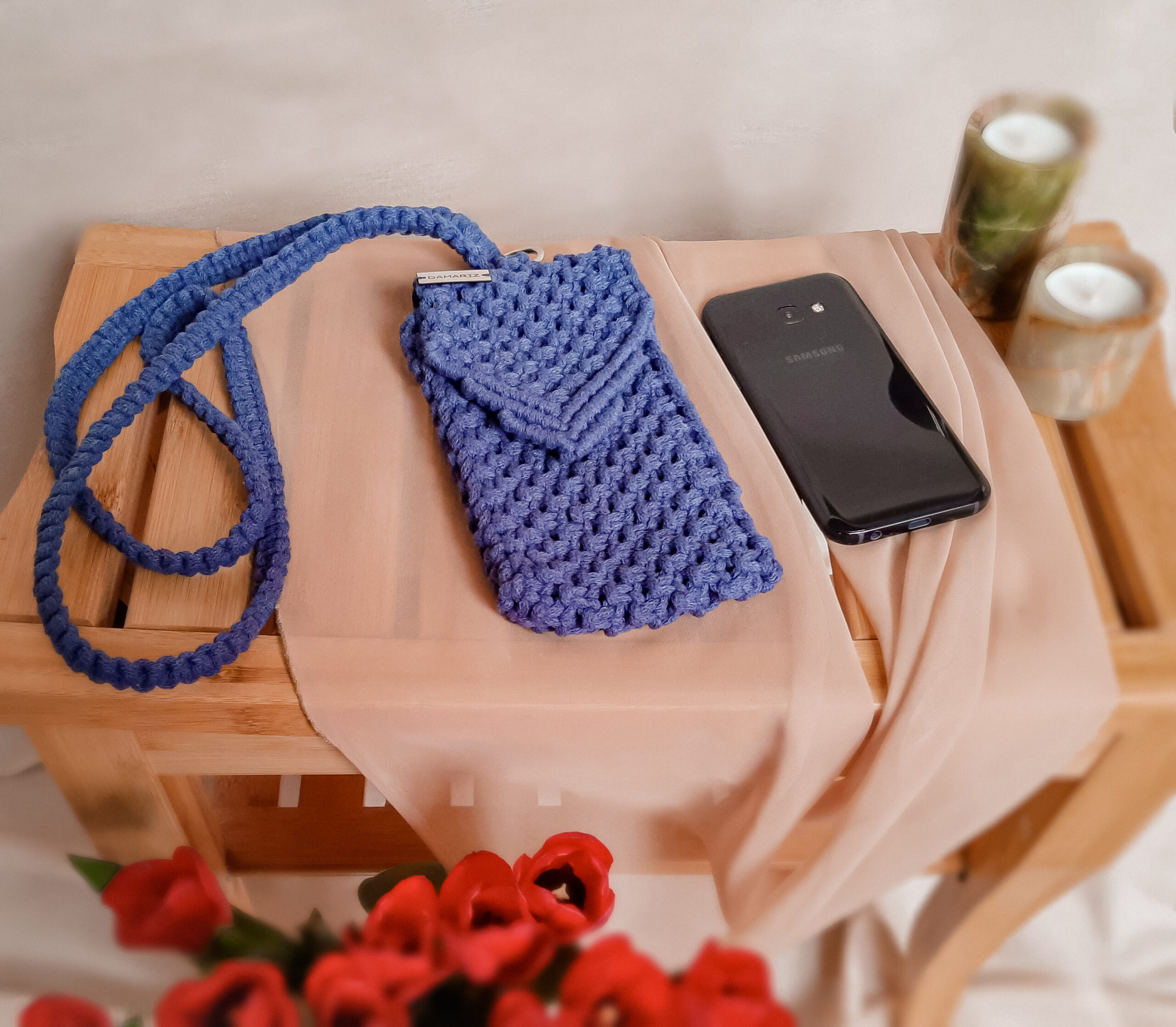 Etui wykonane jest ze sznurka bawełnianego z rdzeniem przez co zachowuje swój kształt. Jego wielkość pozwoli zmieścić do środka każdy smartfon.