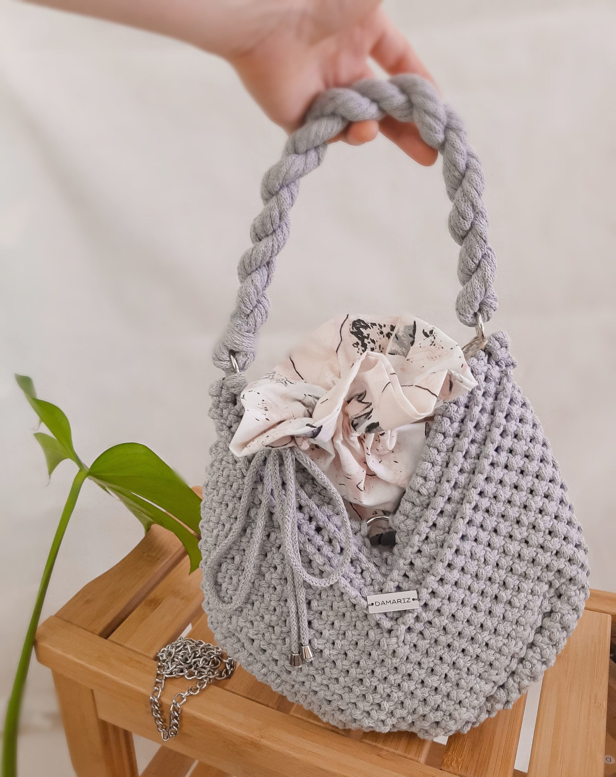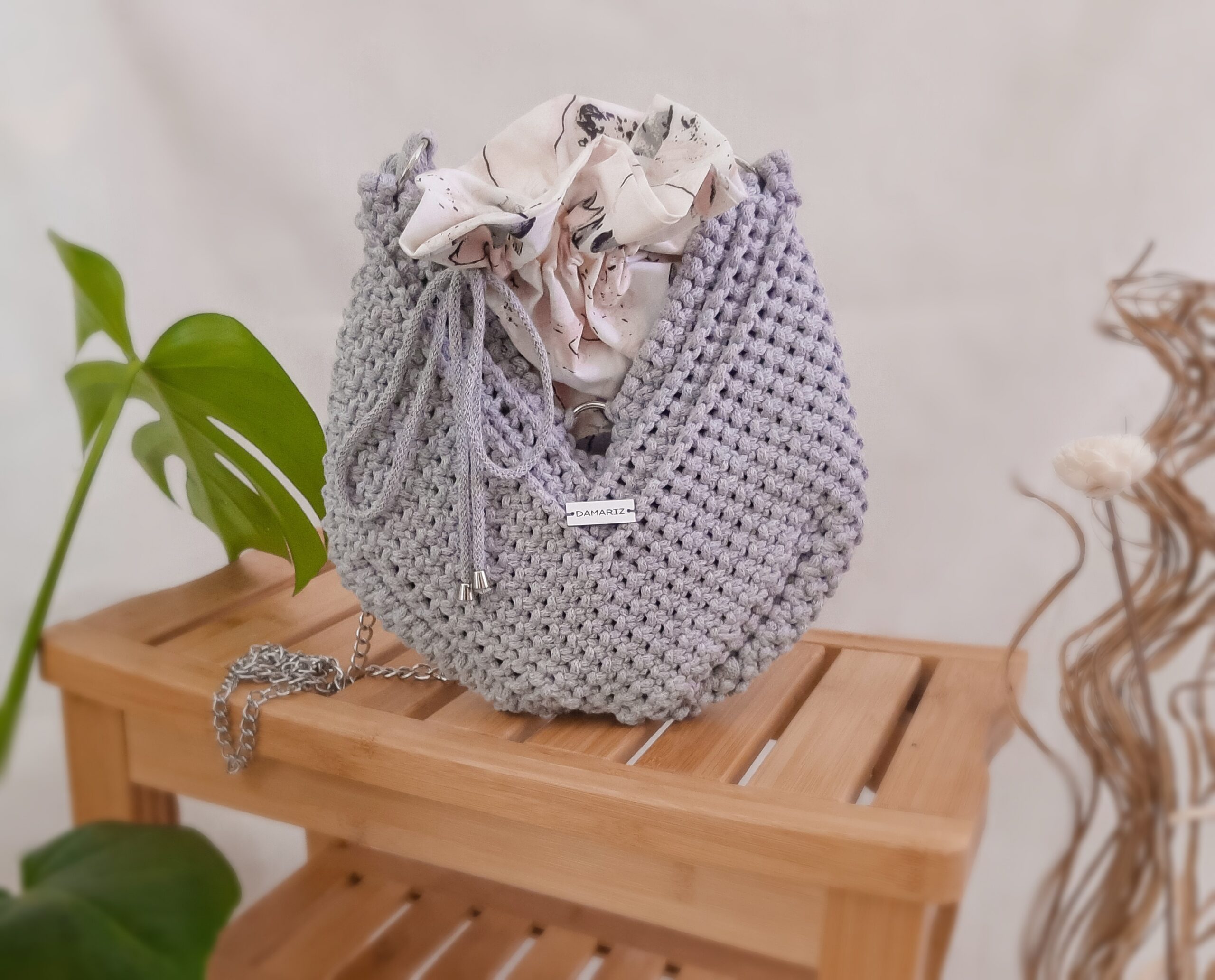 Torebka została wypleciona ręcznie techniką makramy według autorskiego projektu. Całość wykończona jest wszytą ręcznie podszewką z kolorowym motywem kwiatowym, którą dopasowałam pod kolor body. Podszewka uszyta jest z mocnej, bawełnianej tkaniny. Posiada w środku kieszonkę oraz karabińczyk na klucze – dzięki temu znajdziesz je zawsze w tym samym miejscu.