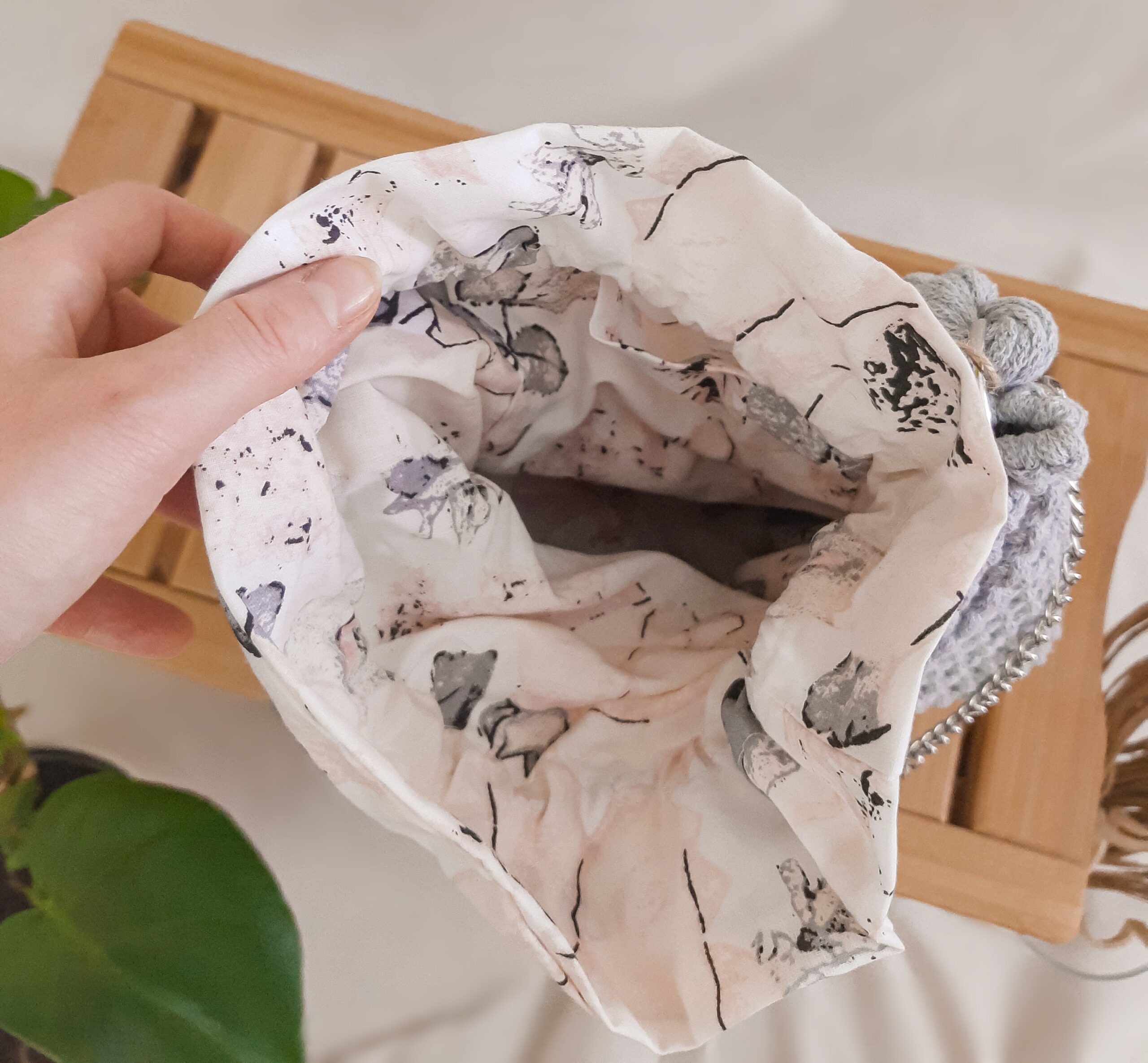 Z wnętrza koszyczka wystaje kwiecisty woreczek – podszewka, ściągany i zawiązywany w górnej części.