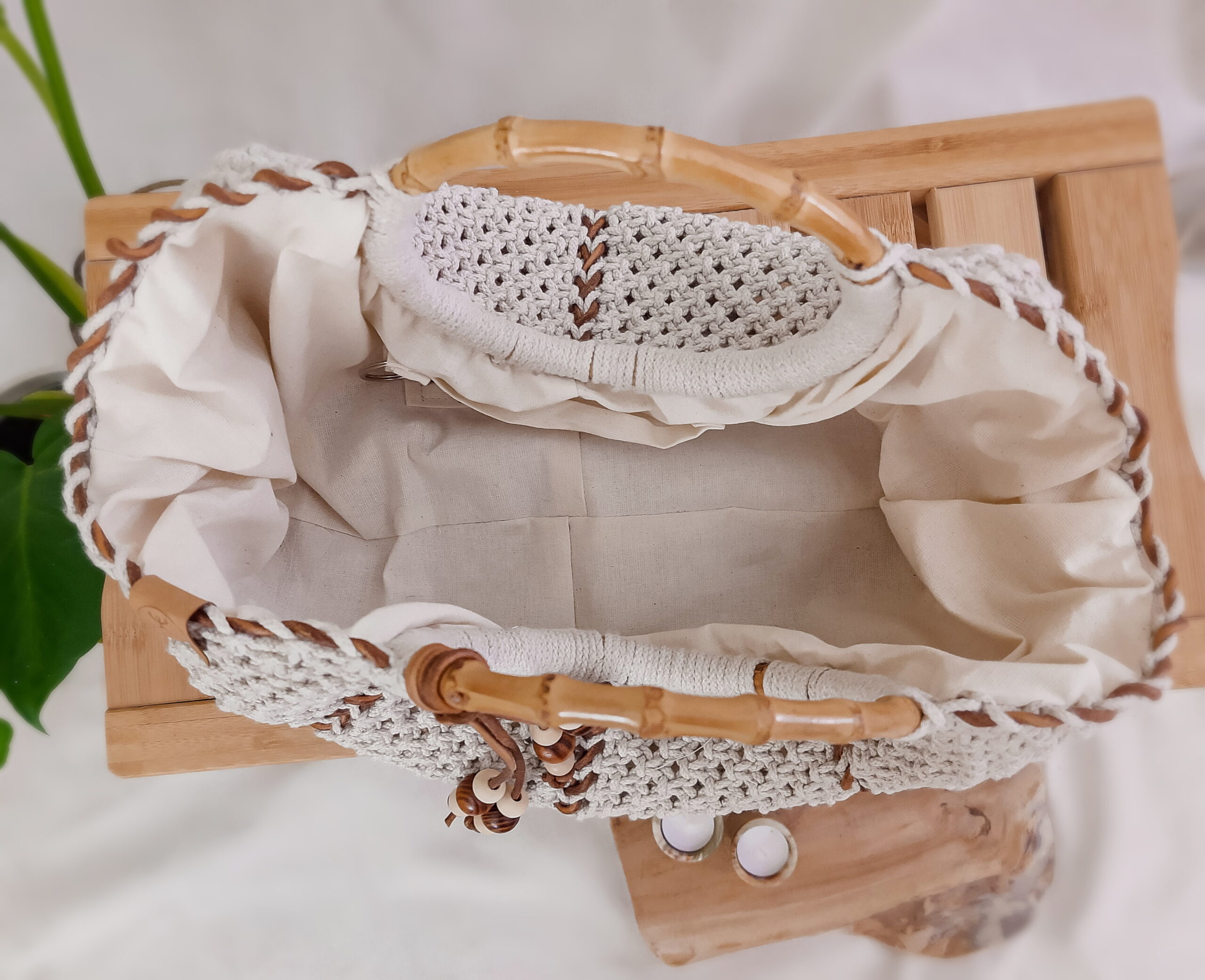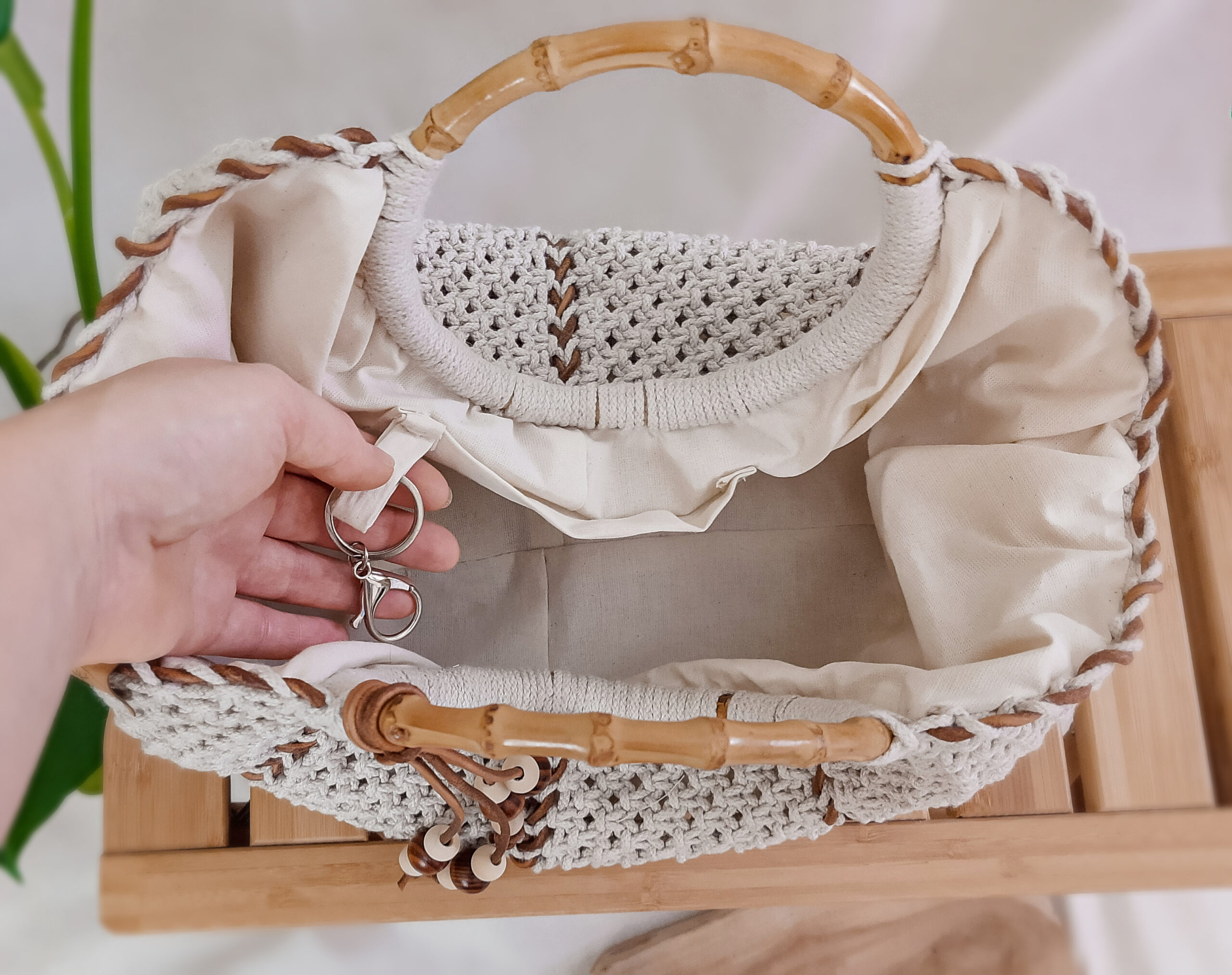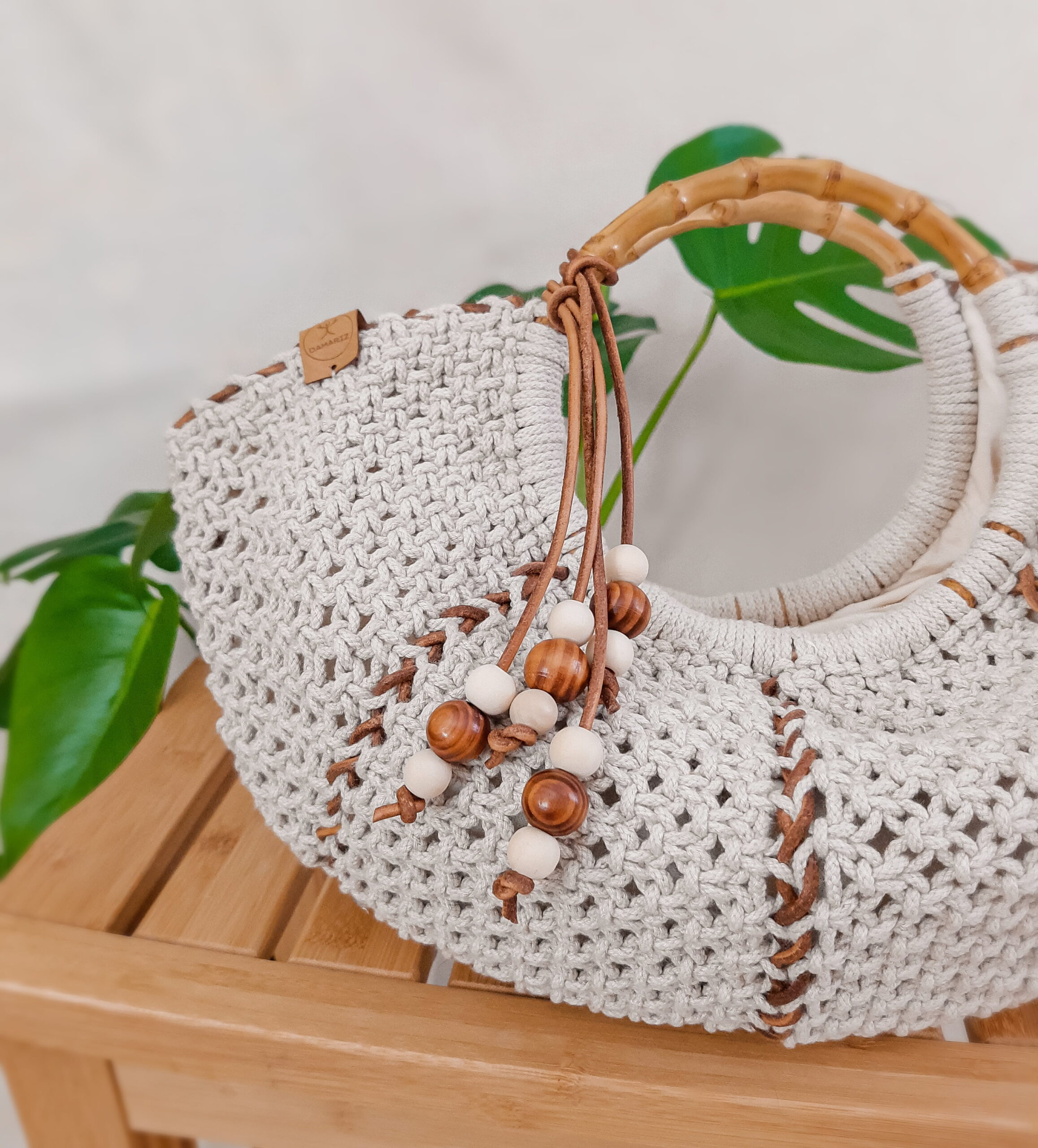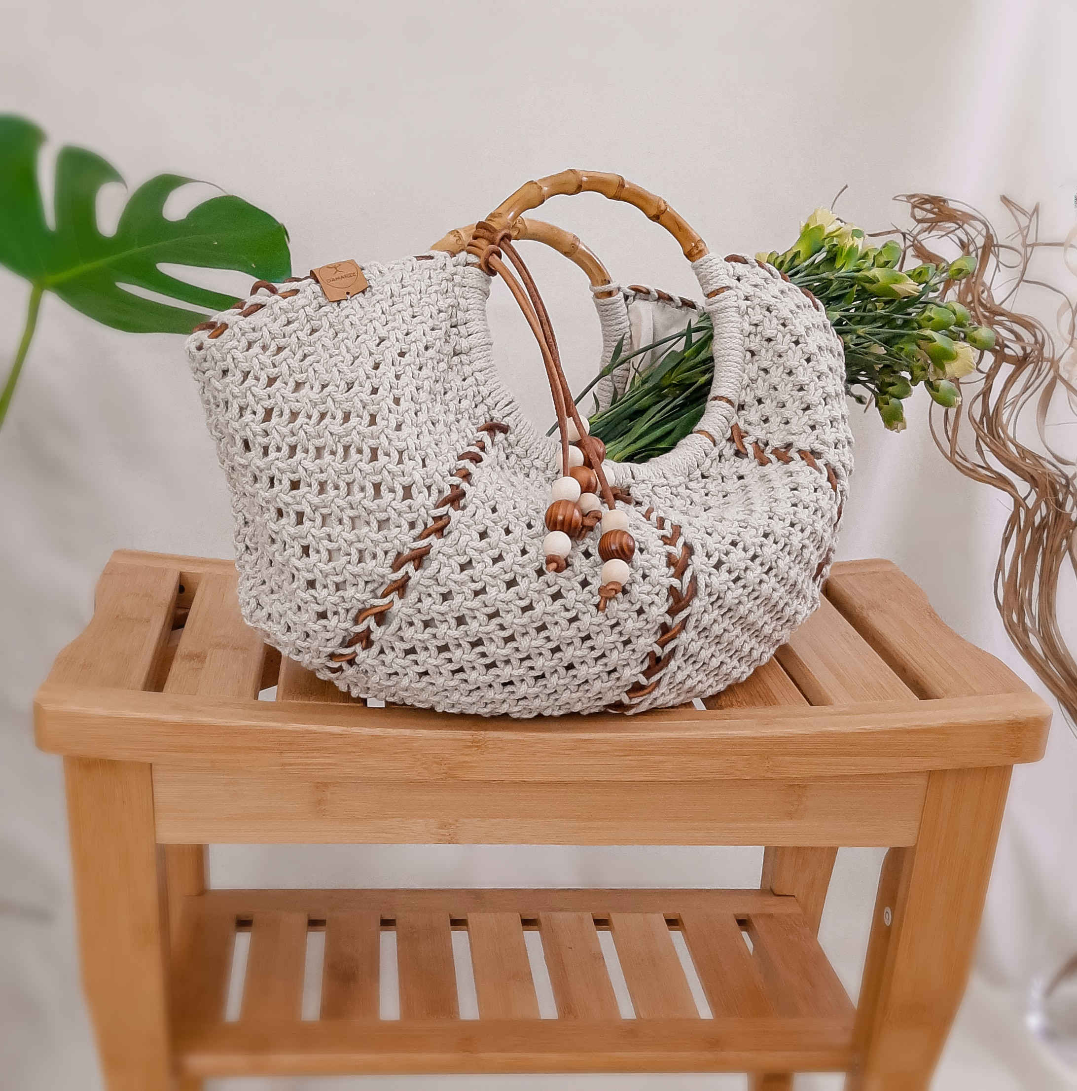 Torebka została wypleciona techniką makramy według autorskiego wzoru. Powstała z plecionego lnu w naturalnym kolorze oraz ze skóry naturalnej pochodzenia polskiego a także z drewna bambusowego (rączka). Stworzyłam ją starannie ręcznie dopracowując każdy szczegół, w modnym, naturalnym stylu boho, aby wprowadzić element lekkości do Twojej stylizacji.