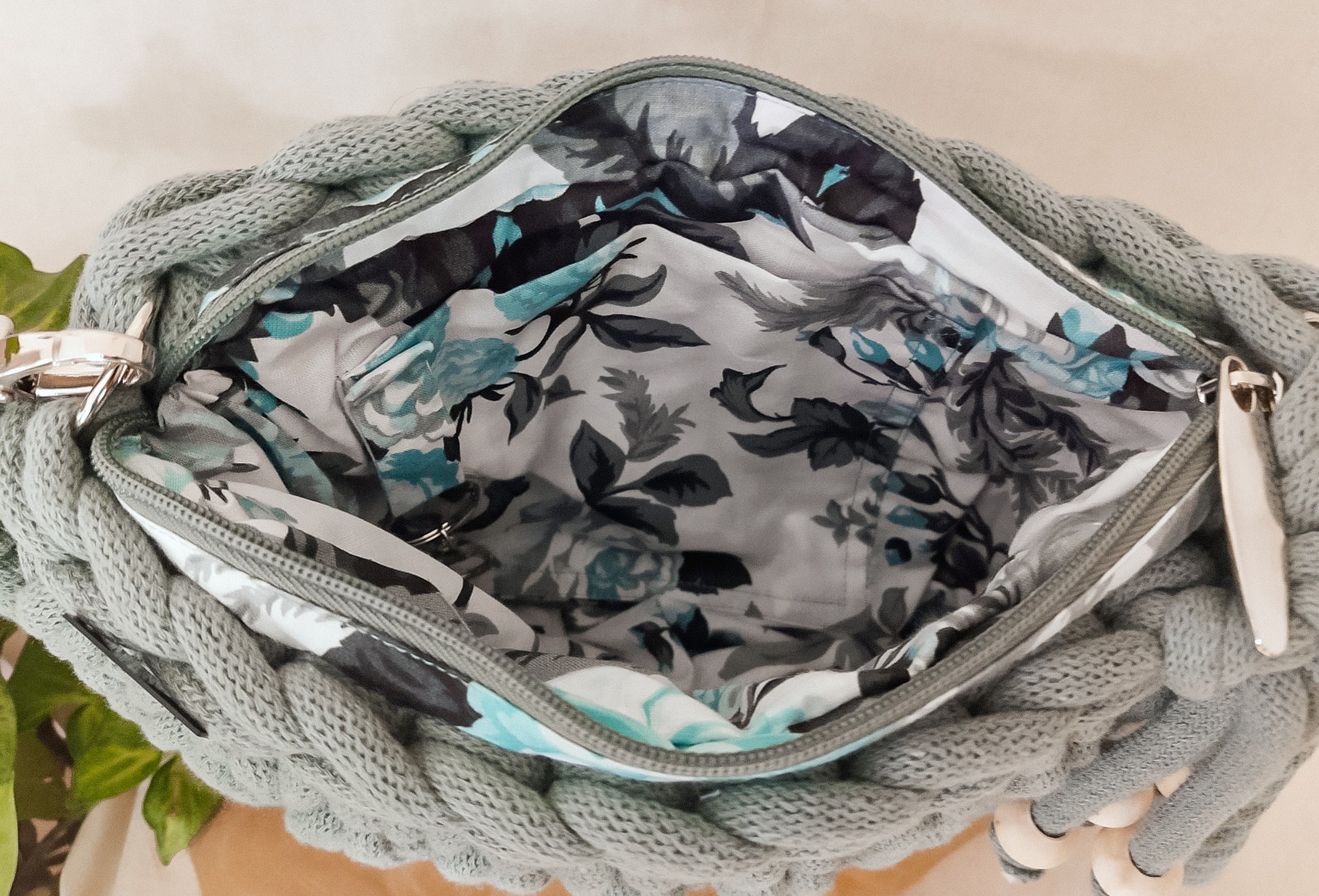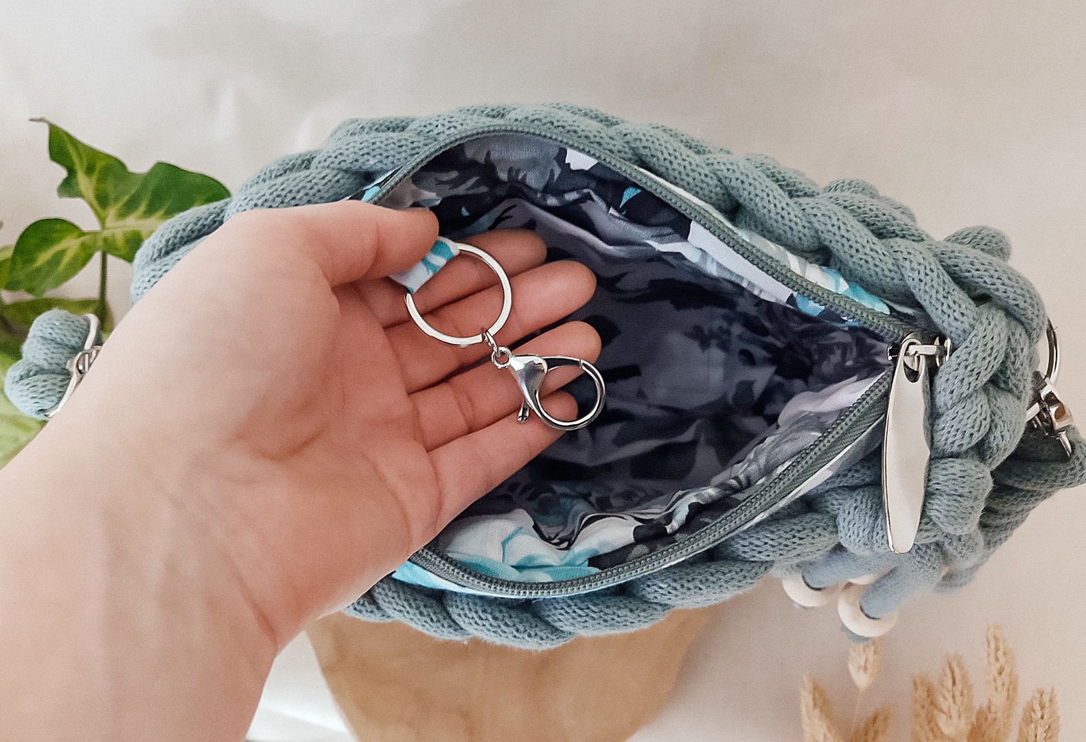 Torebka wykonana jest ręcznie z wysokiej jakości recyklingowego sznurka bawełnianego z certyfikatem STANDARD 100 by OEKO-TEX. Wewnątrz znajduje się dobrana pod kolor body bawełniana, wzorzysta podszewka z kieszonką oraz karabińczykiem do przypięcia kluczy – dzięki temu zawsze będziesz wiedzieć gdzie są i obejdzie się bez zbędnego szukania.