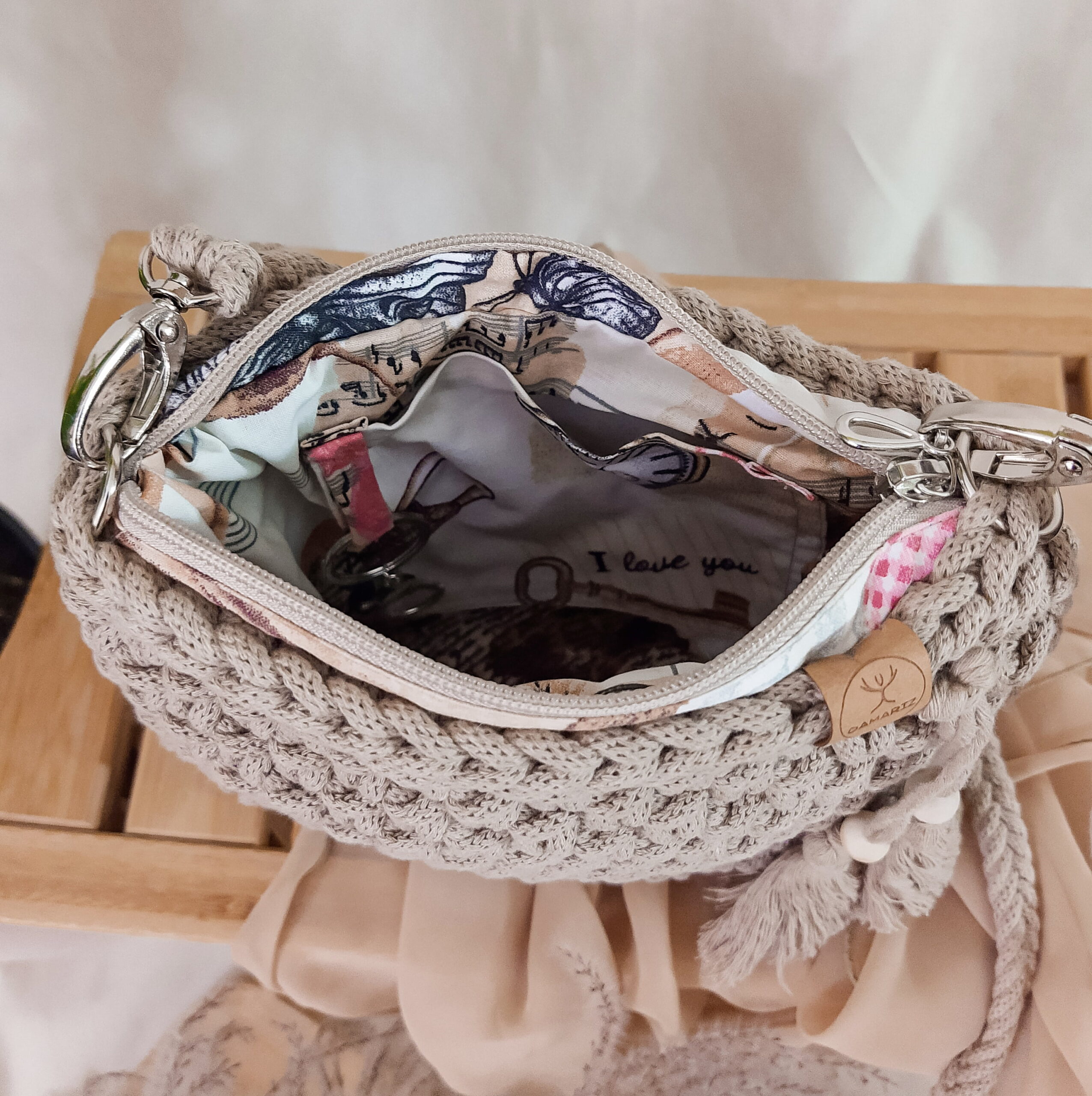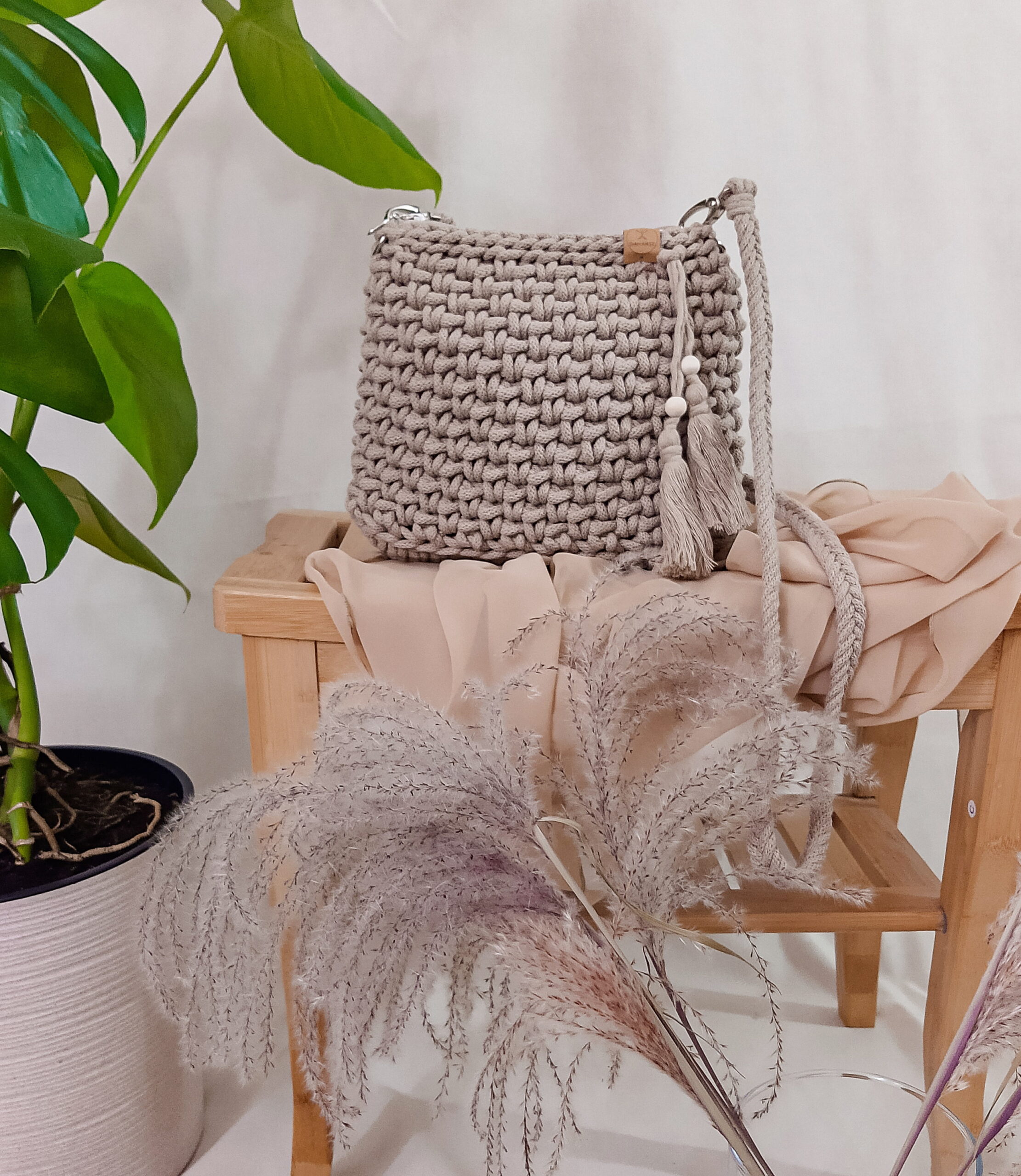 City bag to torebka, która powstała z inicjatywy moich klientek – na podstawie wzoru kosmetyczki. Stworzyłam ją na Waszą prośbę aby mogła Ci towarzyszyć w szybkim wyjściu na miasto albo na spacer z podstawowymi, najpotrzebniejszymi rzeczami. Wykonałam ją w lekkim ściegu, przez co zredukowałam maksymalnie jej wagę, abyś mogła czuć się z nią swobodnie i komfortowo. Jej design świetnie komponuje się ze swobodnym, niezobowiązującym stylem, a dekoracyjne chwosty dodają jej niepowtarzalnego uroku.