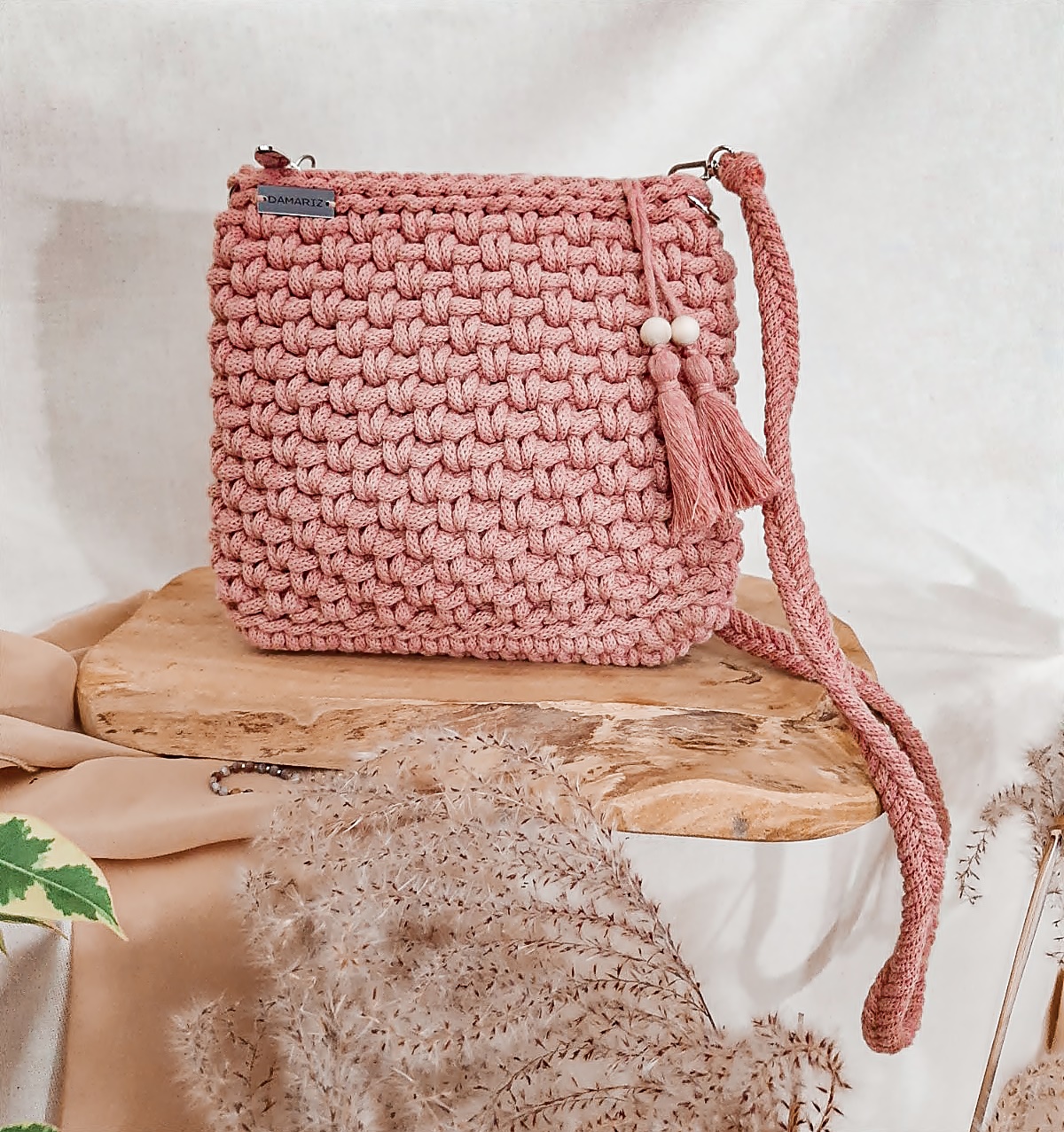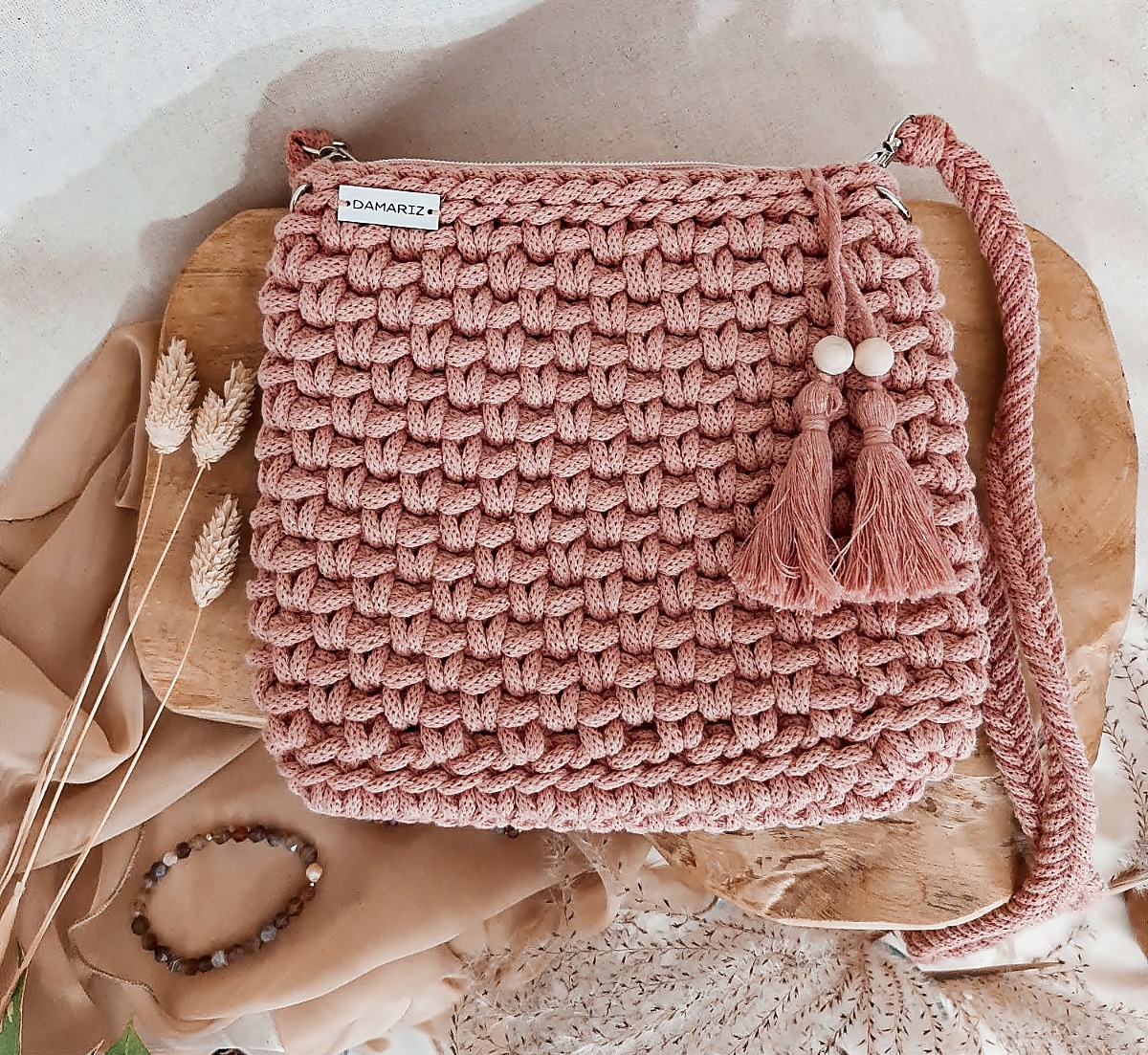 Torebka ze sznurka City bag – różowe złoto, srebrne dodatki – od ręki