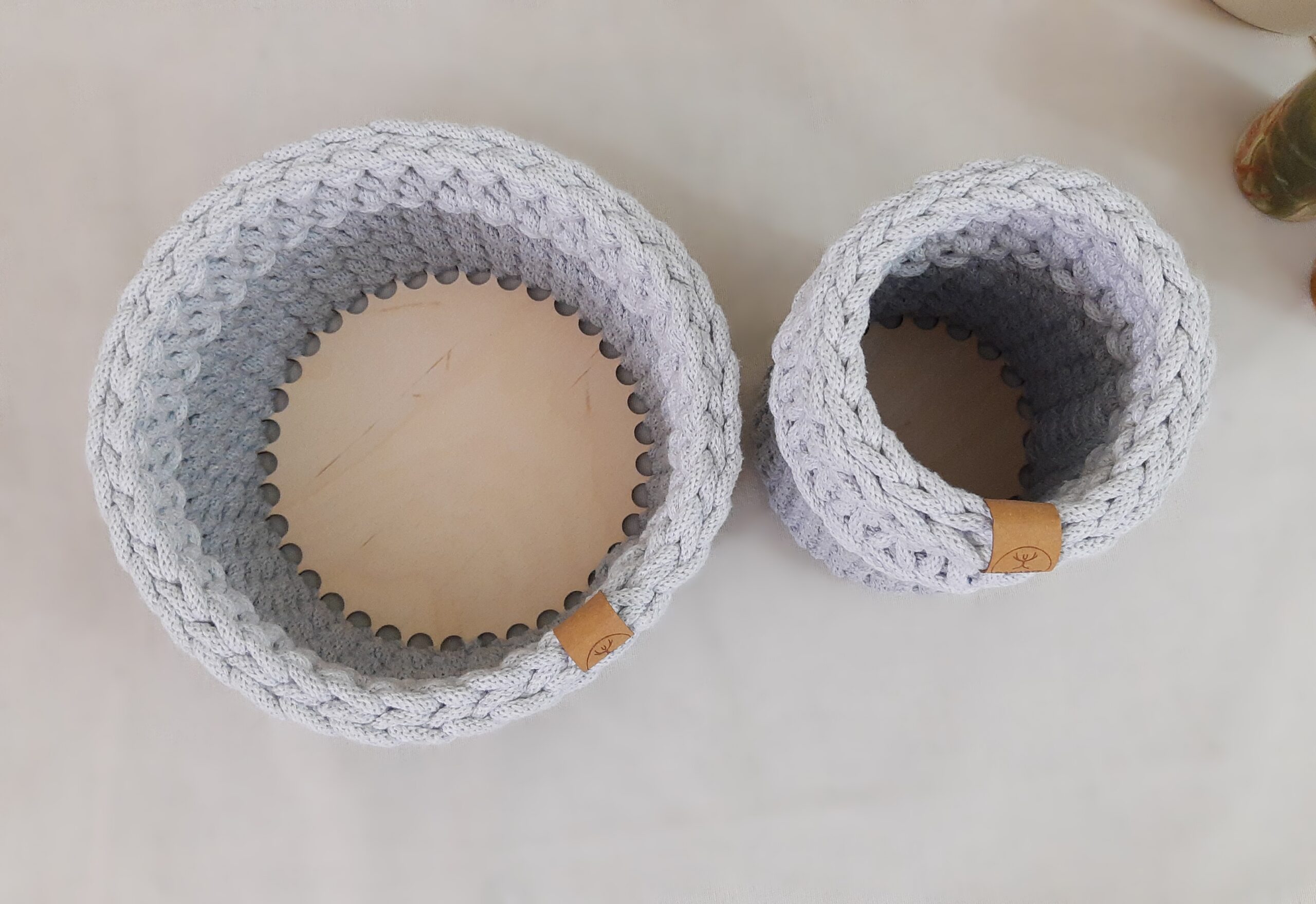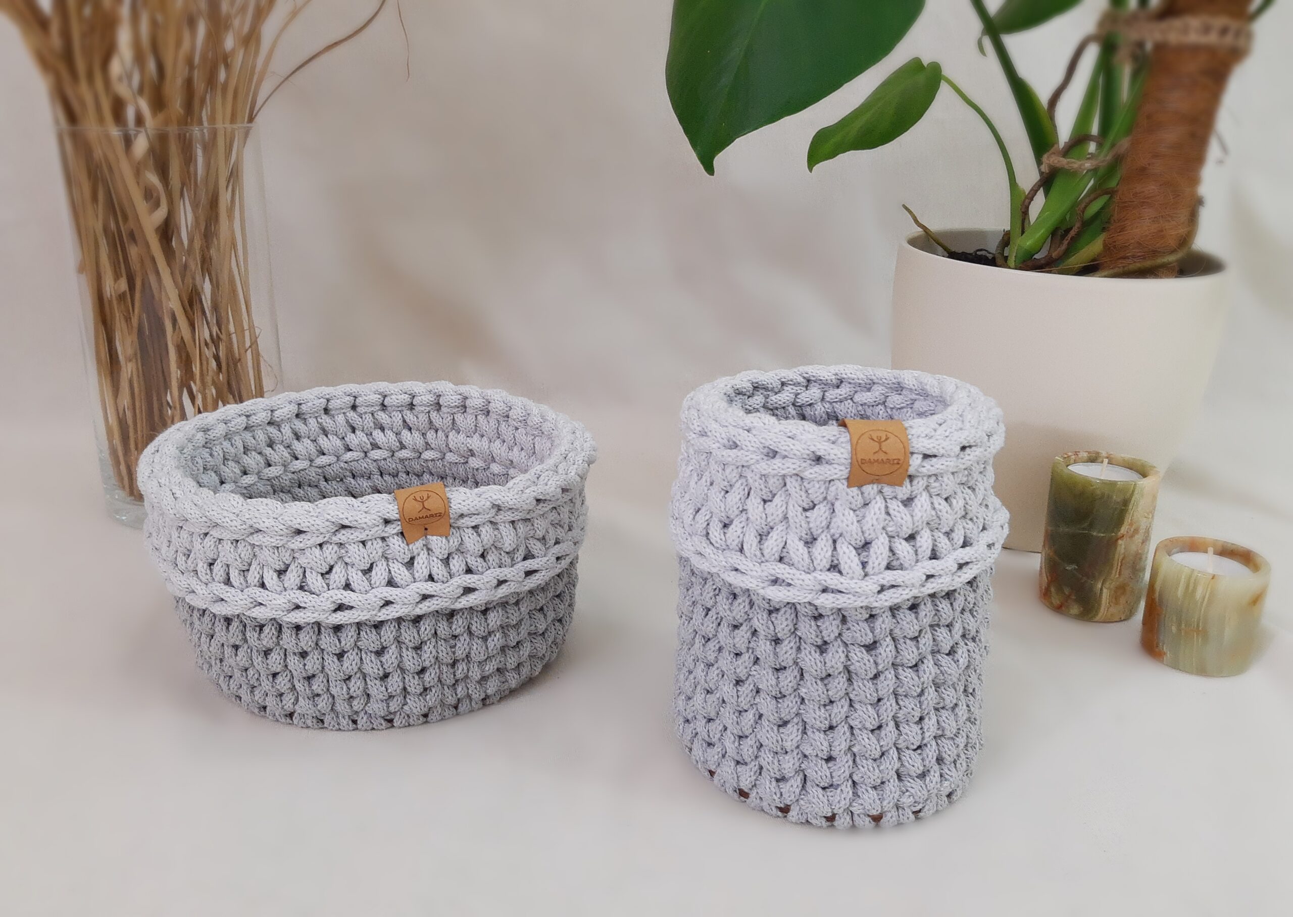 Zestaw dwóch eleganckich koszyczków wykonanych ręcznie ze sznurka bawełnianego to świetny pomysł na uporządkowanie swojej przestrzeni dodając jej jednocześnie ciepła. Koszyczki wykonałam z wysokiej jakości sznurka 5 mm przez co są sztywne i zachowują swój kształt. Dno wykonane jest ze sklejki. Eleganckie odcienie szarości wpisują się do większości wnętrz, więc będzie to również bardzo dobry wybór na prezent. Nadają się zarówno do łazienki jak do garderoby czy sypialni.