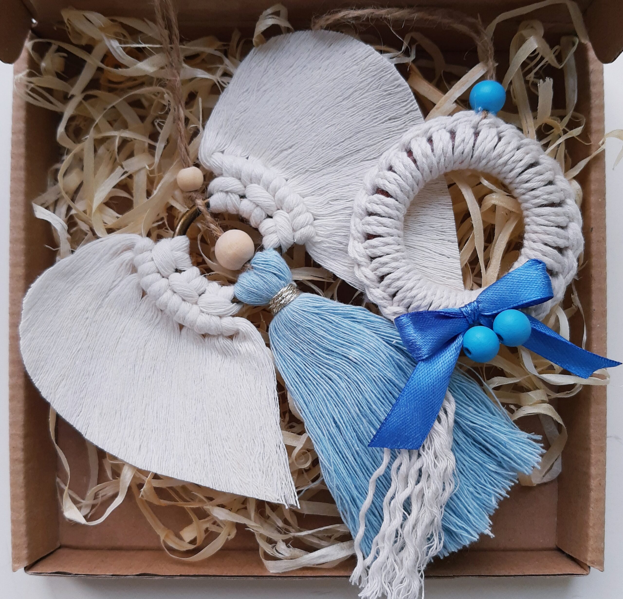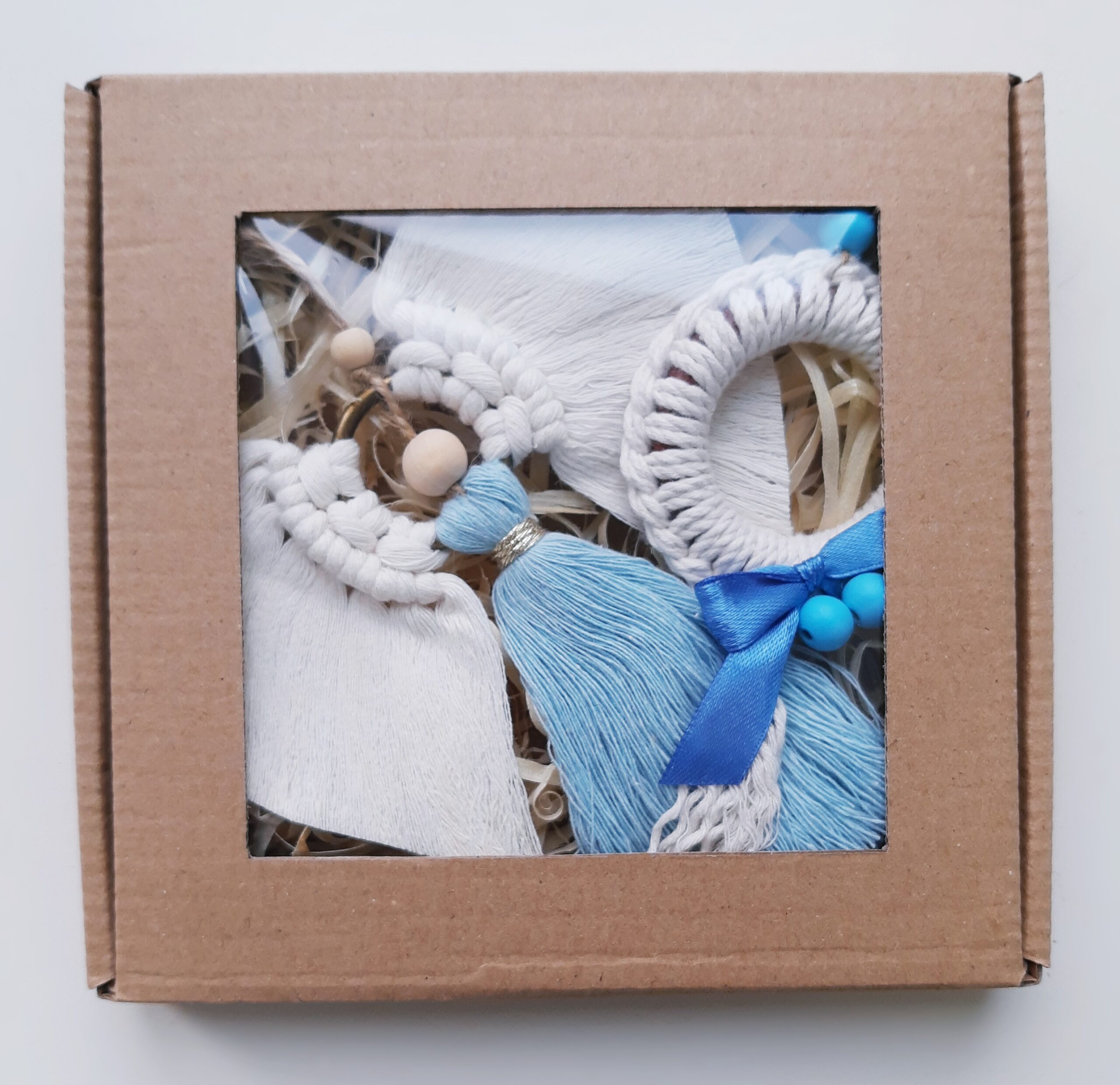 Zestaw zapakowany jest w eko pudełeczko z okienkiem, które przewiązuję papierową raffią z przewieszoną świąteczną etykietką – ozdoby tak zapakowane możesz podarować w prezencie, od razu z informacją dla kogo prezent jest adresowany.