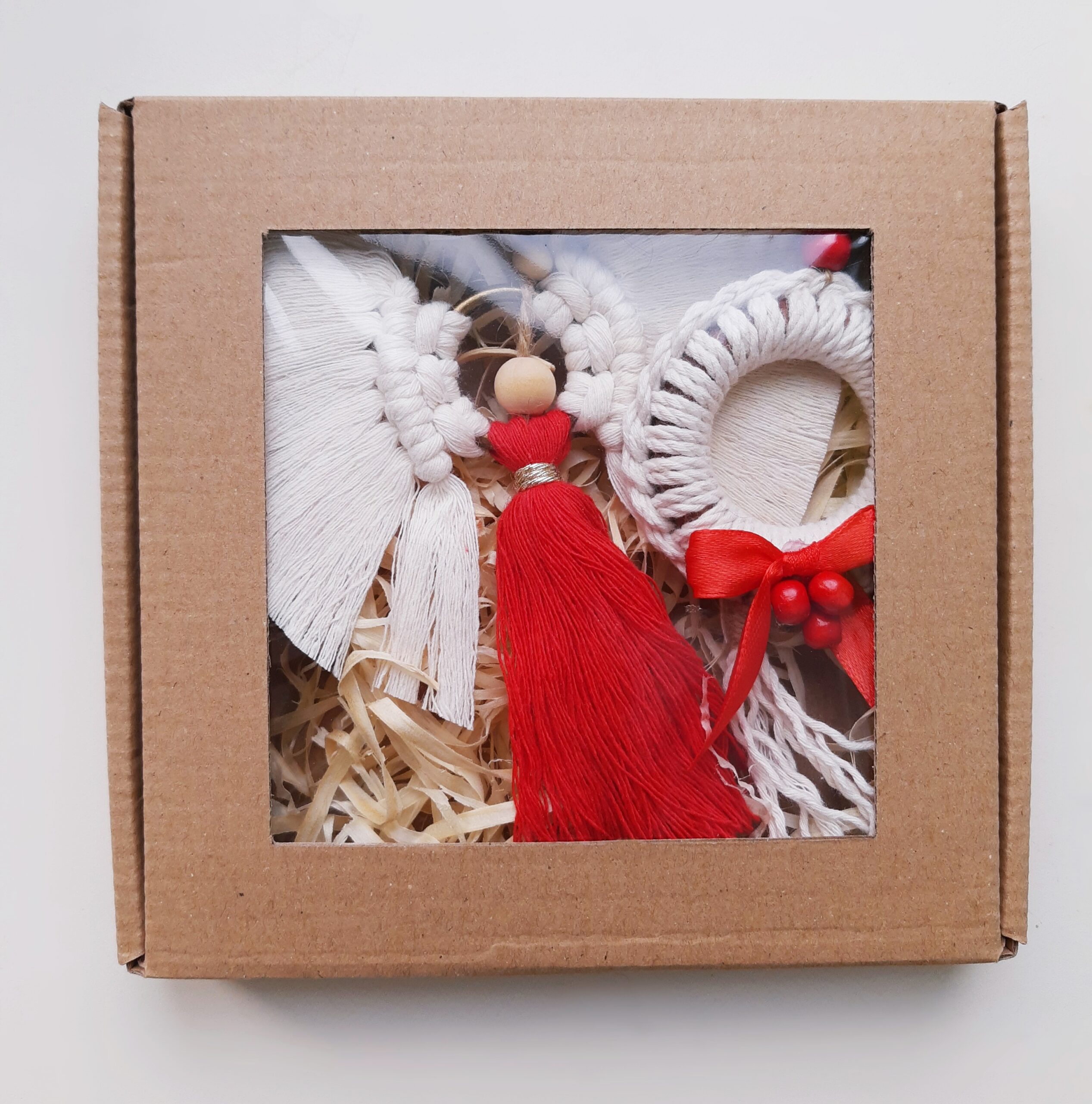 Zestaw zapakowany jest w eko pudełeczko z okienkiem, które przewiązuję papierową raffią z przewieszoną świąteczną etykietką – ozdoby tak zapakowane możesz podarować w prezencie, od razu z informacją dla kogo prezent jest adresowany.