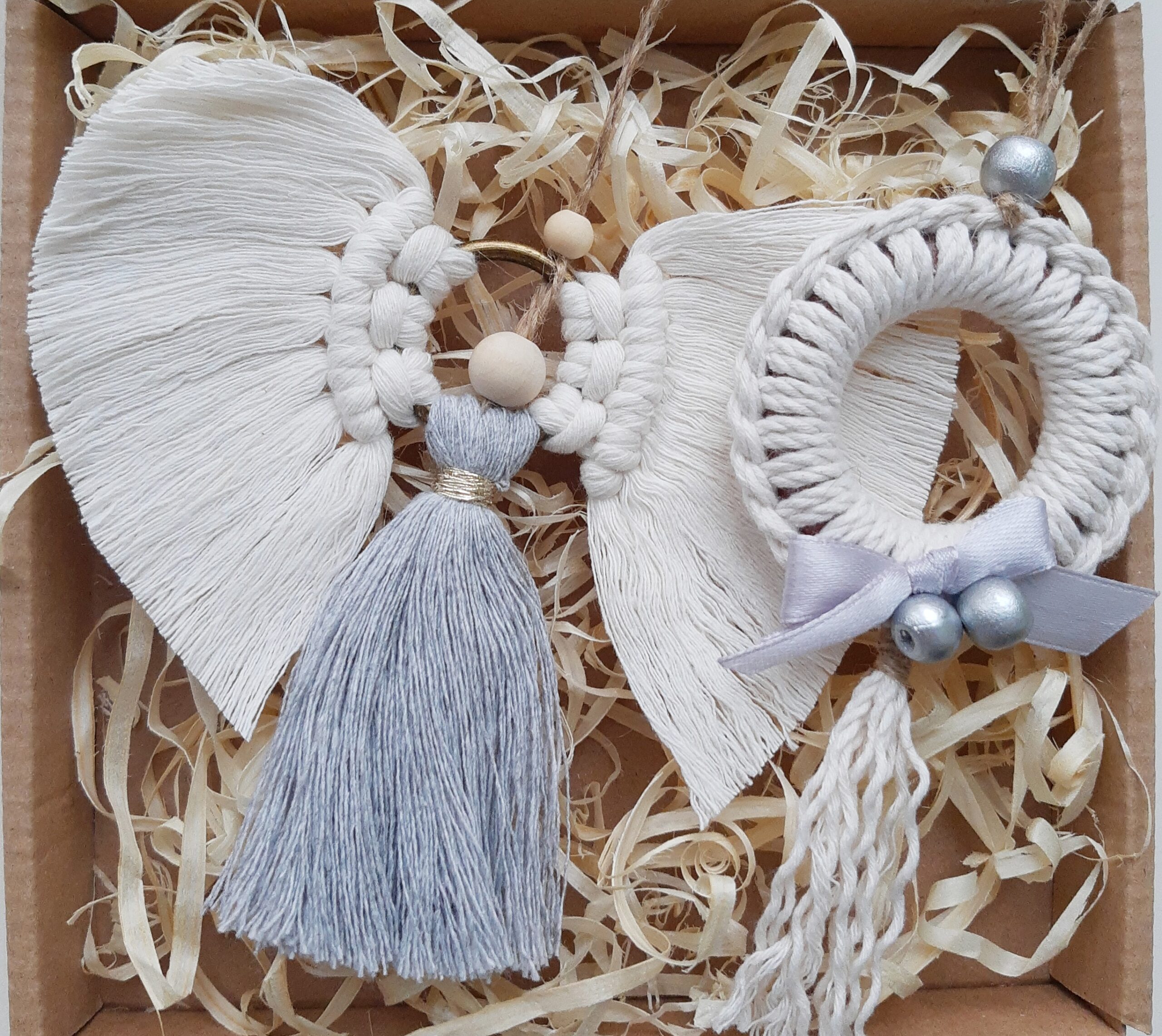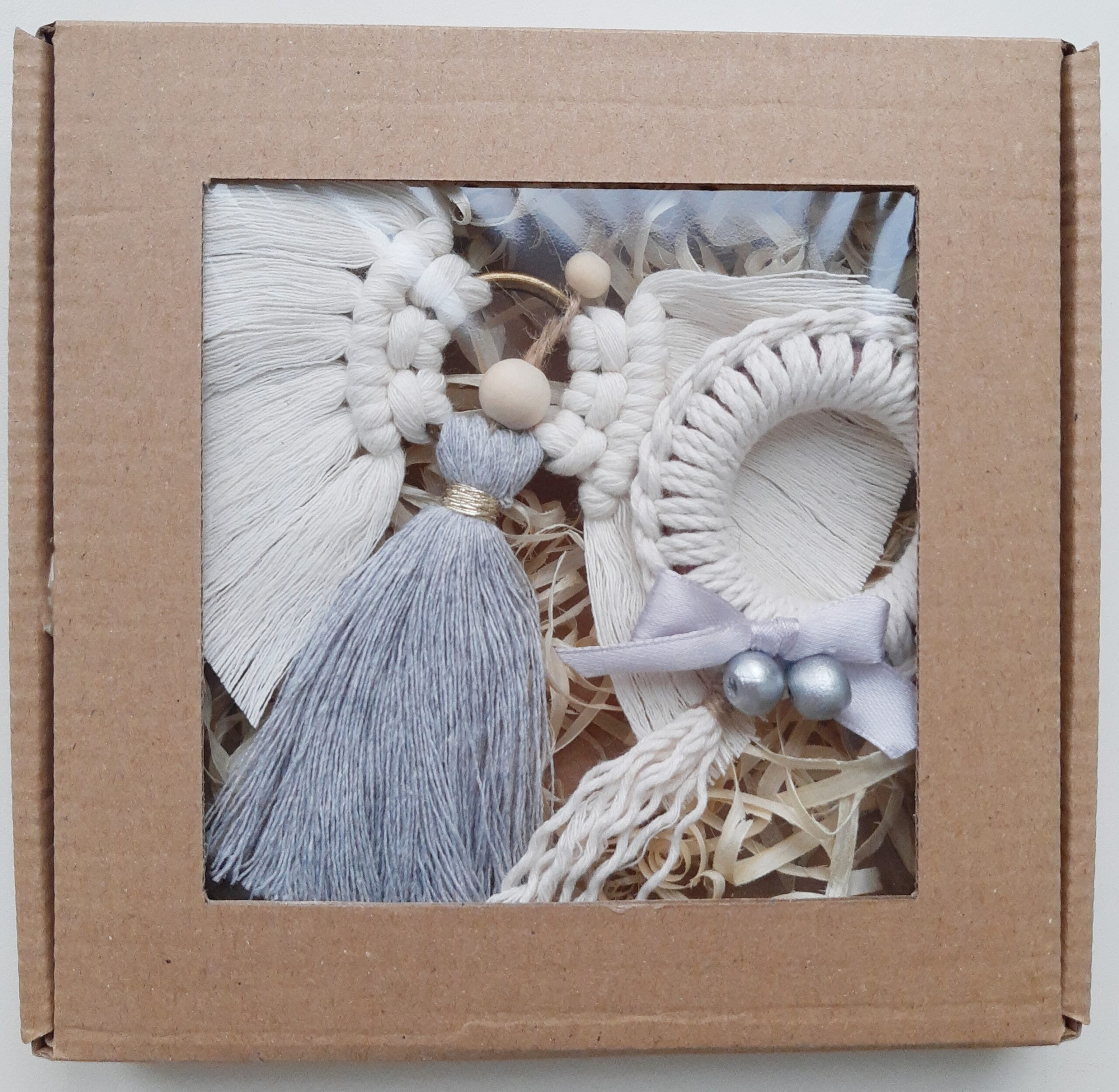Zestaw zapakowany jest w eko pudełeczko z okienkiem, które przewiązuję papierową raffią z przewieszoną świąteczną etykietką – ozdoby tak zapakowane możesz podarować w prezencie, od razu z informacją dla kogo prezent jest adresowany.