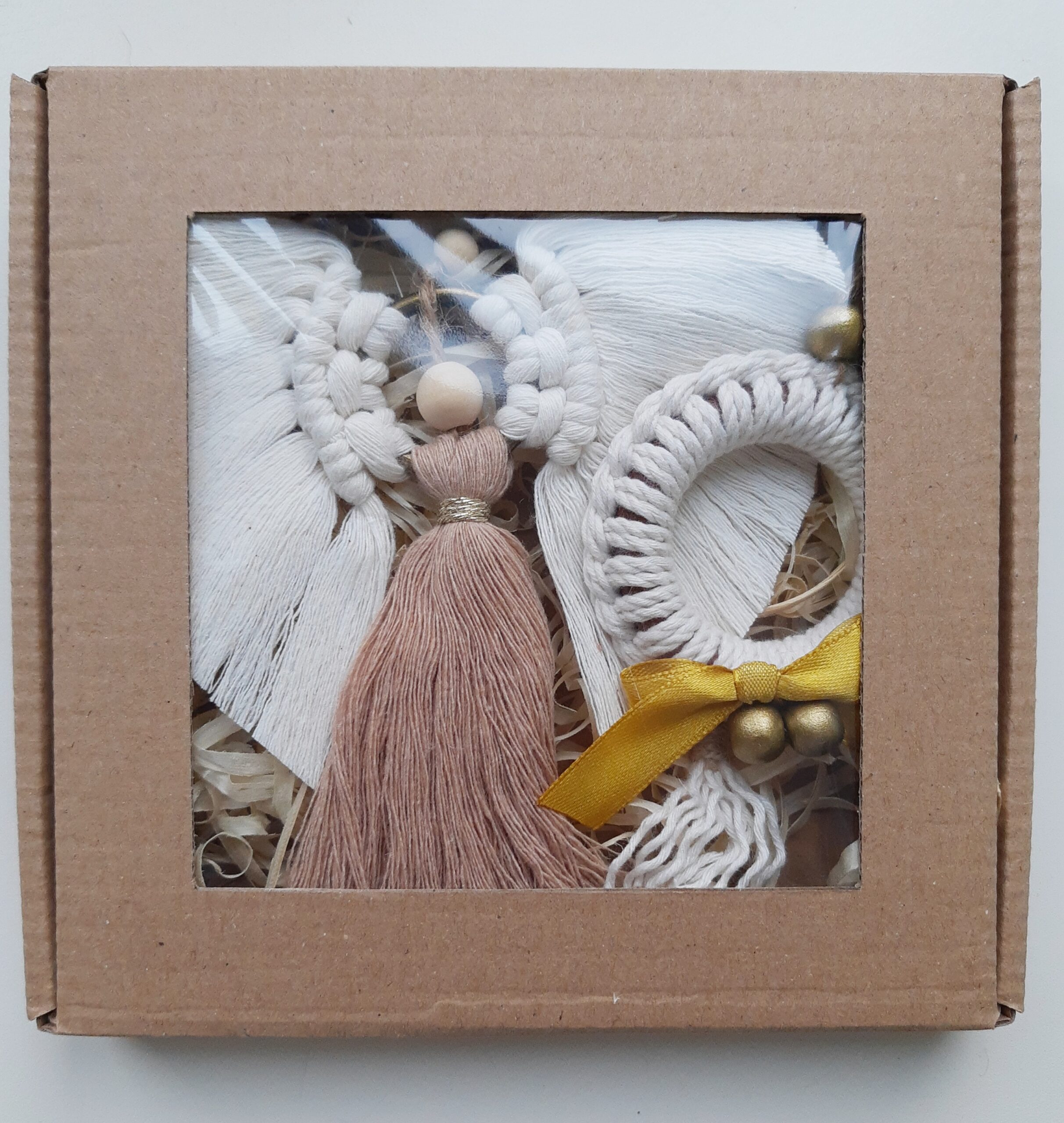 Zestaw zapakowany jest w eko pudełeczko z okienkiem, które przewiązuję papierową raffią z przewieszoną świąteczną etykietką – ozdoby tak zapakowane możesz podarować w prezencie, od razu z informacją dla kogo prezent jest adresowany.