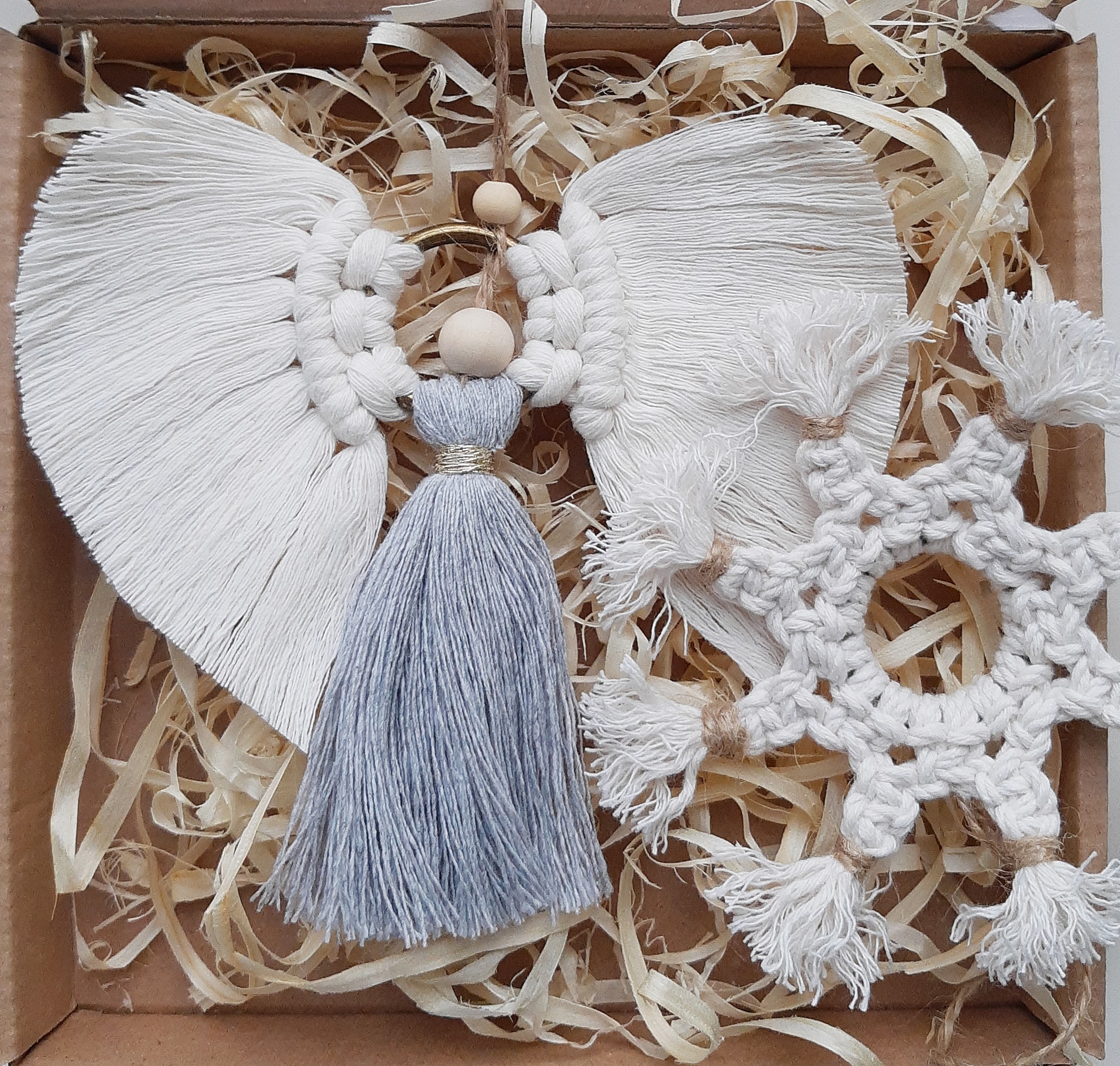 Wymiary: – aniołek – wysokość: około 14 cm (z zawieszką 16-17 cm), szerokość: 11,5-12 cm; śnieżynka: średnica 12 cm (z zawieszką wys. 13,5-14 cm);