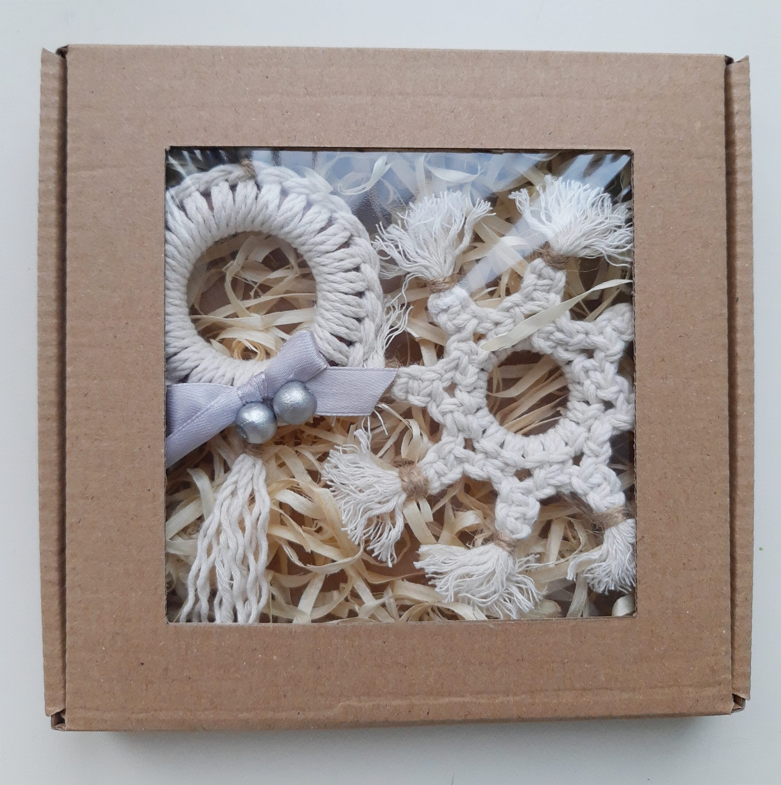 Zestaw zapakowany jest w eko pudełeczko z okienkiem, które przewiązuję papierową raffią z przewieszoną świąteczną etykietką – ozdoby tak zapakowane możesz podarować w prezencie, od razu z informacją dla kogo prezent jest adresowany.
