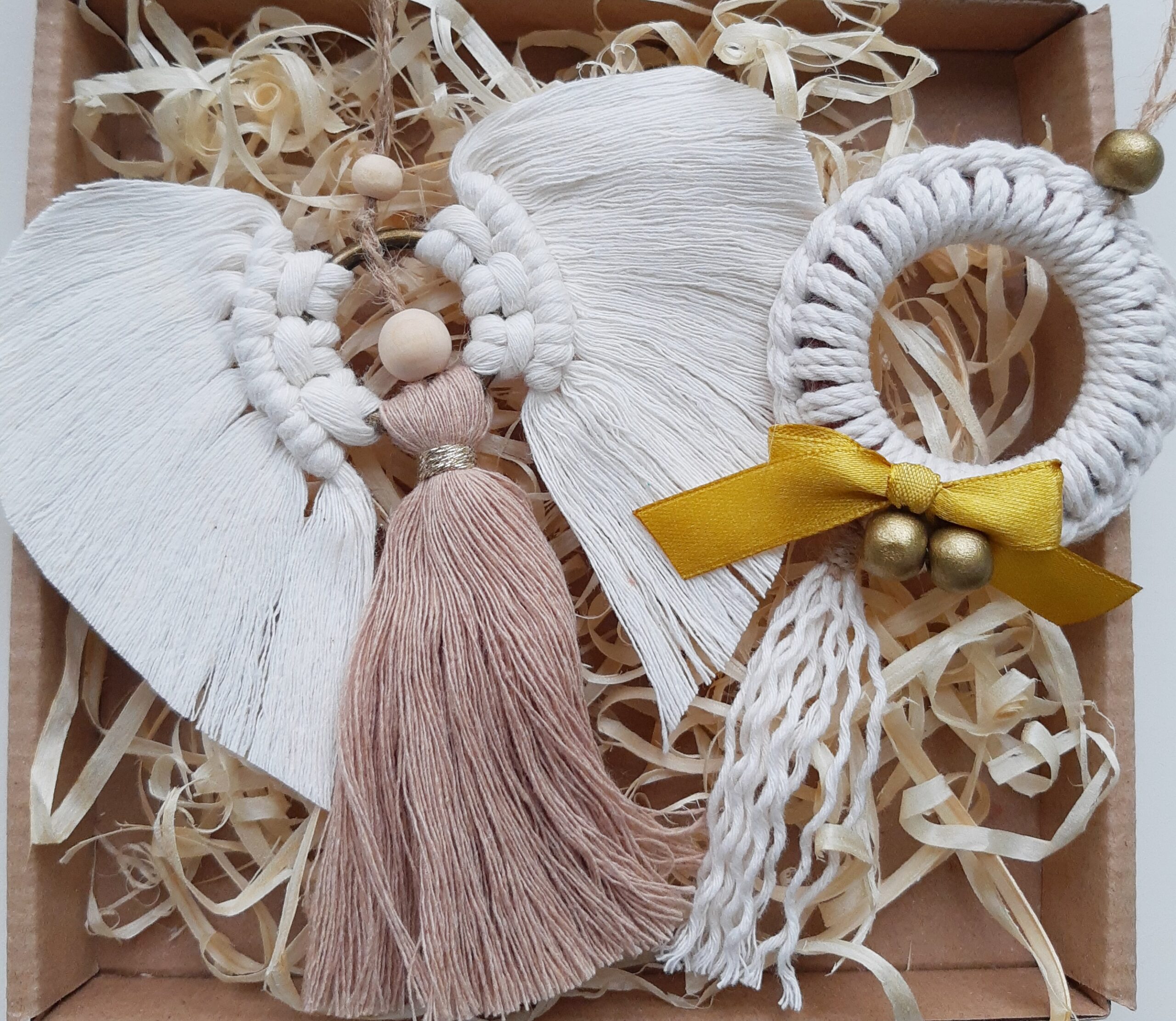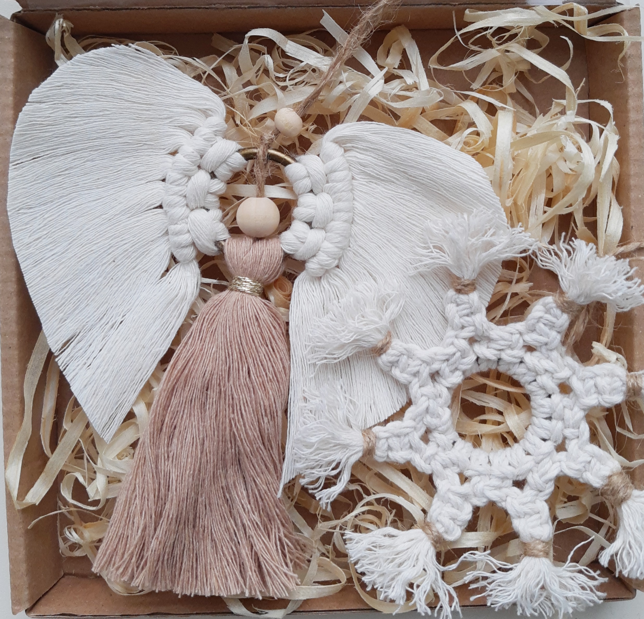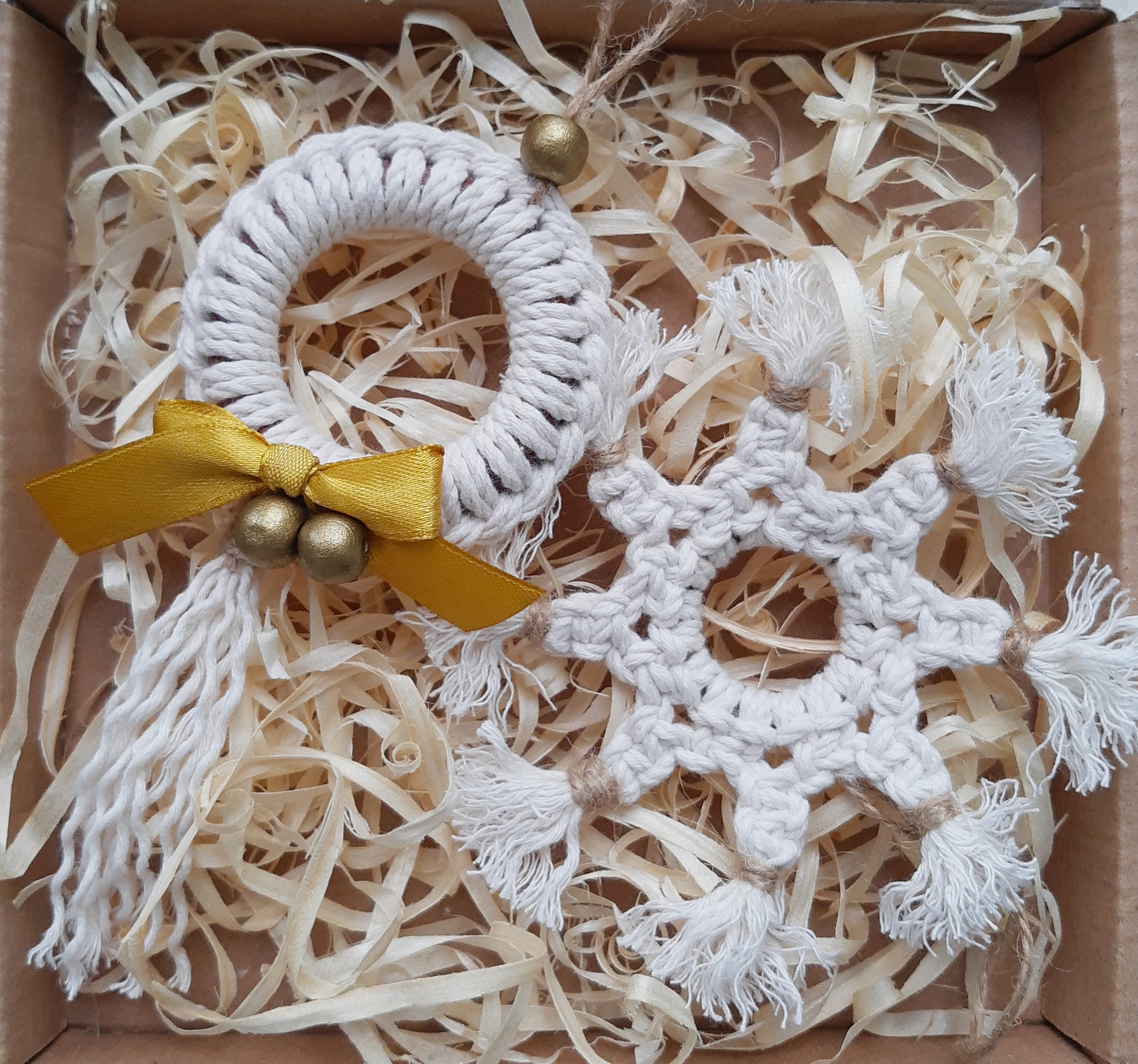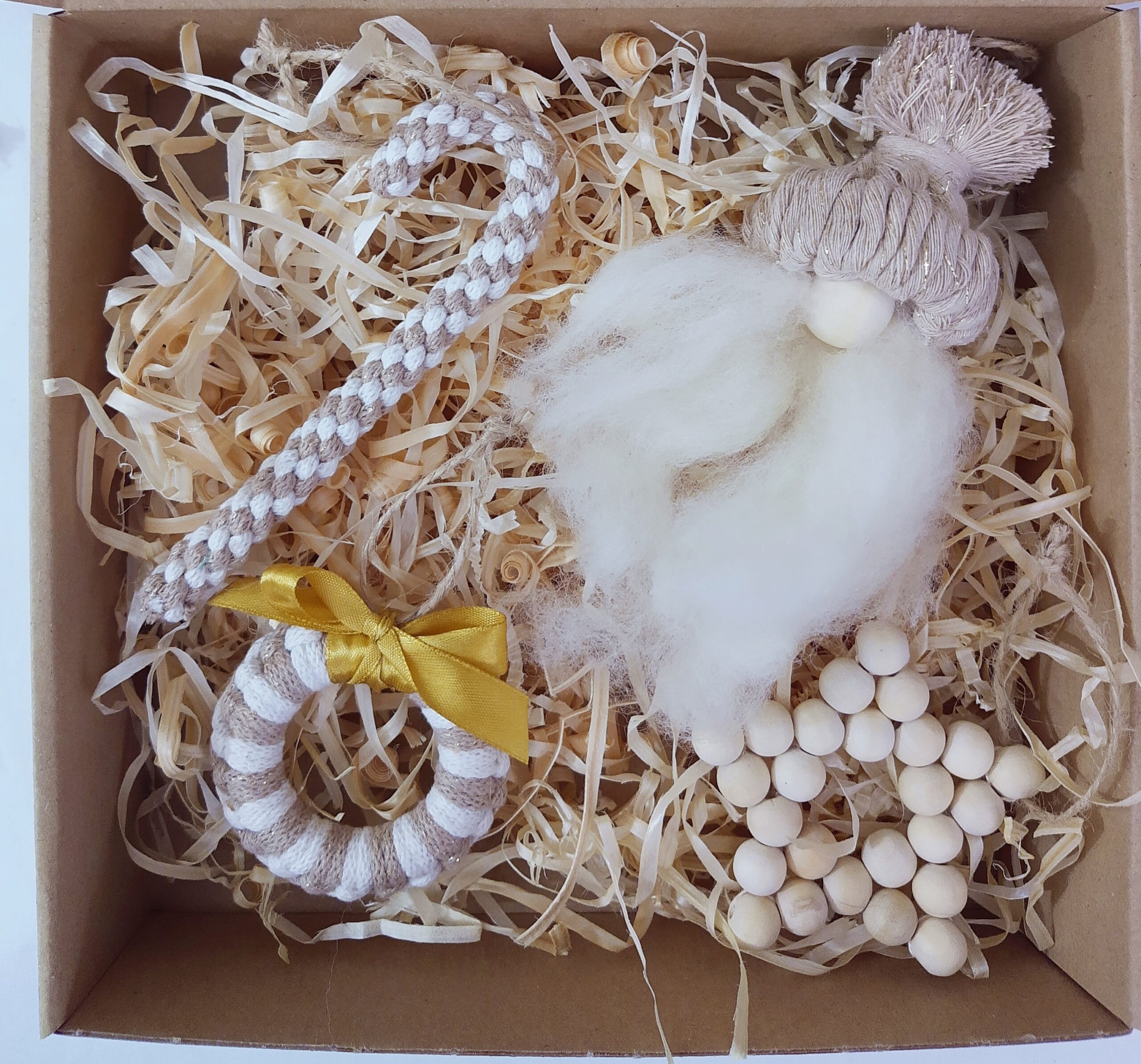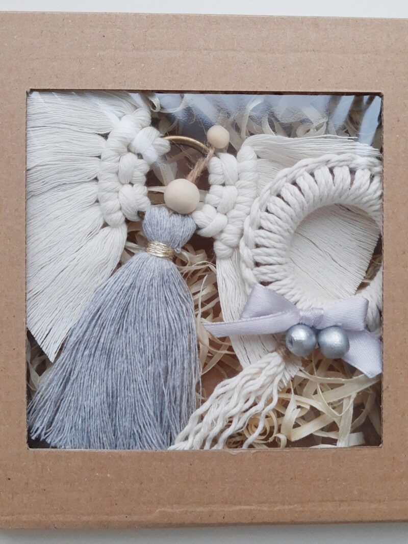 Zestaw zapakowany jest w eko pudełeczko z okienkiem, które przewiązuję papierową raffią z przewieszoną świąteczną etykietką – ozdoby tak zapakowane możesz podarować w prezencie, od razu z informacją dla kogo prezent jest adresowany.