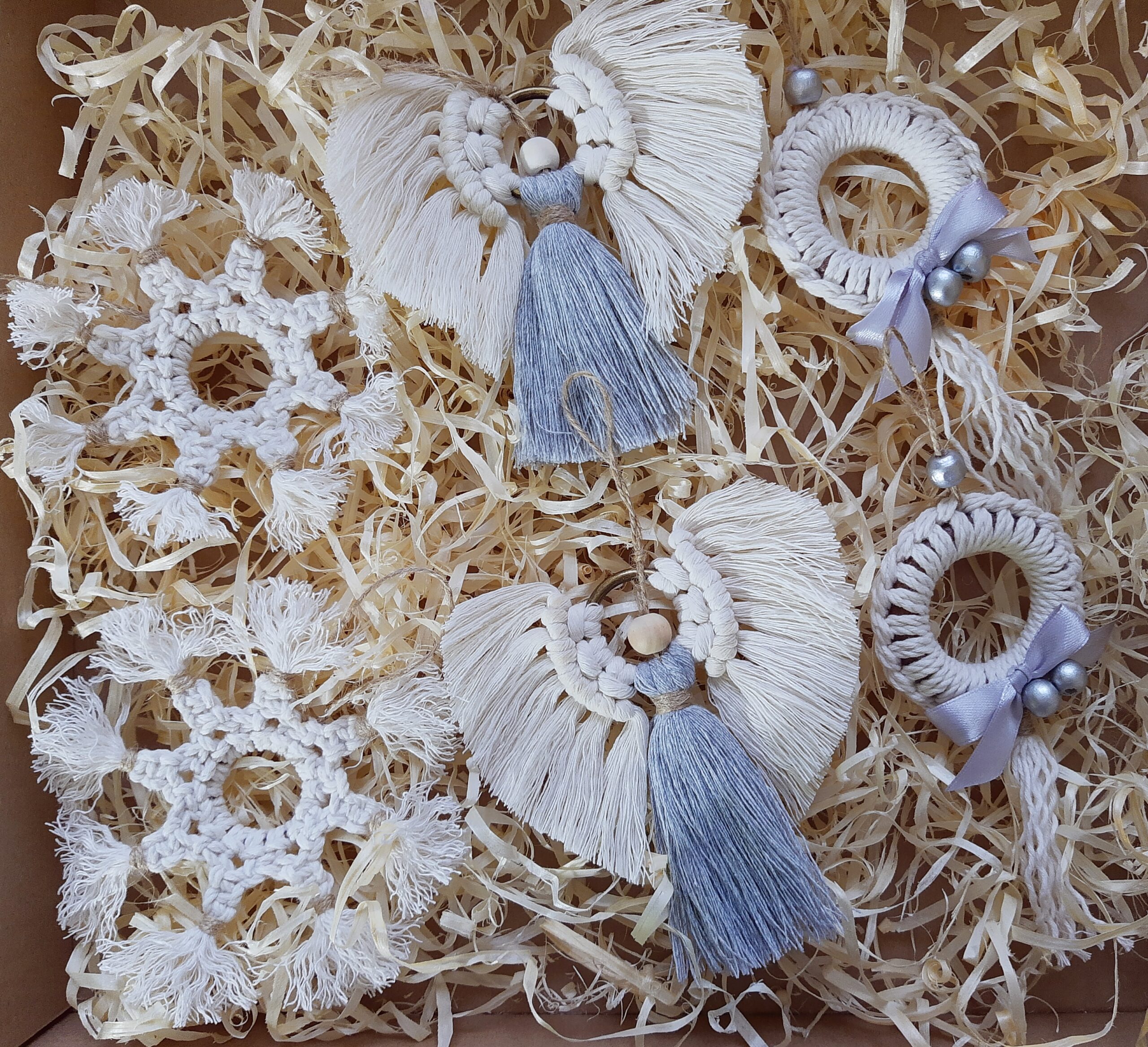 Zestaw ozdób wykonałam ręcznie przy użyciu w większości naturalnych materiałów – głównie bawełny a także drewnianych elementów. Stworzyłam je z myślą o osobach, którym bliskie są delikatne, naturalne dekoracje, które przywołują wspomnienia choinki u babci, skromnej i pięknej, z ozdobami wykonanymi ręcznie przez nią oraz jej dzieci albo wnuki.