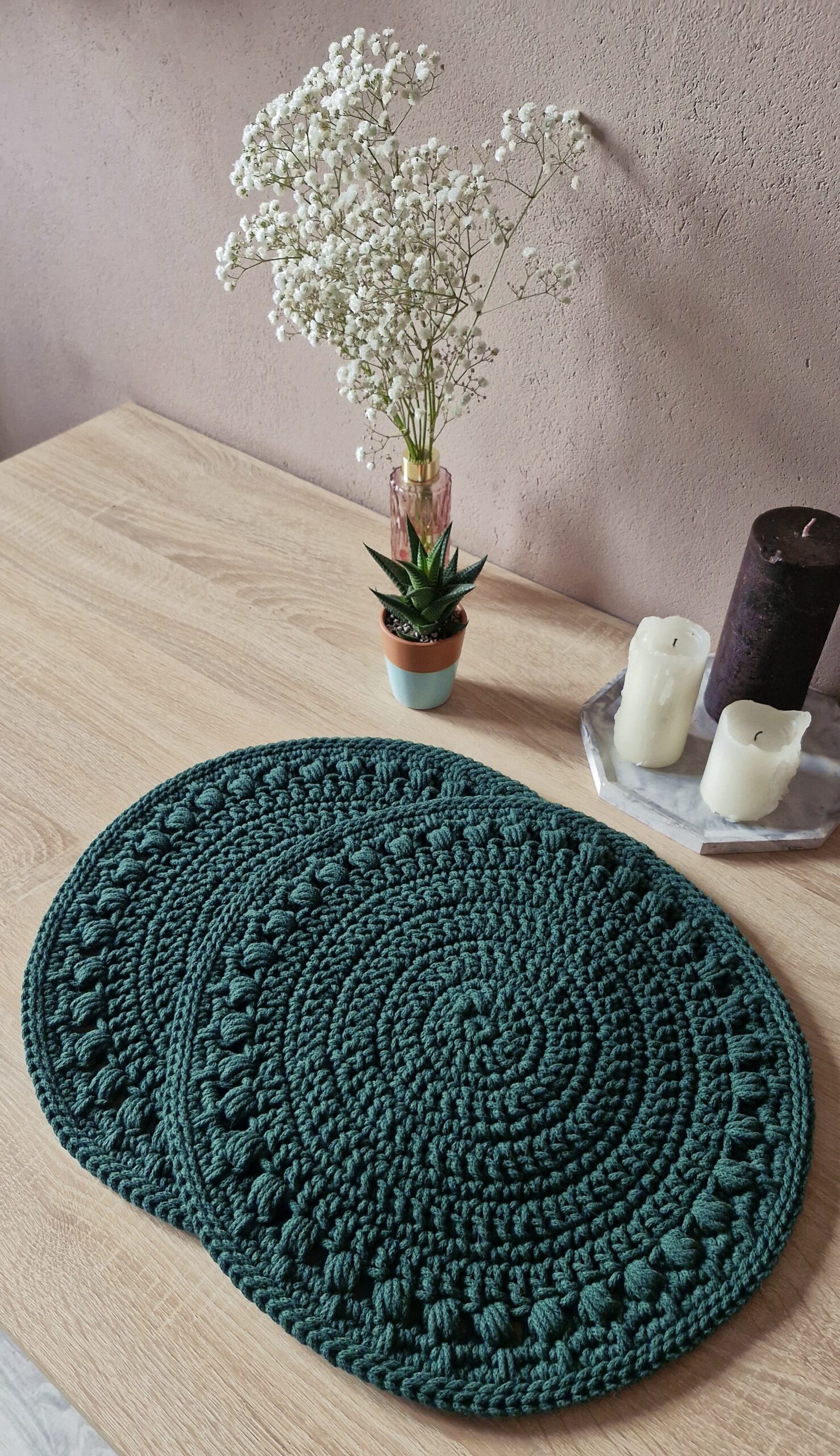 Wykonałam je na szydle ze sznurka bawełnianego 2,5 mm, przez co podkładki są subtelne, nie są przesadnie masywne i nieproporcjonalnie grube.
