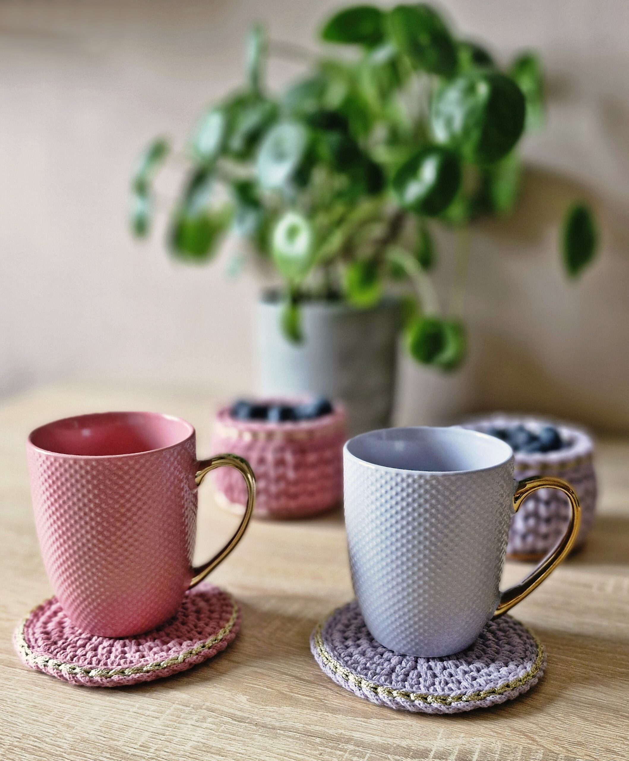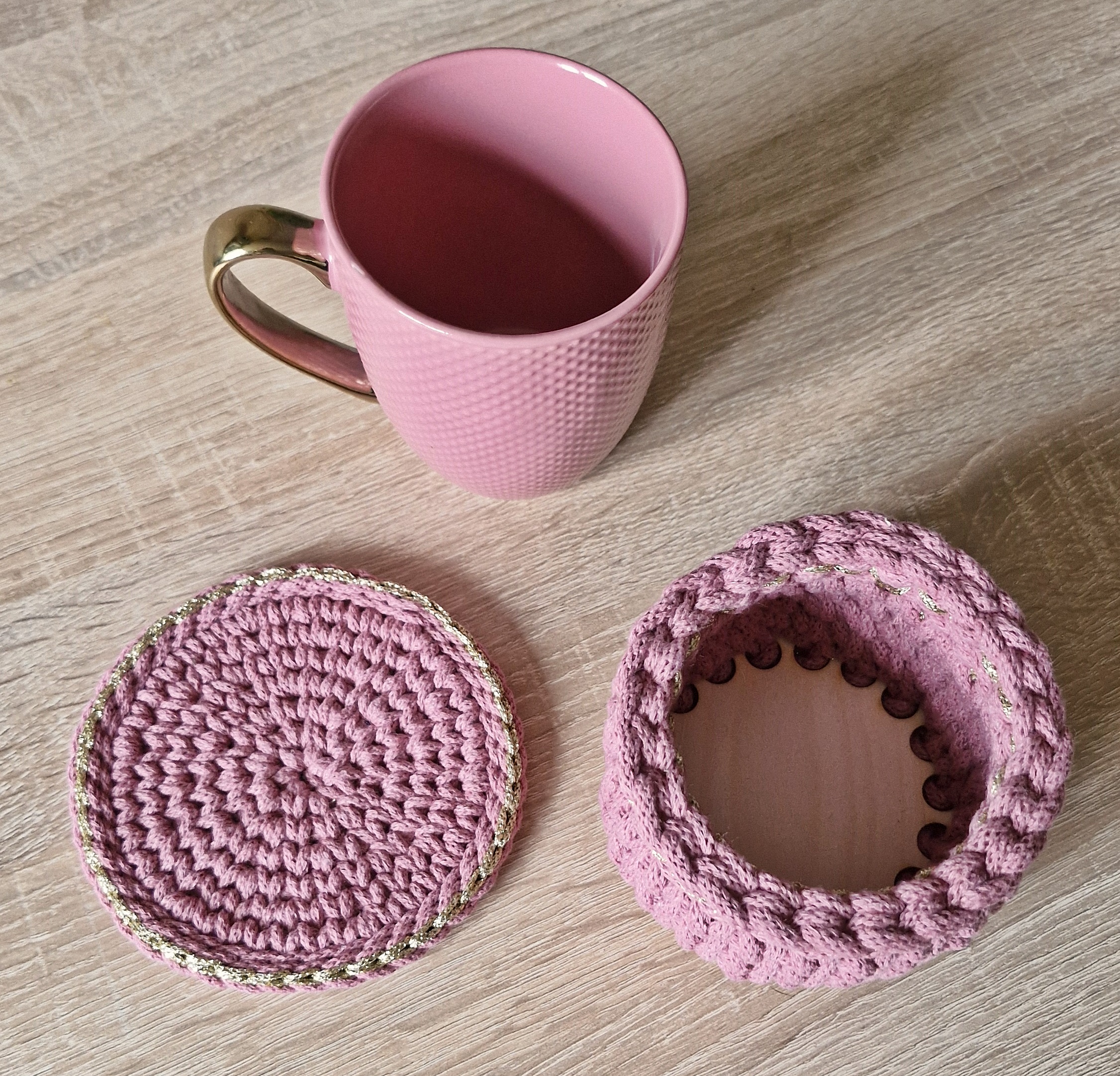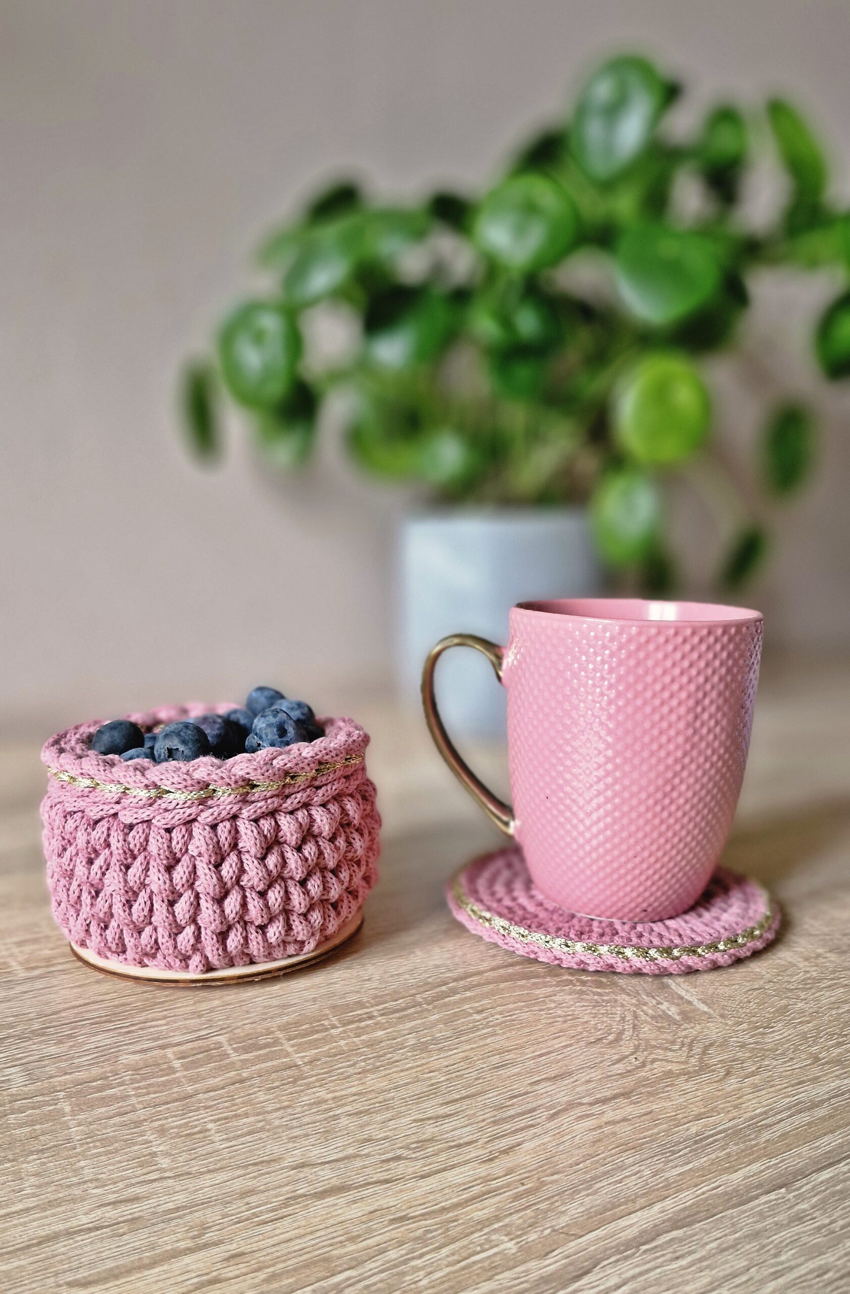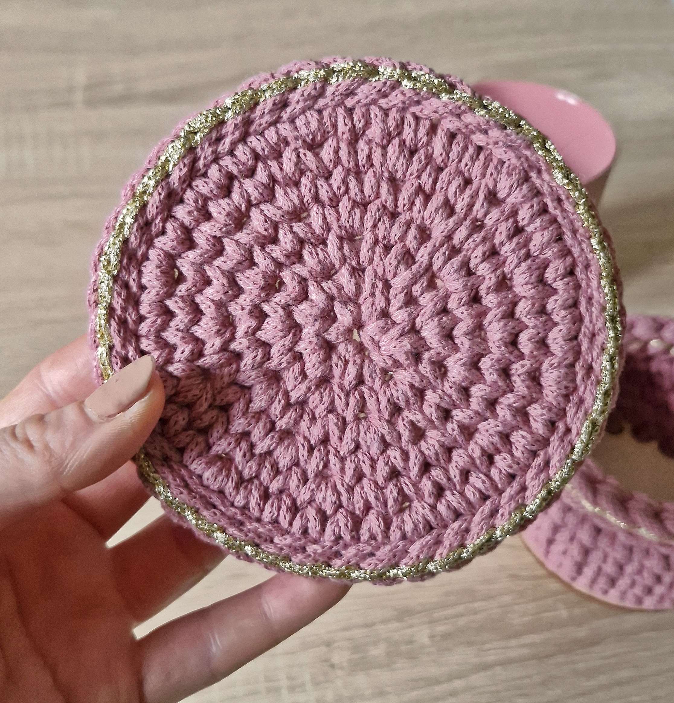 Podkładkę oraz koszyczek na smakołyki wykonałam z bawełny 100% z recyklingu dodatkowo zdobiąc obrzeża pięknie połyskującą, złotą nitką korespondującą z uchem kubka, który jest świetnym uzupełnieniem zestawu.