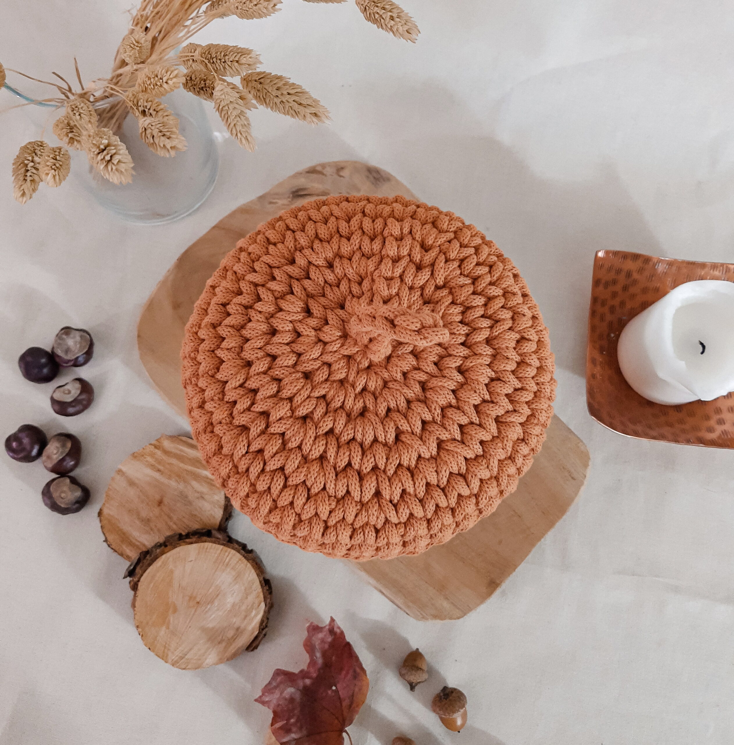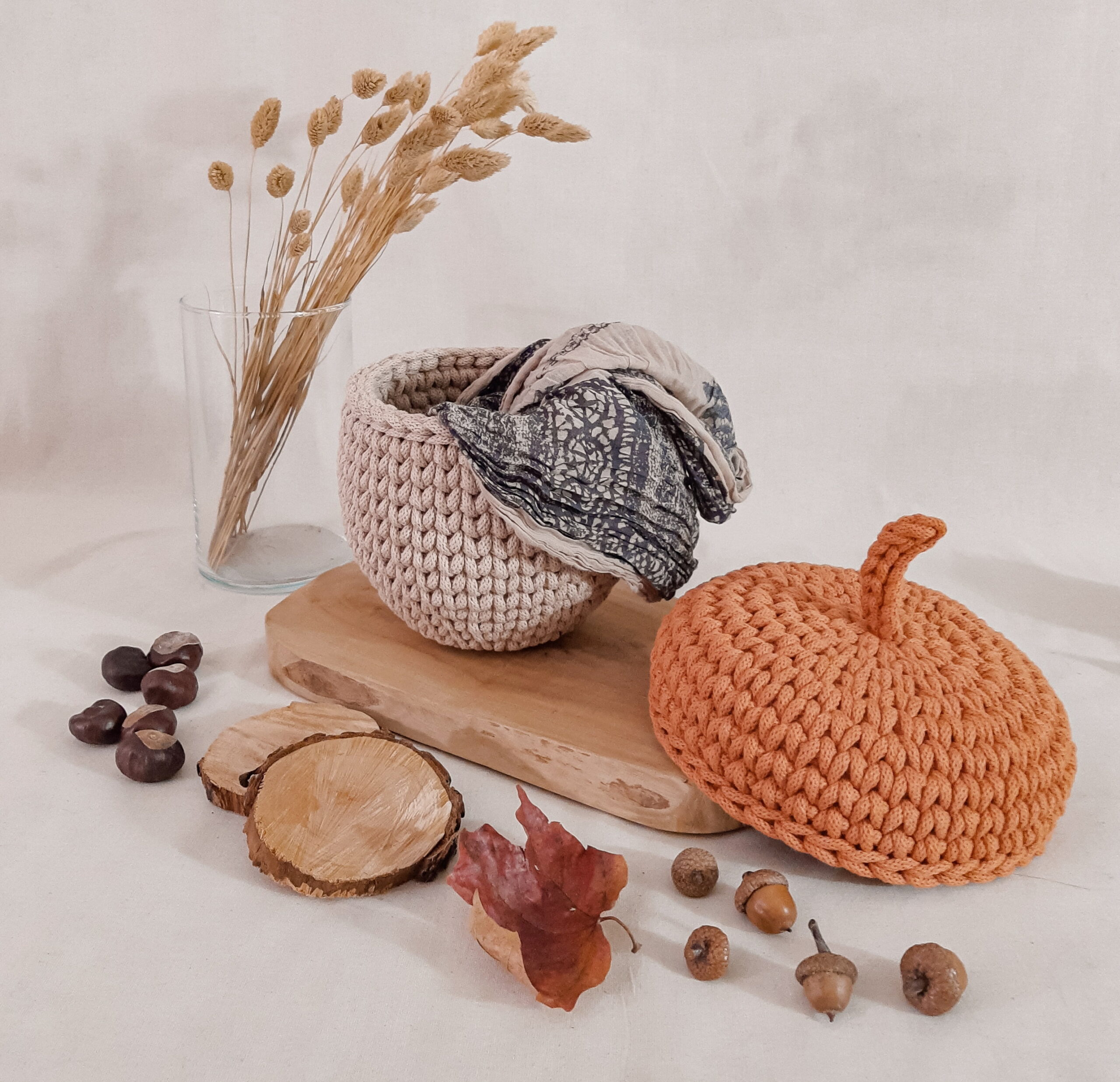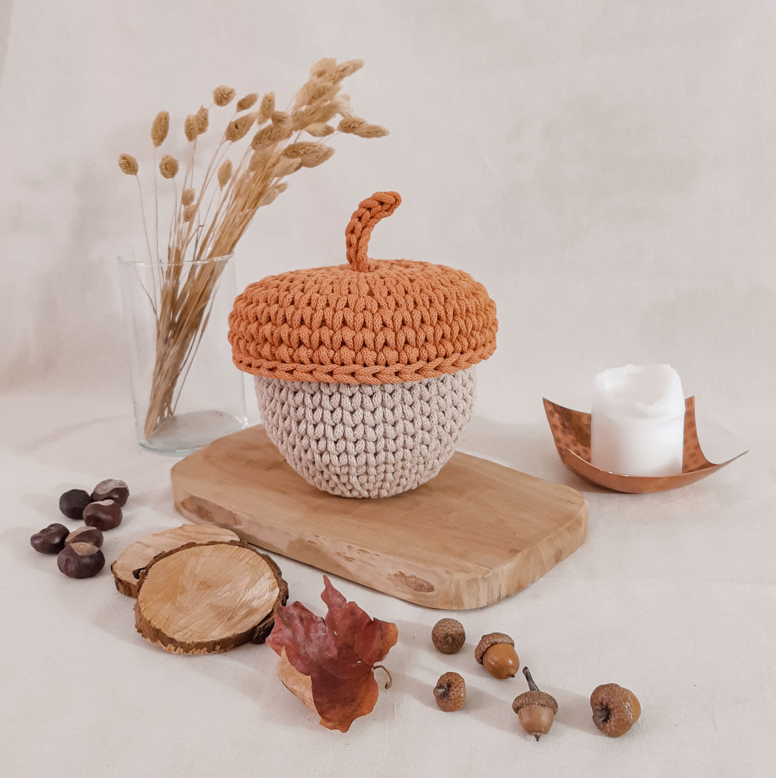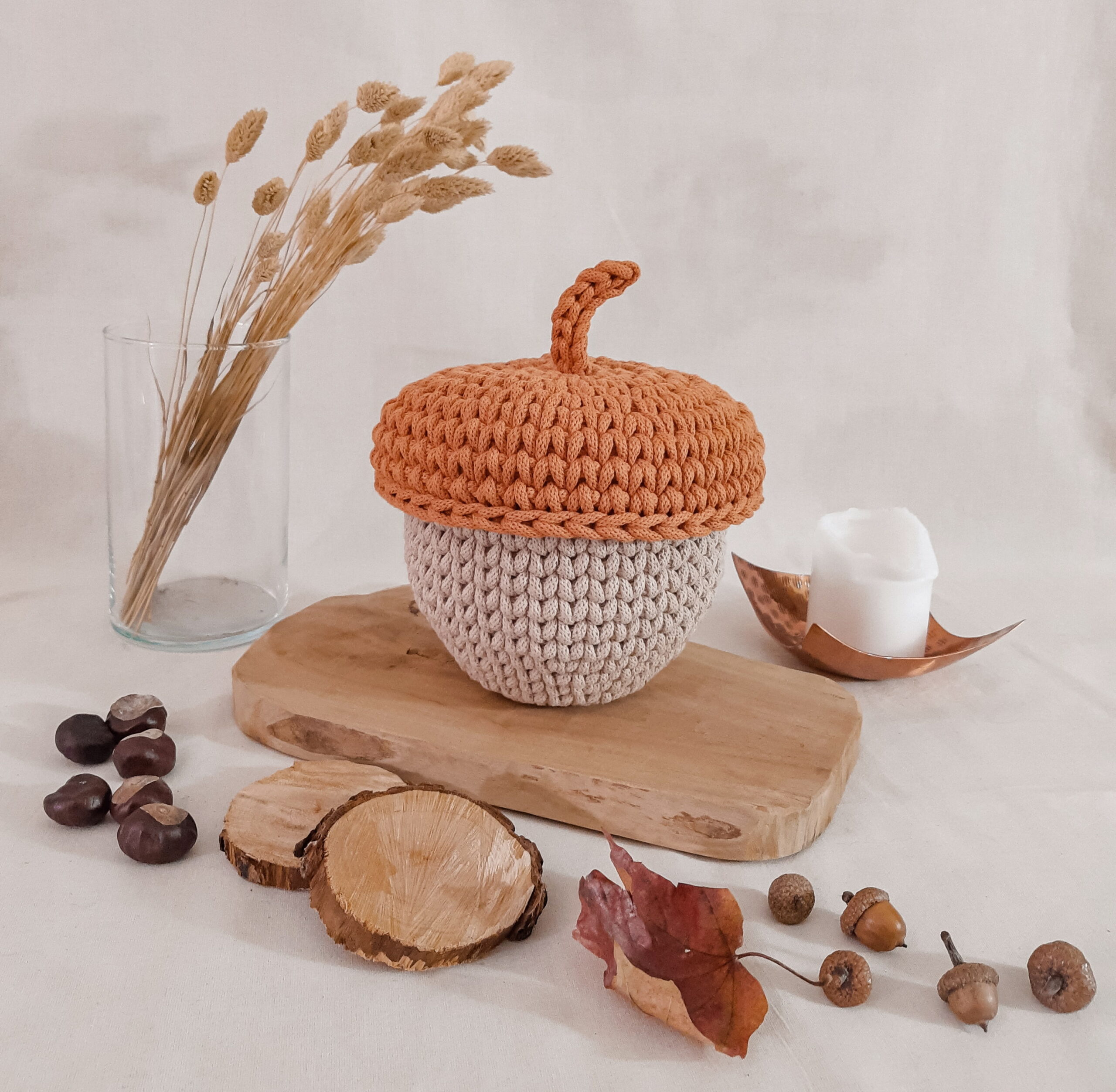 Żołądź – koszyk, dekoracja jesienna – beż/dyniowy