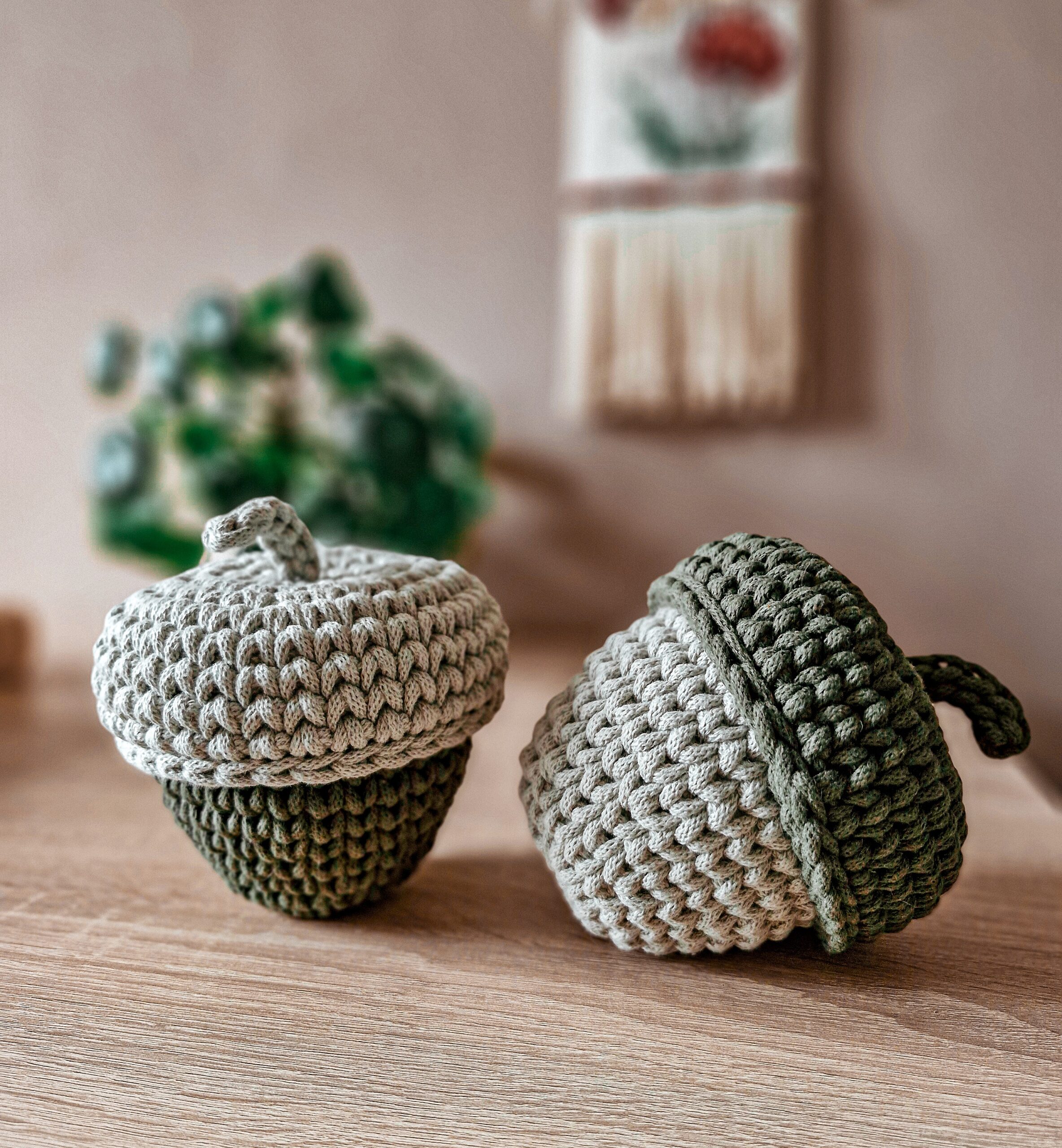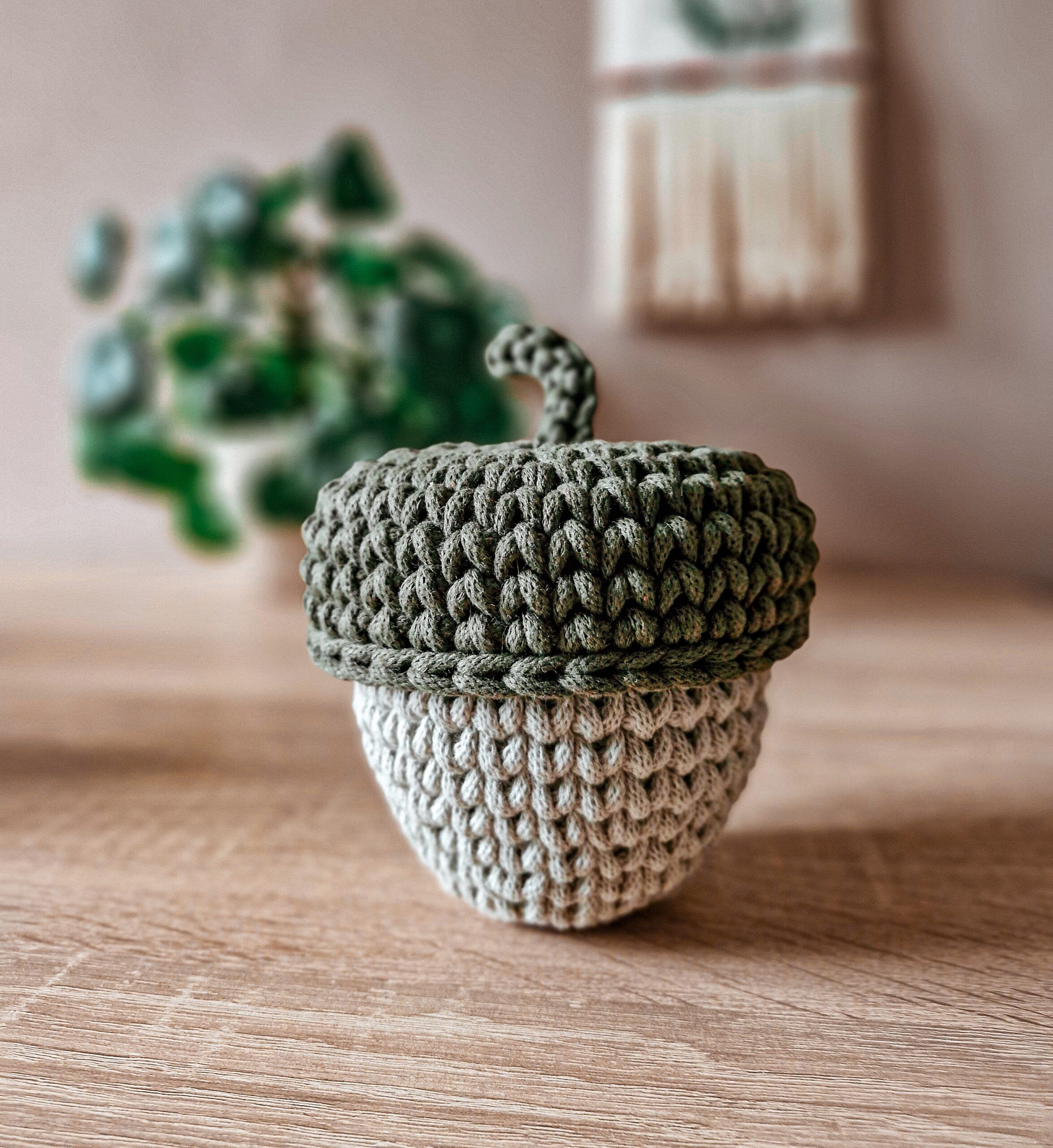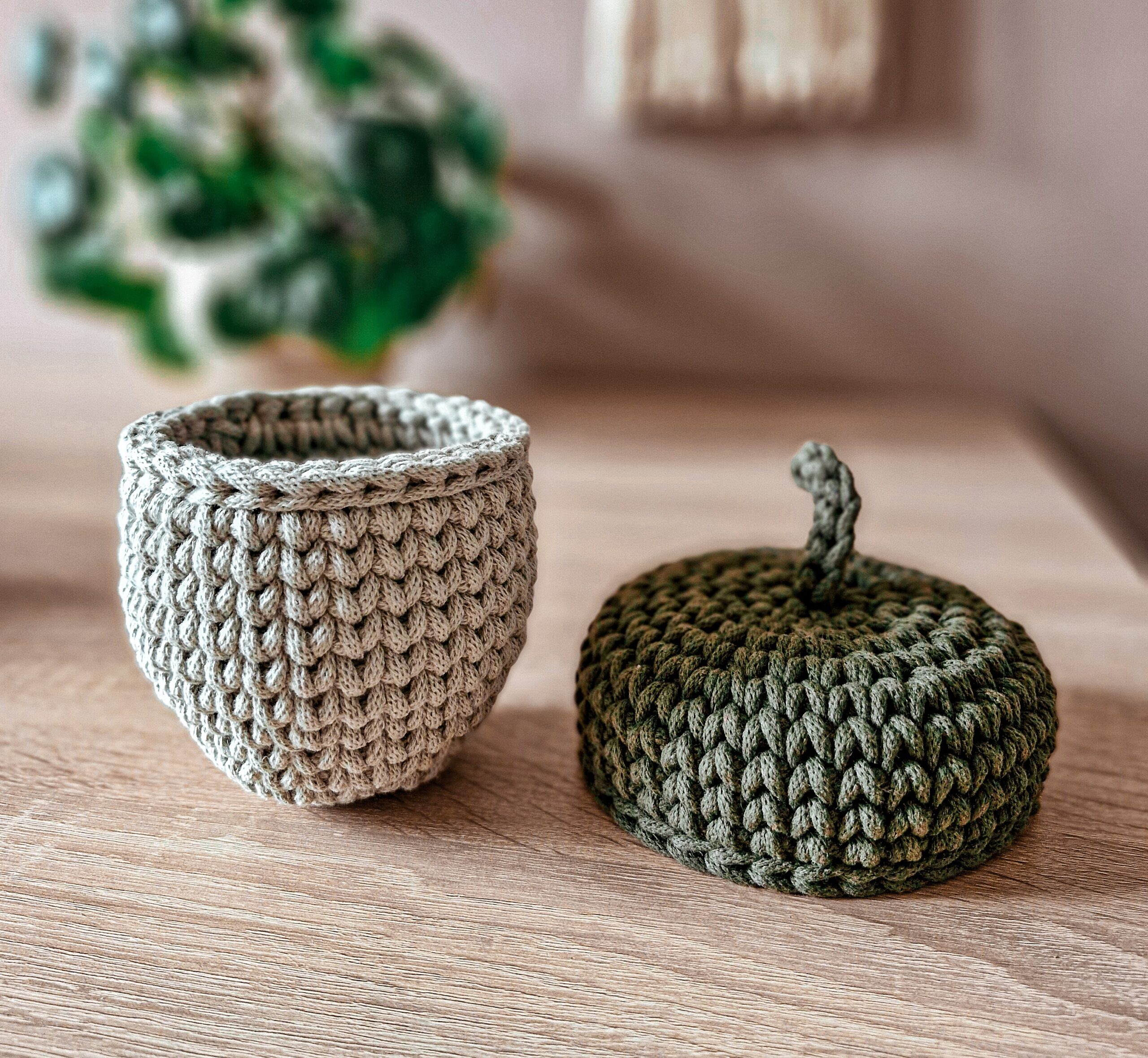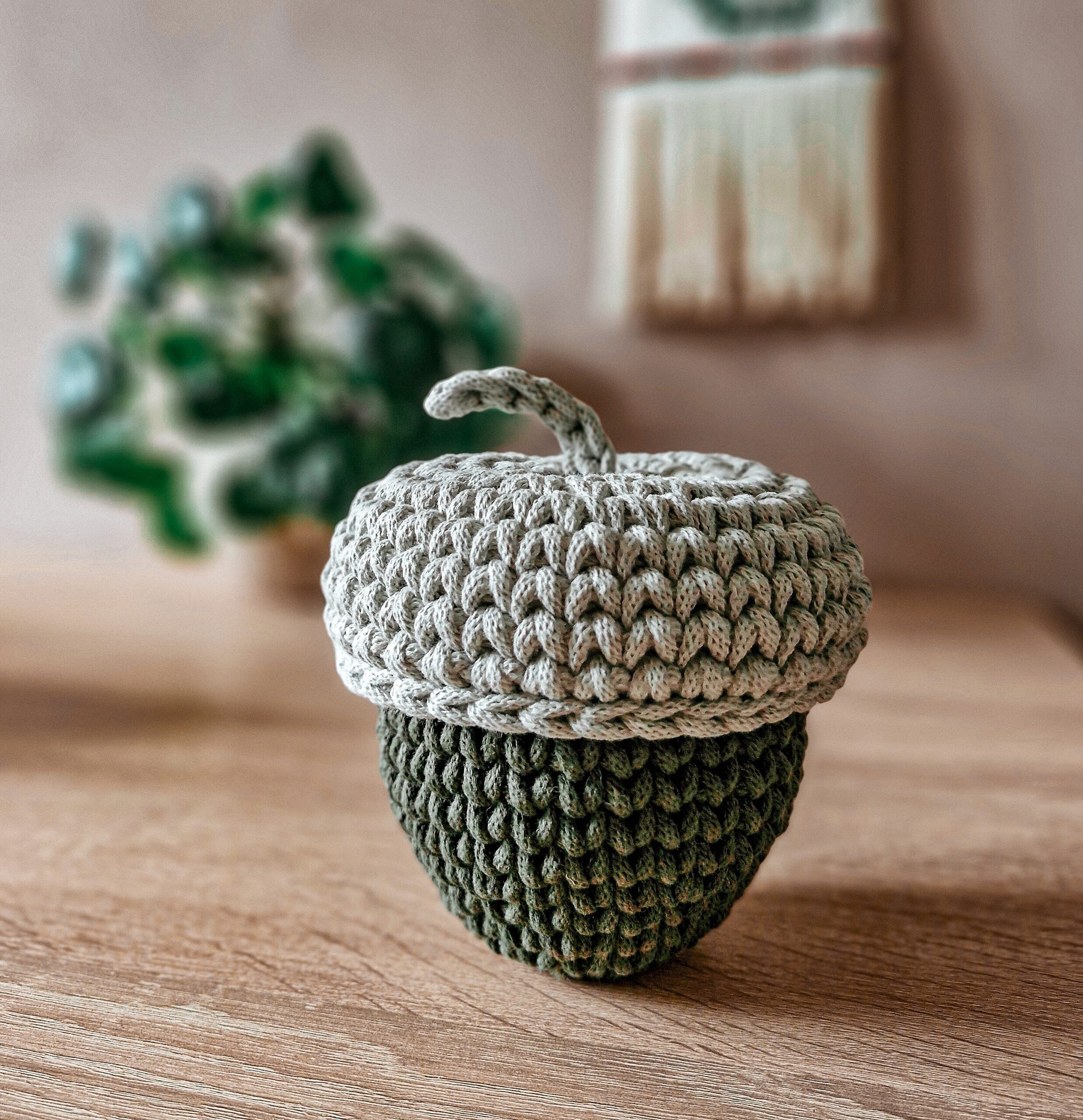 Koszyk – dekoracja jesienna w formie żołędzia świetnie sprawdzi się zarówno w pokoju dziecięcym jak i w przedpokoju jako schowek na drobiazgi. Wieczko koszyka przypomina żołędziową czapeczkę z ogonkiem, który ułatwia jego otwieranie.
